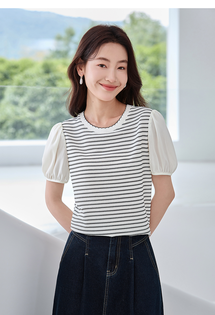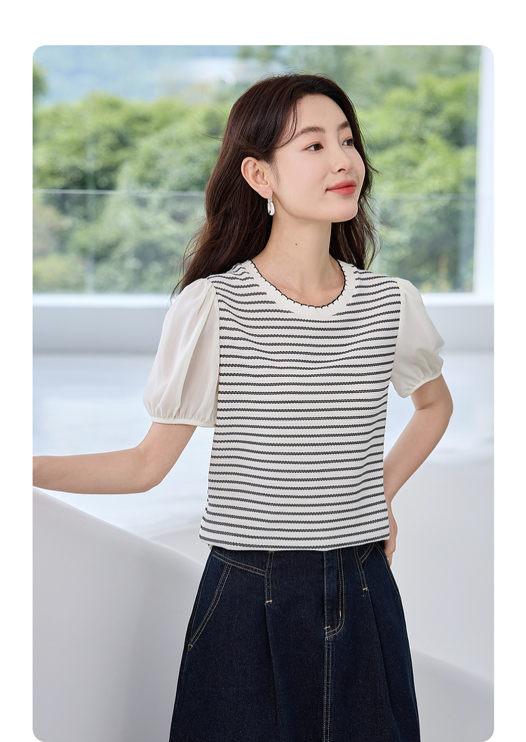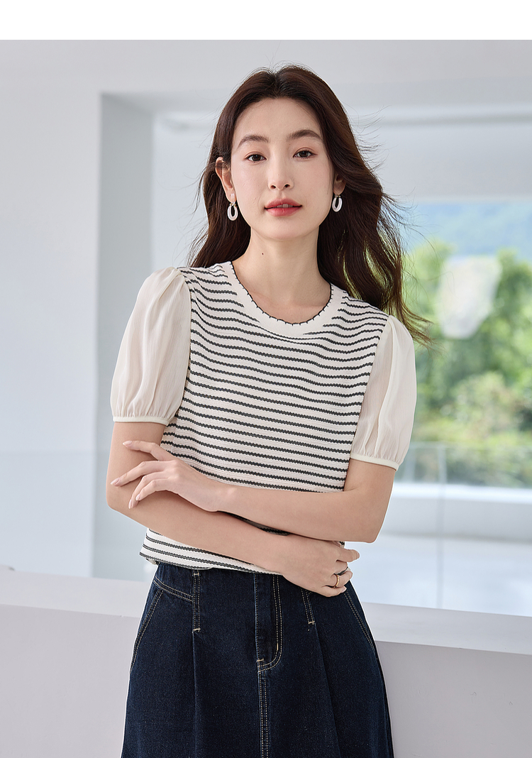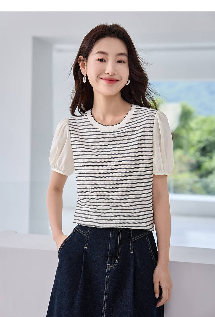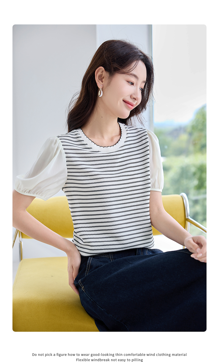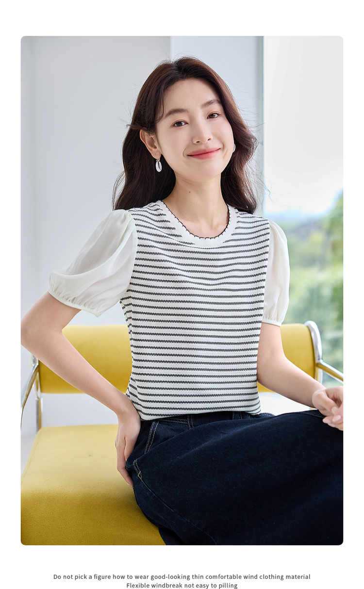 【专属特价】熙世界法式复古条纹针织T恤短袖夏新款宽松显瘦泡泡袖圆领上衣