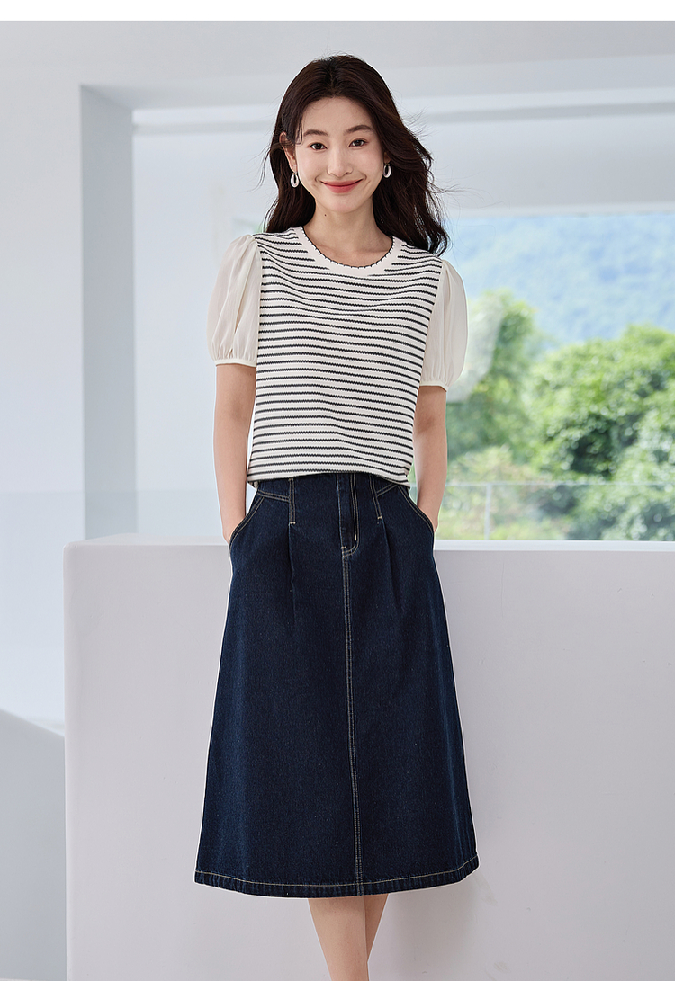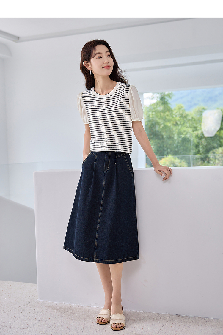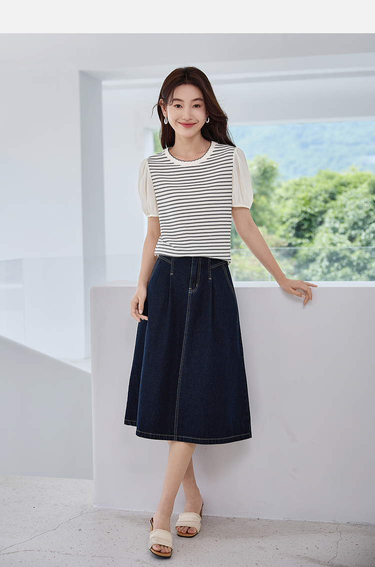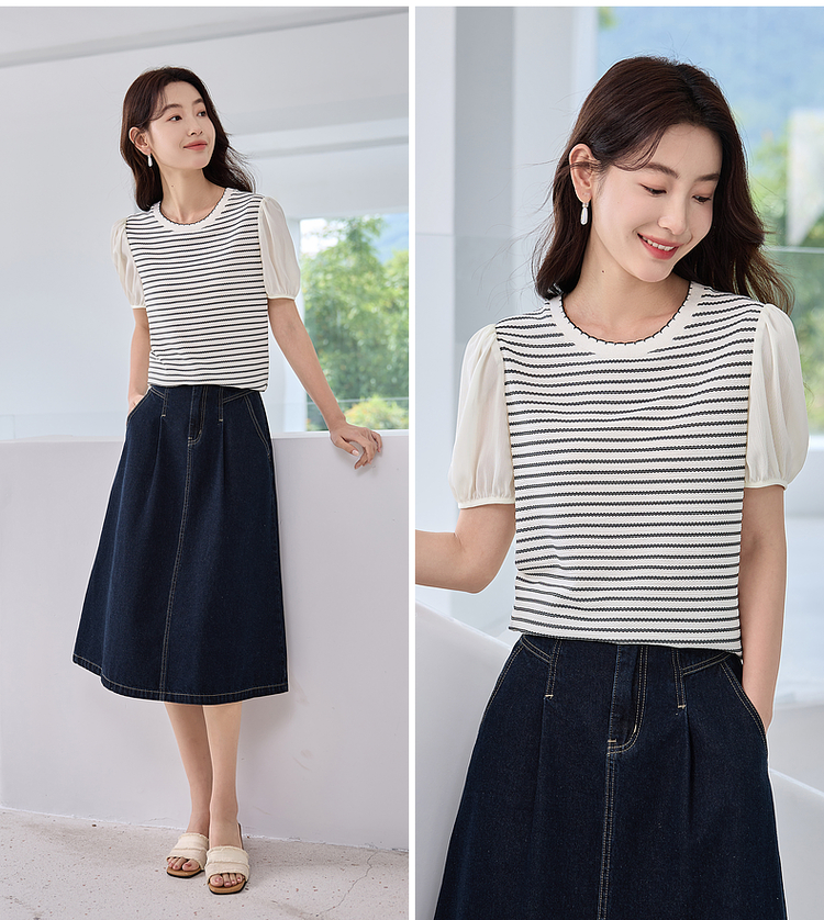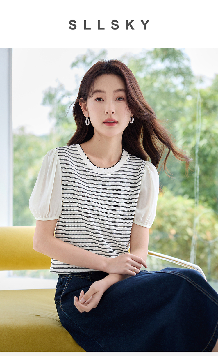 【专属特价】熙世界法式复古条纹针织T恤短袖夏新款宽松显瘦泡泡袖圆领上衣