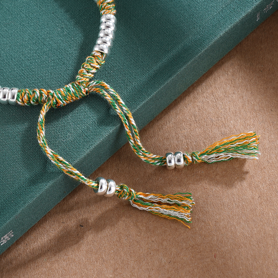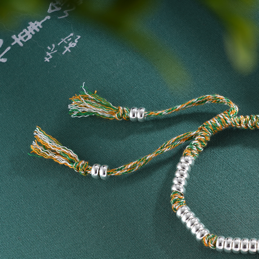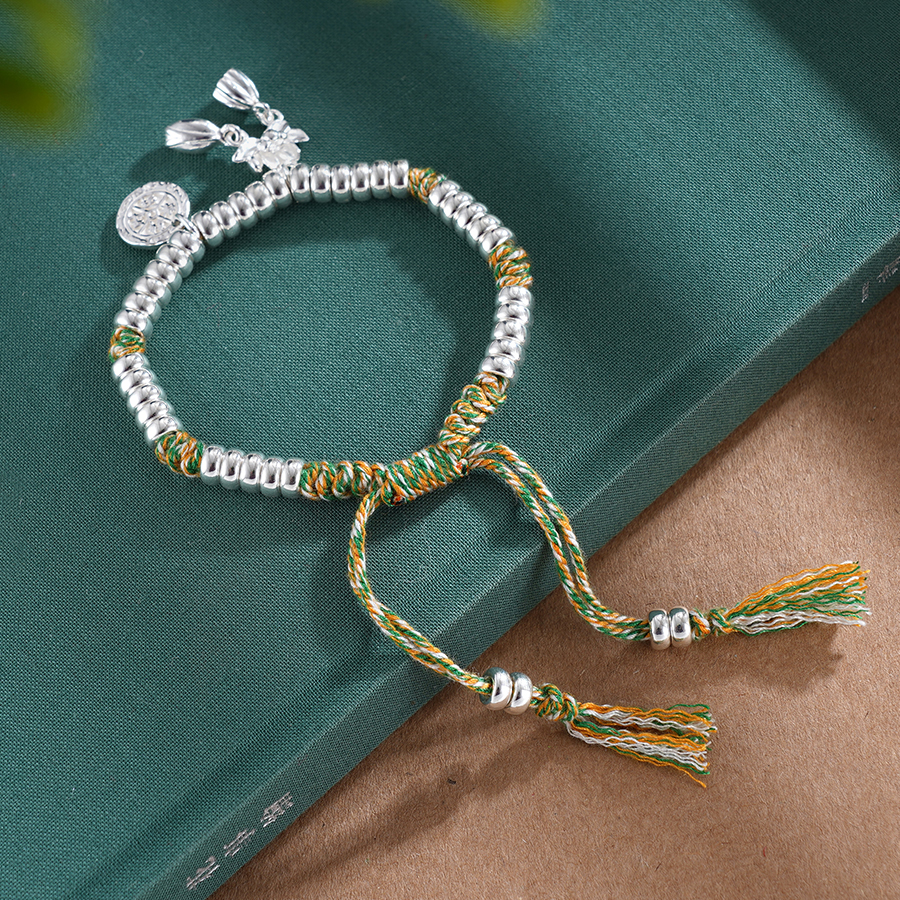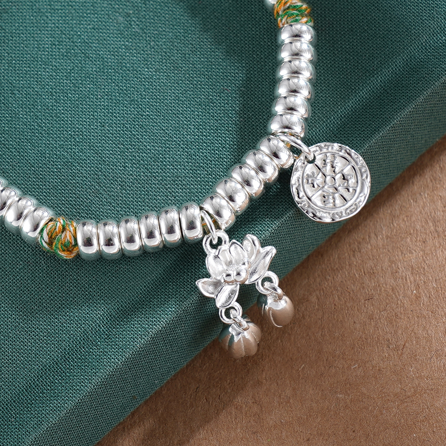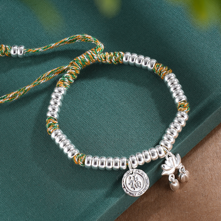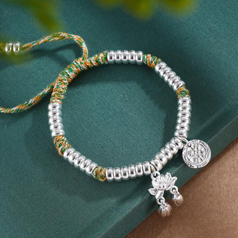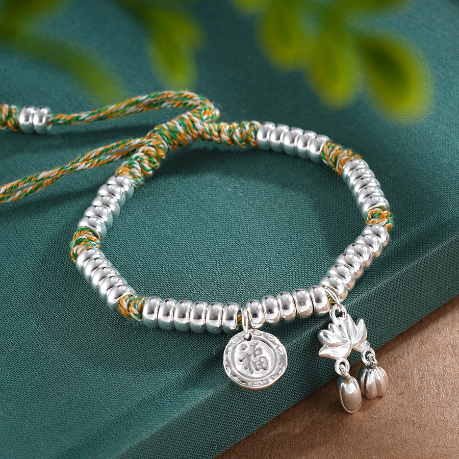 【寓意】:纯银盘缠手串,搭配黄绿色编织手绳,与点缀其间的荷花小坠饰相映成趣。仿若将荷花轻拈于手,清风徐来,暗香入怀。