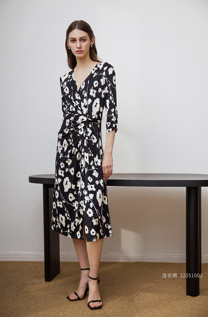 【V领系带真丝连衣裙】春夏女士新品100%桑蚕丝印花中长款连衣裙系带收腰裙子