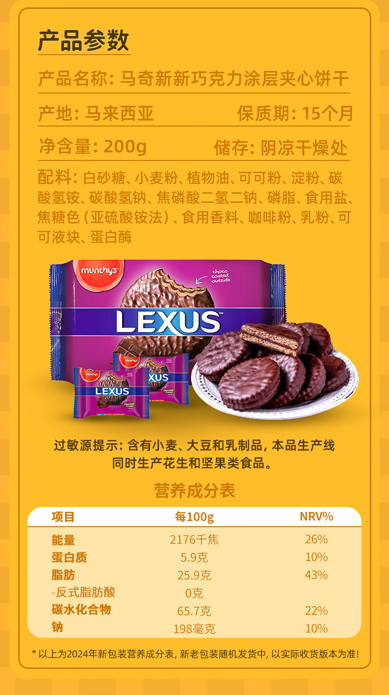 【分仓直发包邮】马奇新新纯可可脂巧克力涂层夹心饼200g*2
