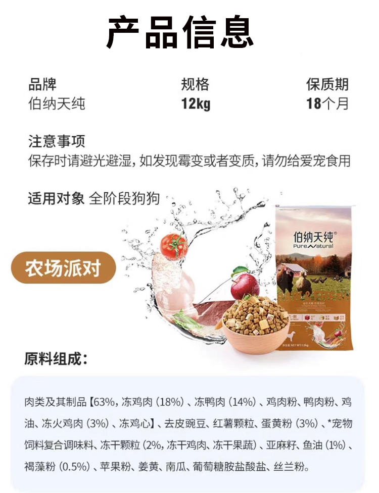 【正品】伯纳天纯农场派对全价全期犬粮12kg无谷低敏天然狗粮冻干狗粮