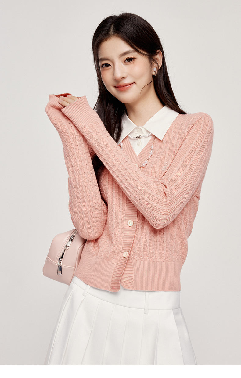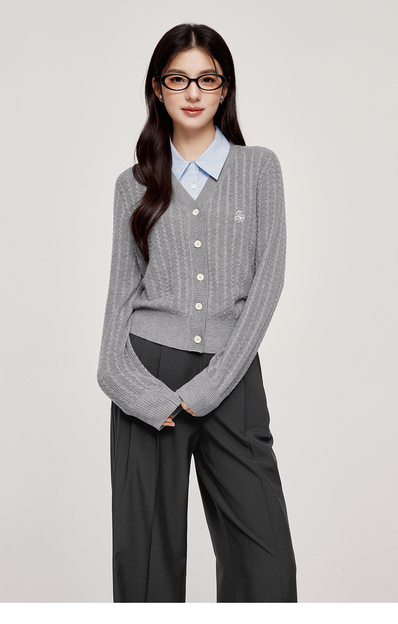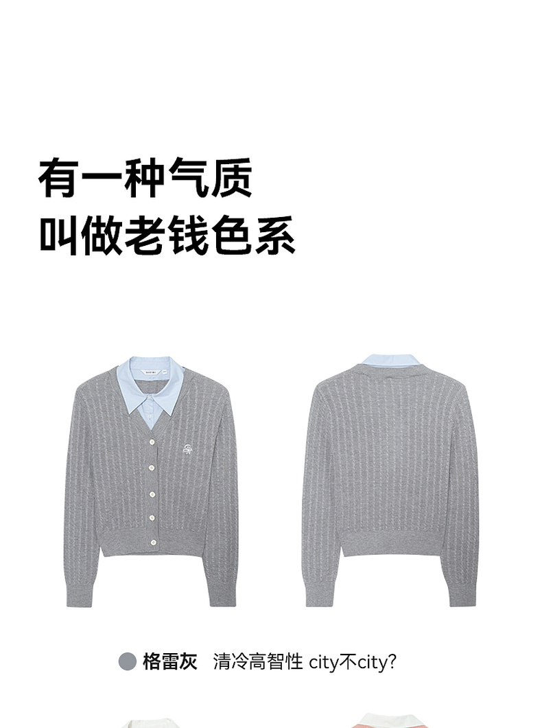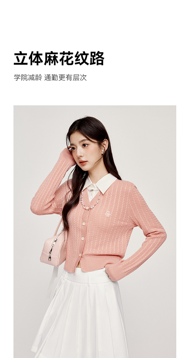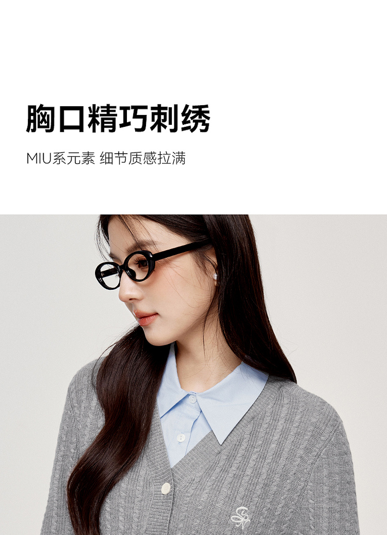 【严选】诗凡黎可脱卸衬衫领绞花针织开衫2024秋新款miu系刺绣假两件上衣7F8330081