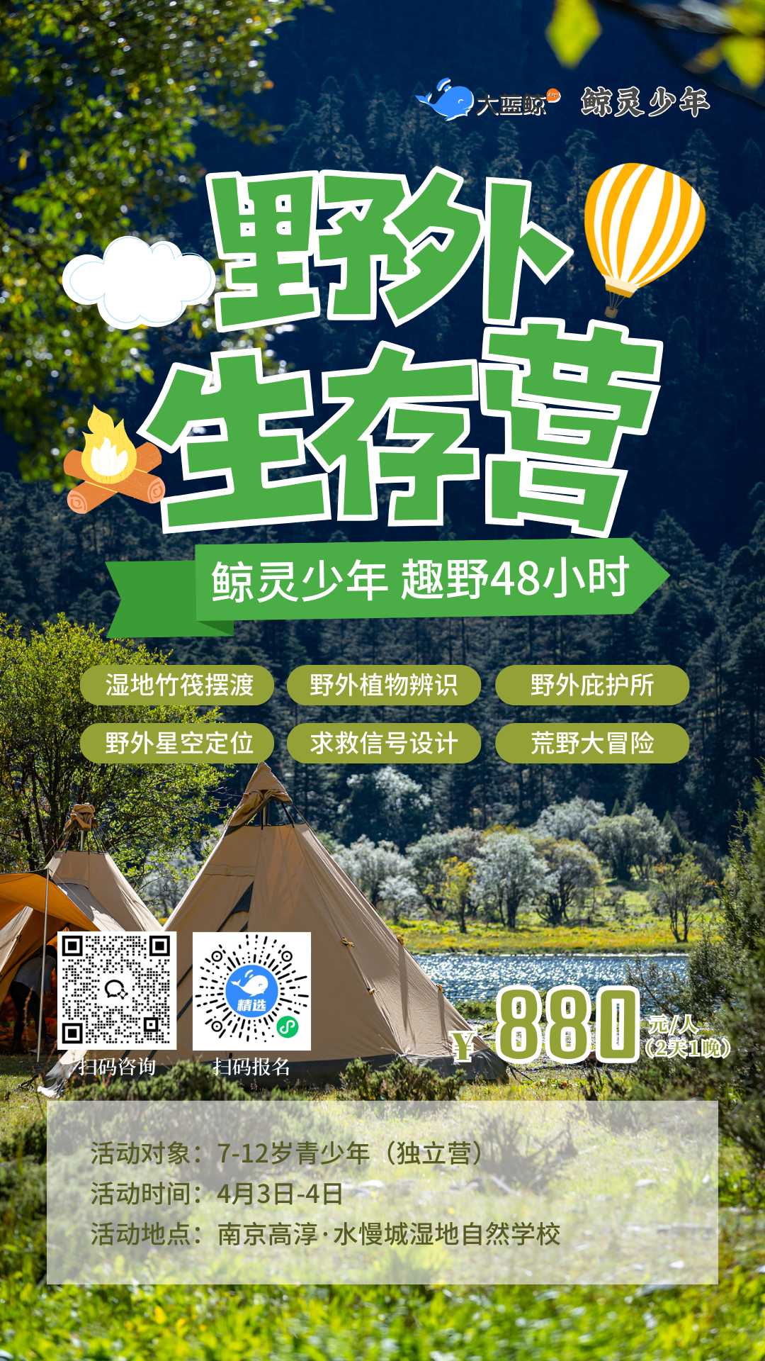 大蓝鲸爱研学|48小时野外生存独立营,让孩子“野”起来(春假2日营)