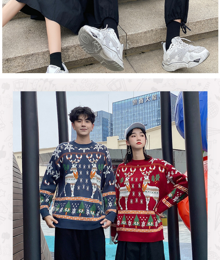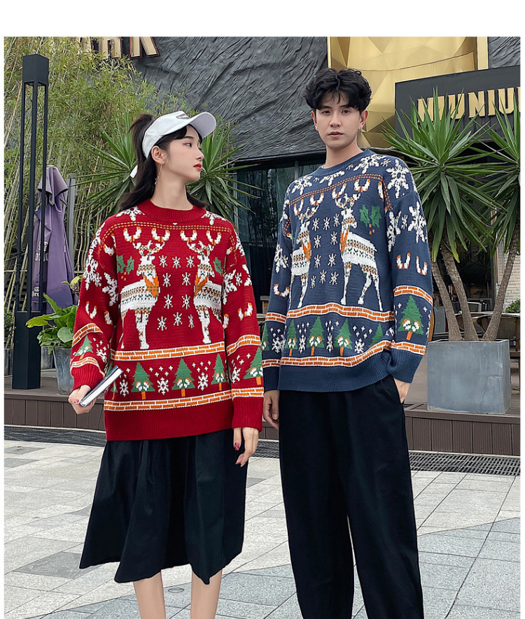 炸街圆领情侣装慵懒风毛衣麋鹿冬装ins超火宽松韩版外穿七夕情人节