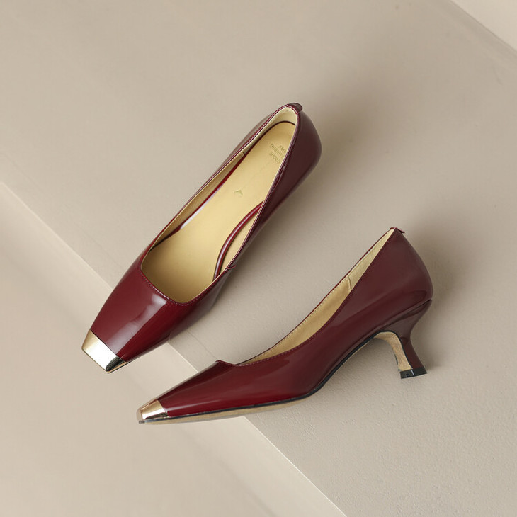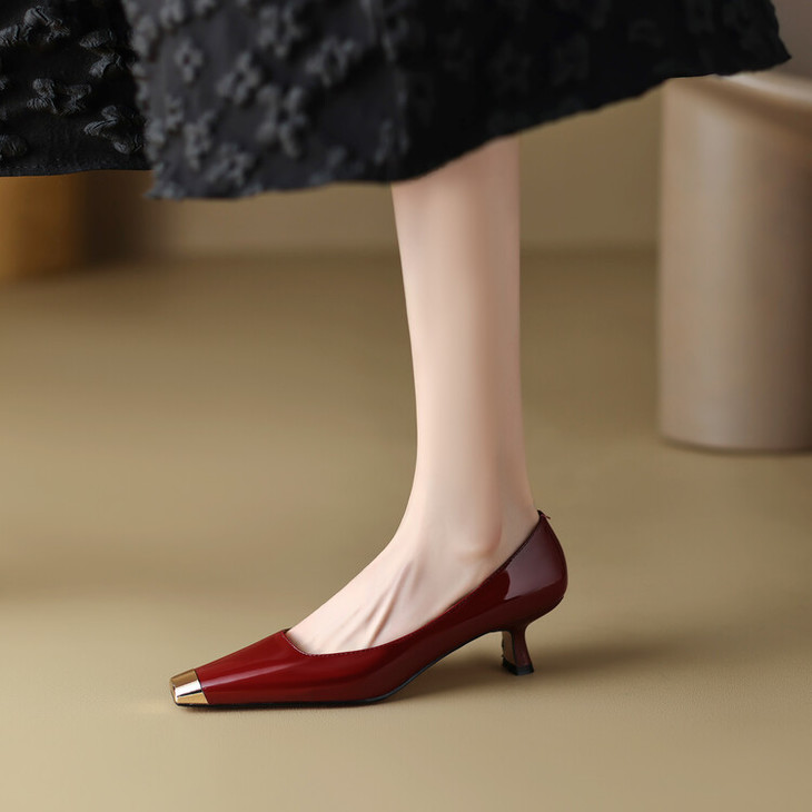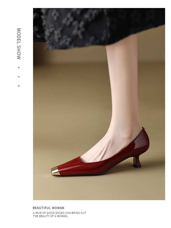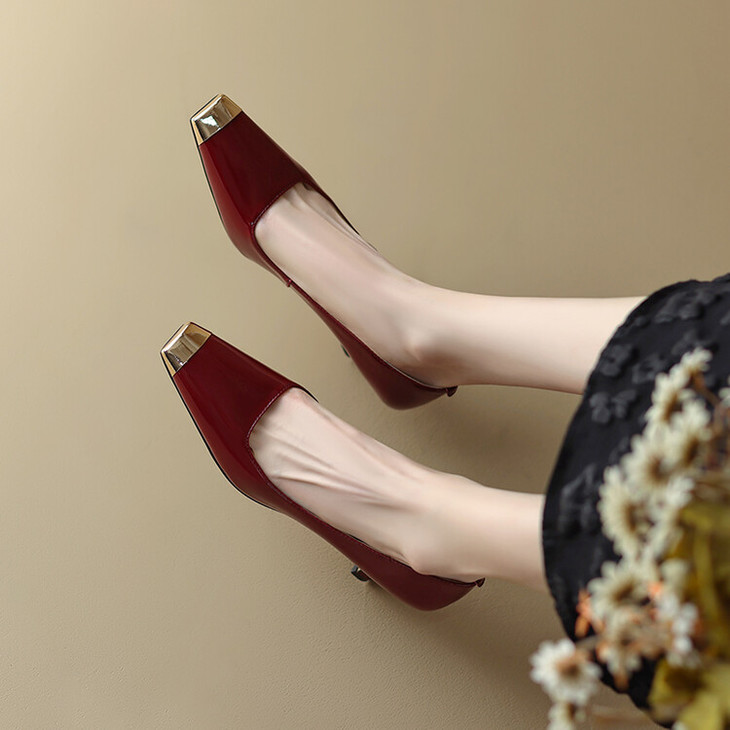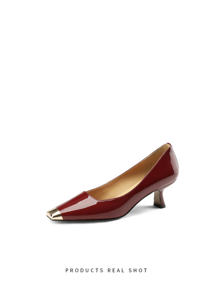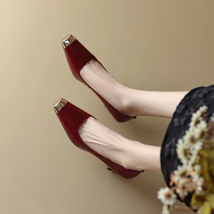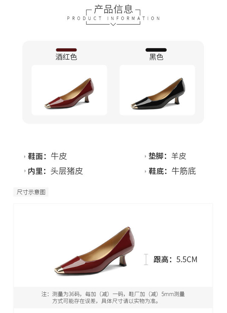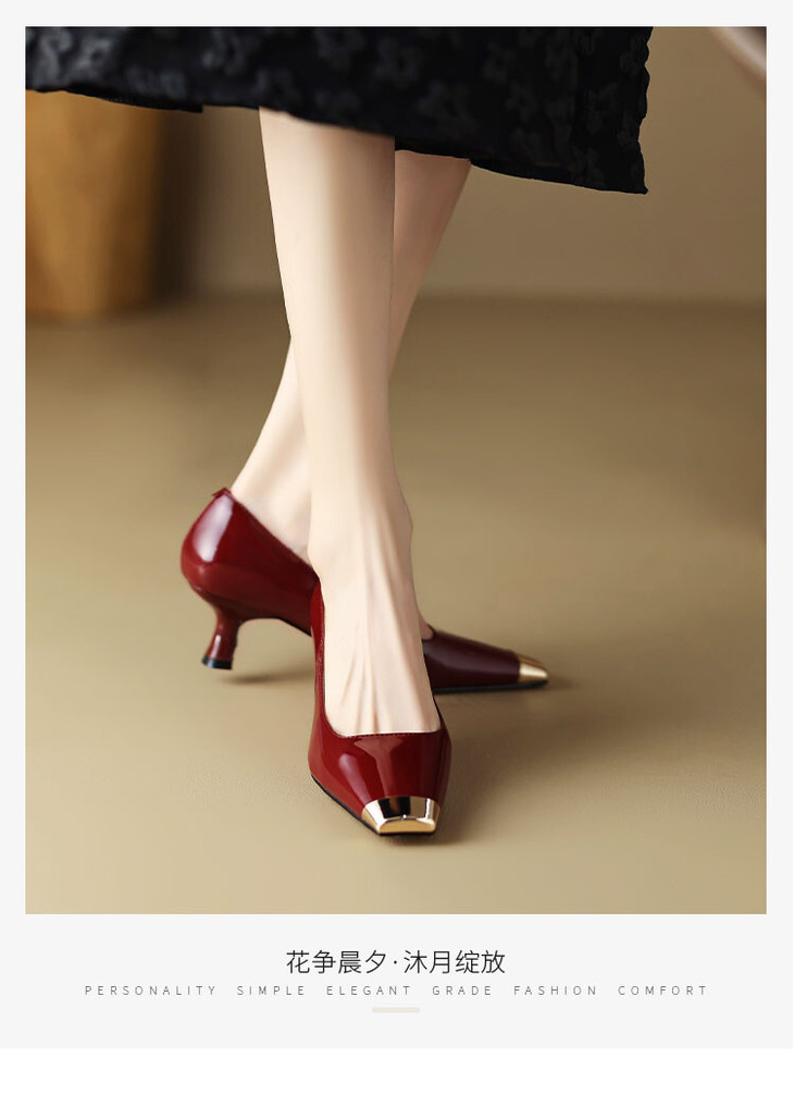 【预售5天】真皮酒红色牛皮气质名媛高跟鞋金属方头细跟单鞋女HCYEHD&K3267