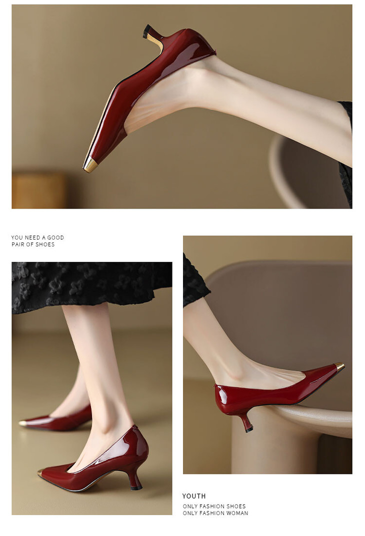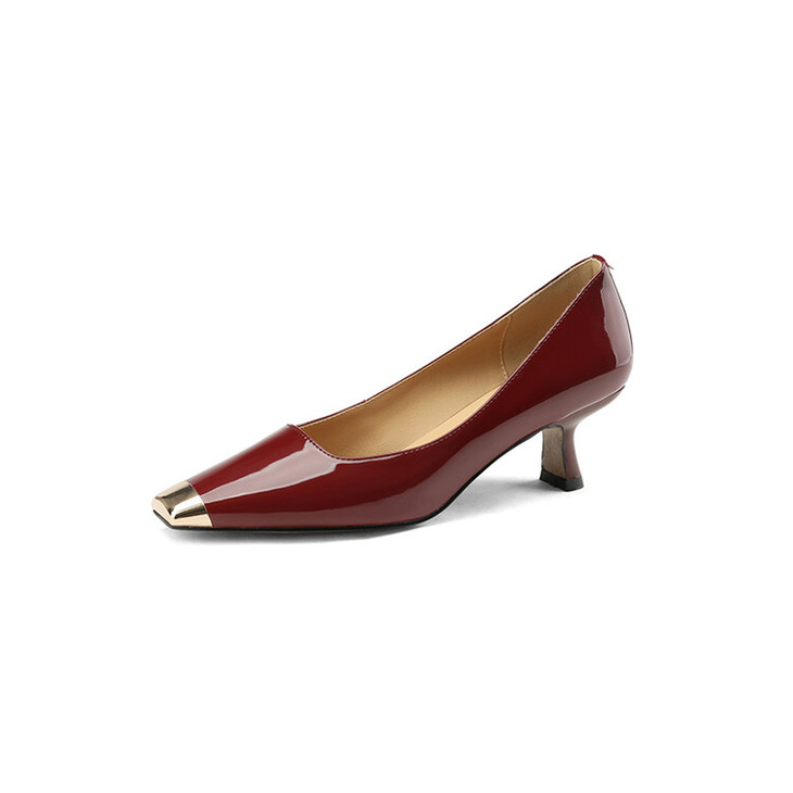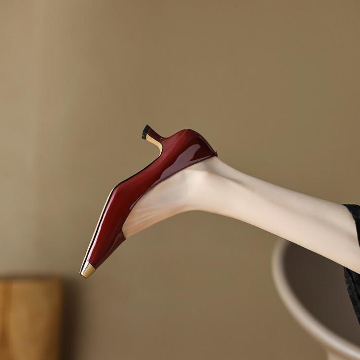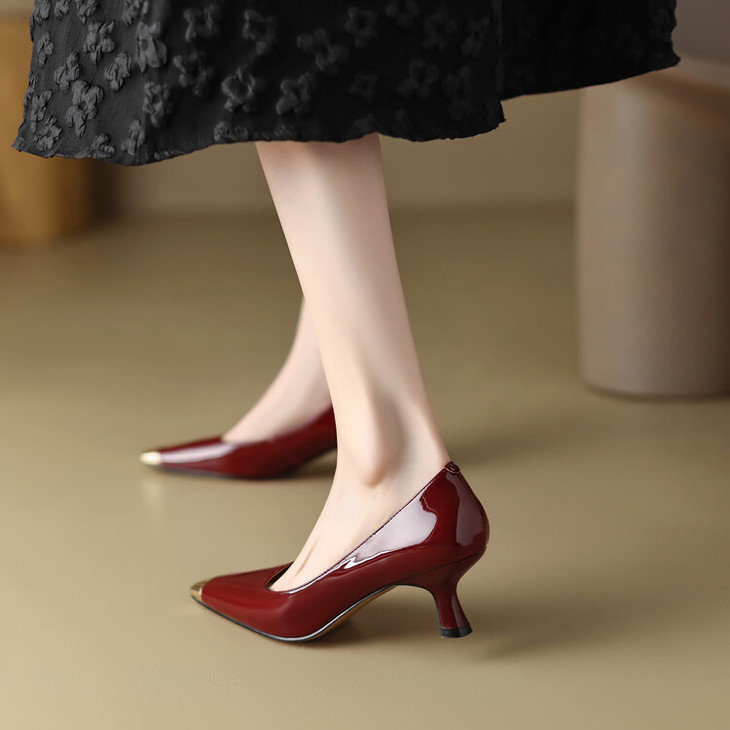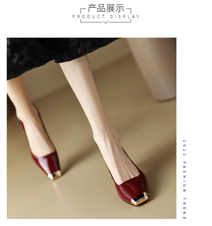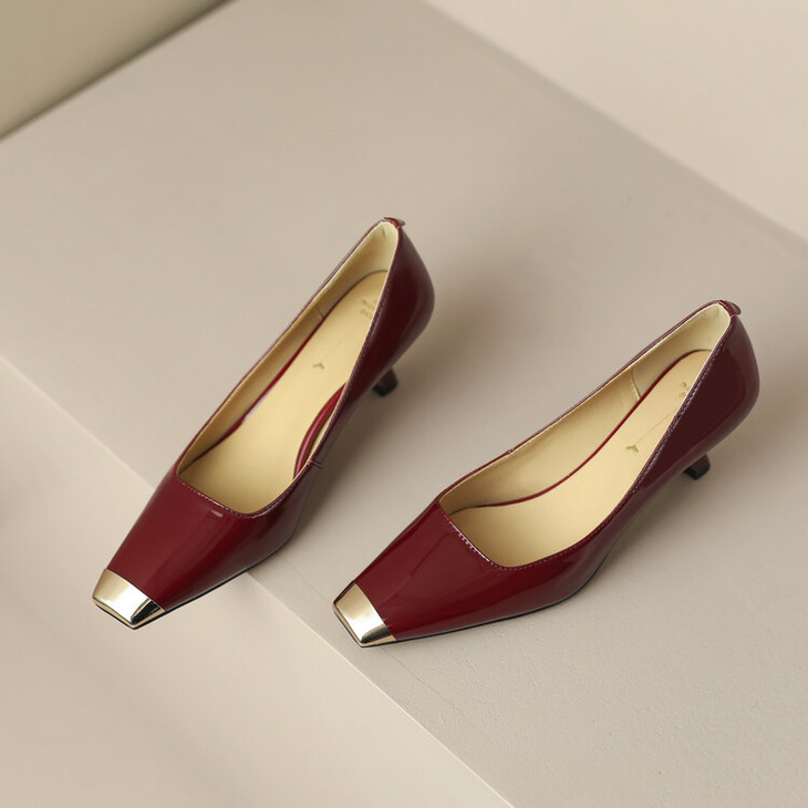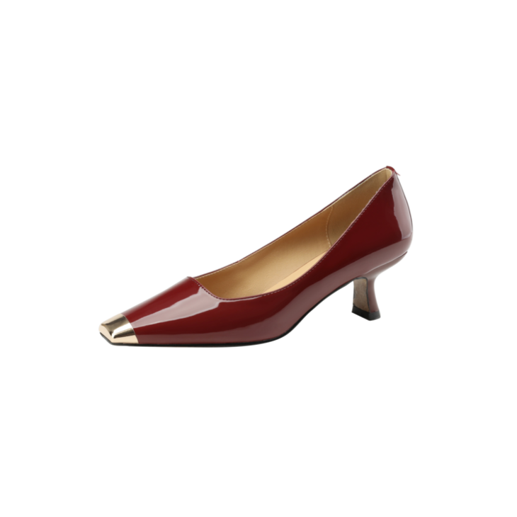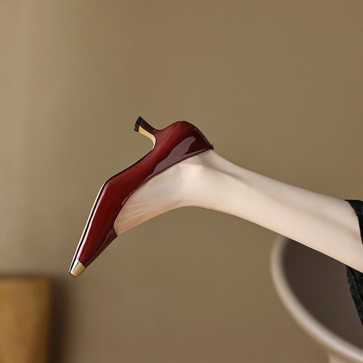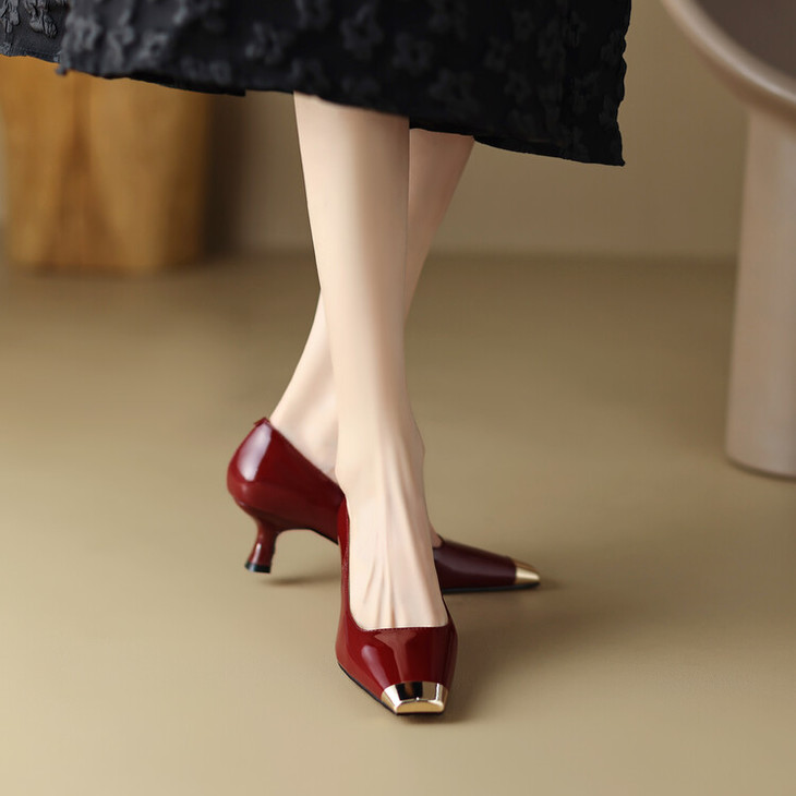 【预售5天】真皮酒红色牛皮气质名媛高跟鞋金属方头细跟单鞋女HCYEHD&K3267