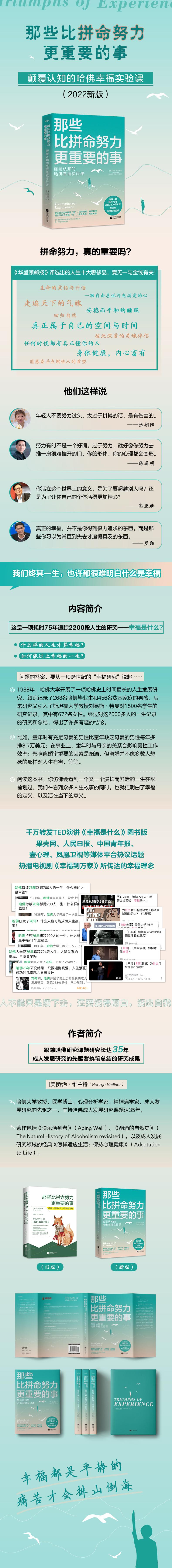 什么样的人生才算幸福?如何能过上幸福的一生?问题的答案,要从一项跨世纪的“幸福研究”说起……1938年,哈佛大学开展了一项哈佛目前时间最长的人生发展研究,跟踪记录了268名哈佛毕业生和456名贫困家庭的男孩,后来研究又引入了斯坦福大学教授刘易斯·特曼对1500名学生的研究记录,其中有672名女性。经过对这2000多人的一生记录的研究和总结,得出了许多有趣的结论。比如,童年时有充足母爱的男性比童年缺乏母爱的男性每年多挣8.7万美元;在事业上,童年时与母亲的关系会影响男性工作效率;影响离婚率重要的因素是酗酒,但离婚并不像多数人想象的那样对人生有害,等等。阅读这本书,你仿佛会看到一个又一个漫长而鲜活的一生在眼前划过,我们在看到众多人生故事的同时,也就更明白了幸福的定义,以及活在当下的意义。