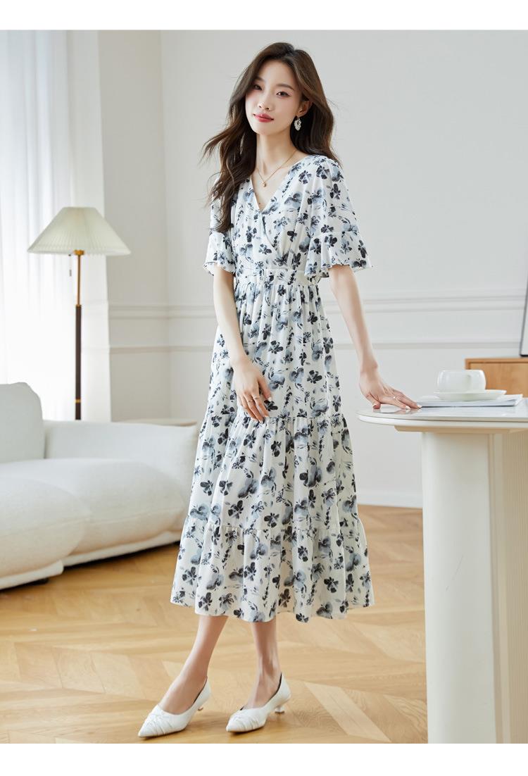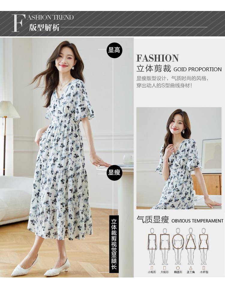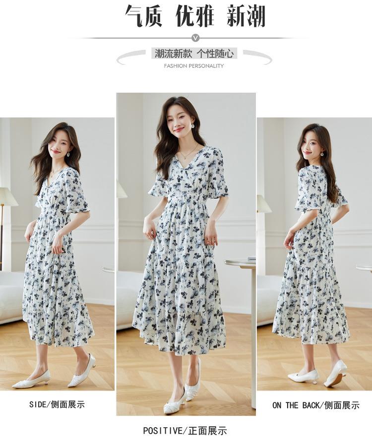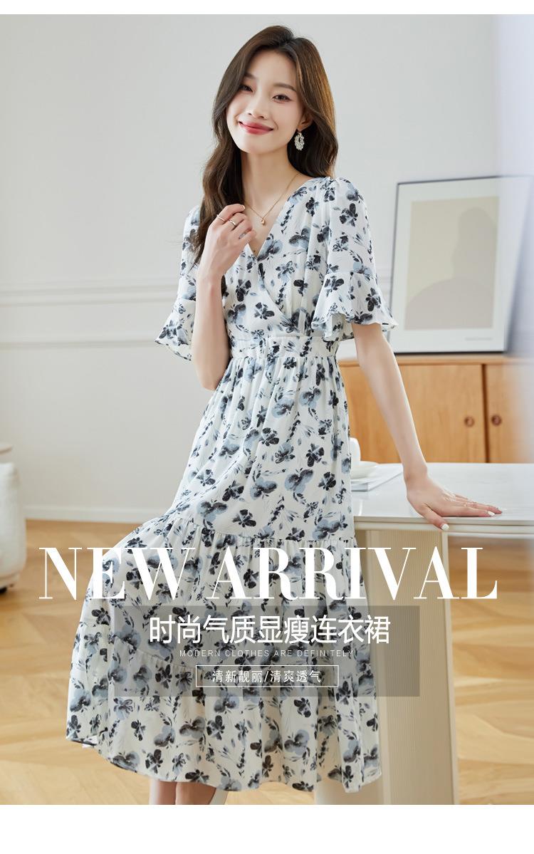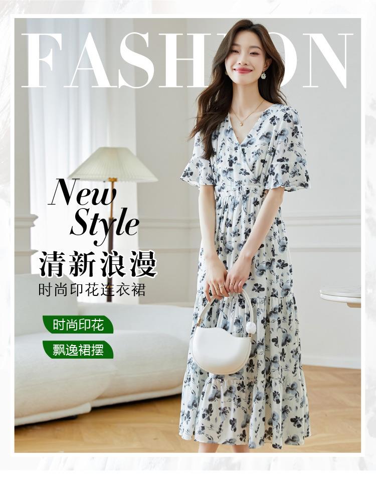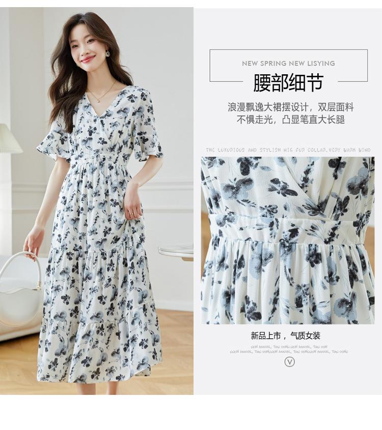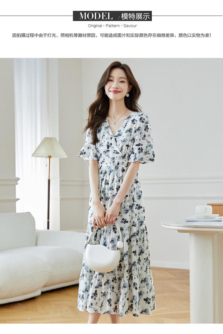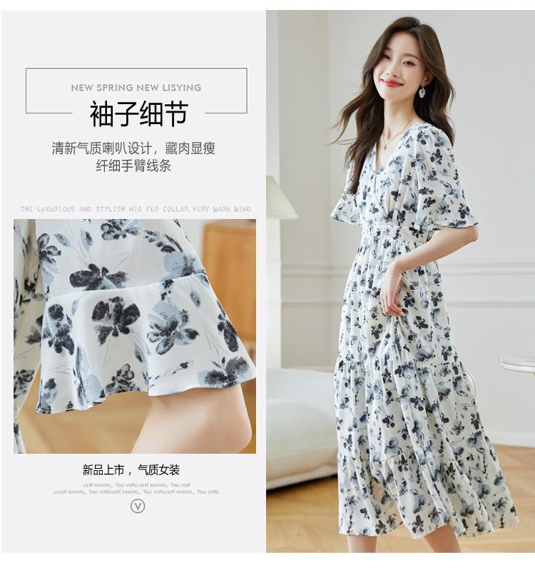 连衣裙女夏季2024新款气质中长款短袖V领雪纺碎花荷叶袖大摆长裙