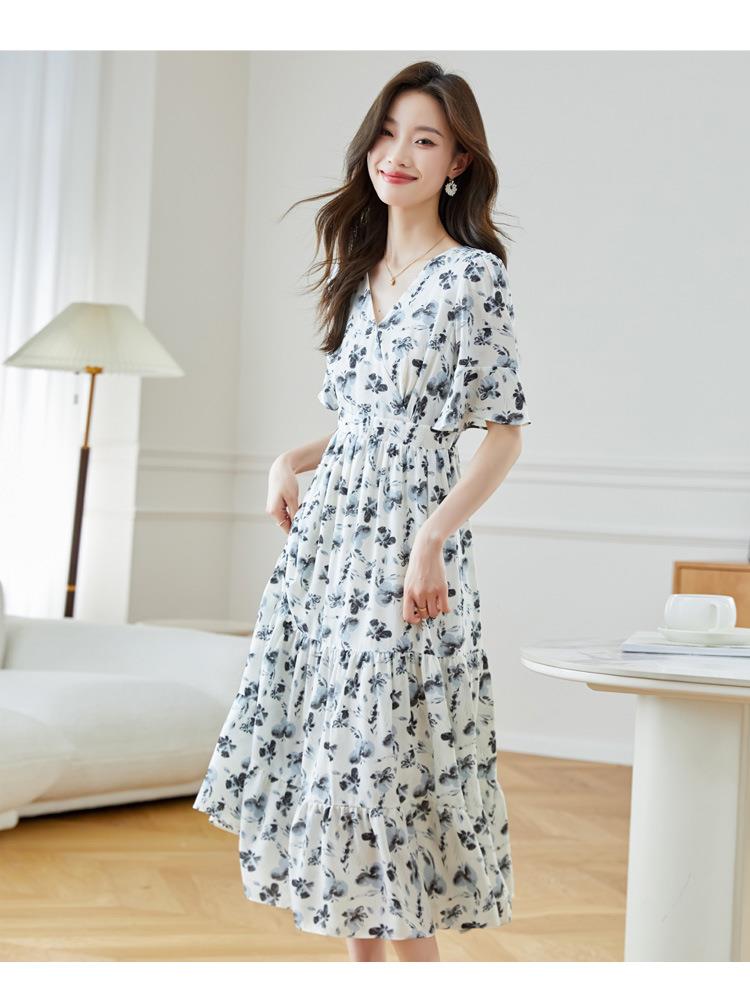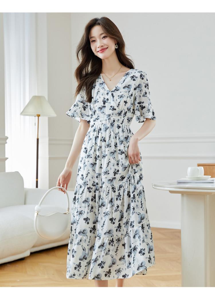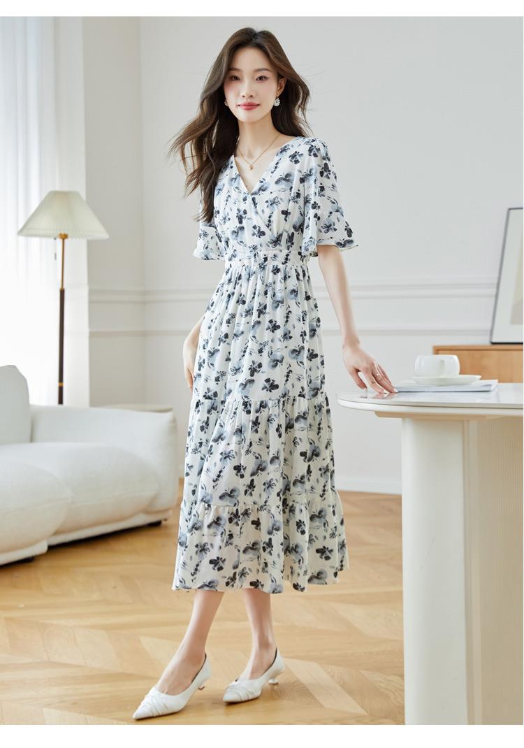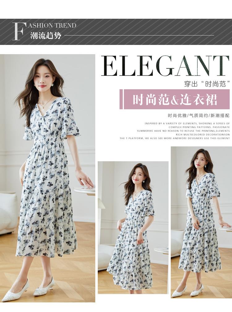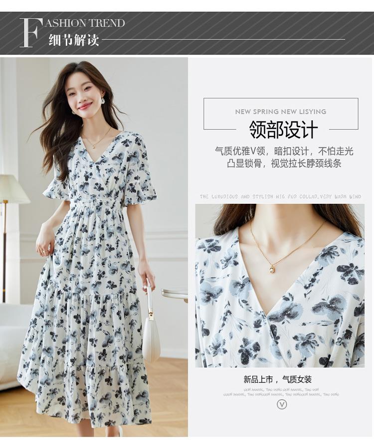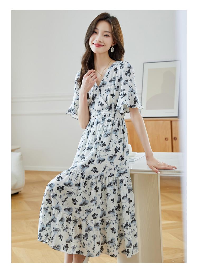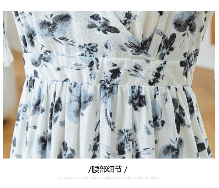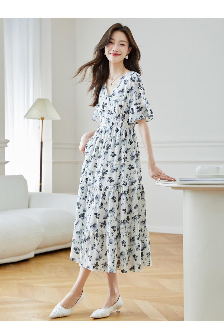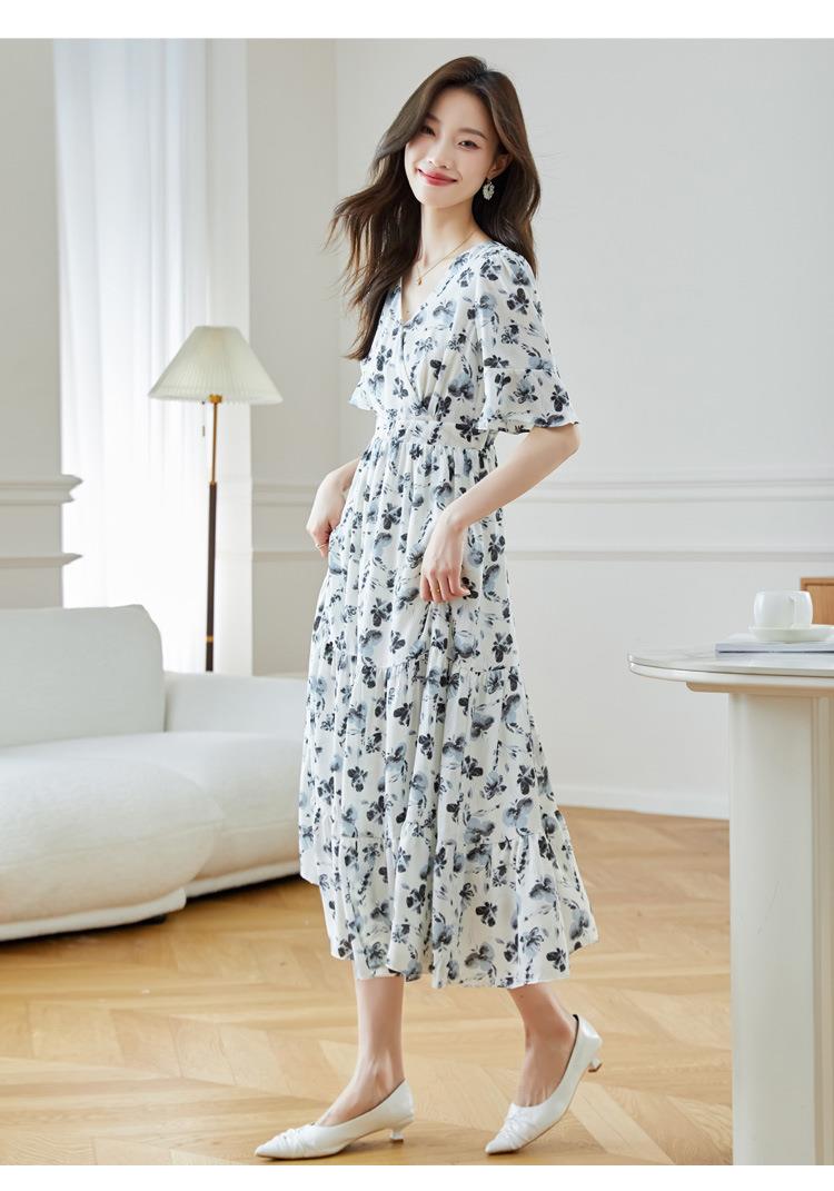 连衣裙女夏季2024新款气质中长款短袖V领雪纺碎花荷叶袖大摆长裙