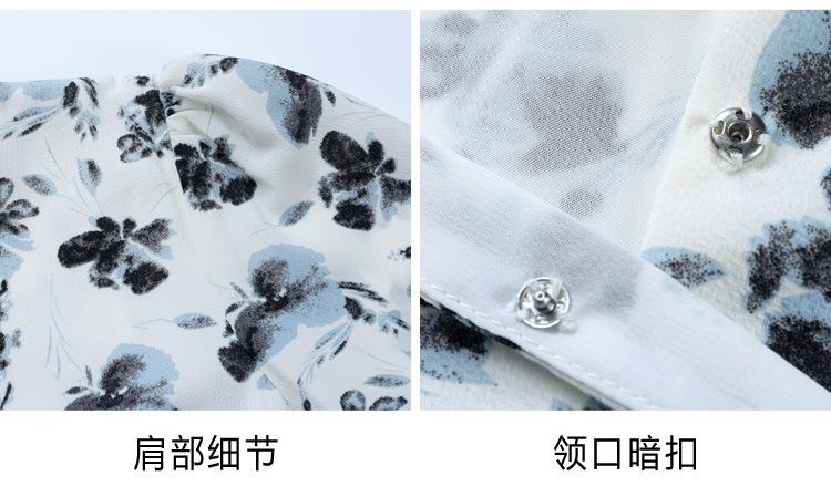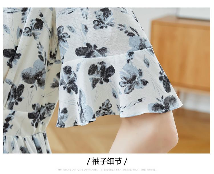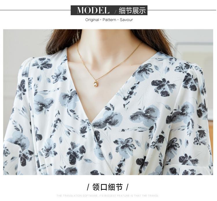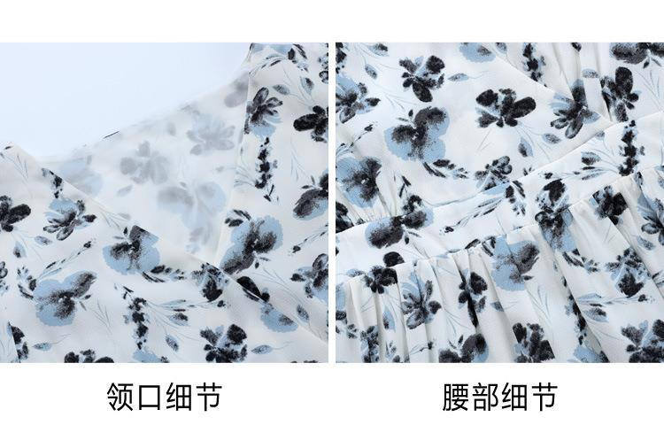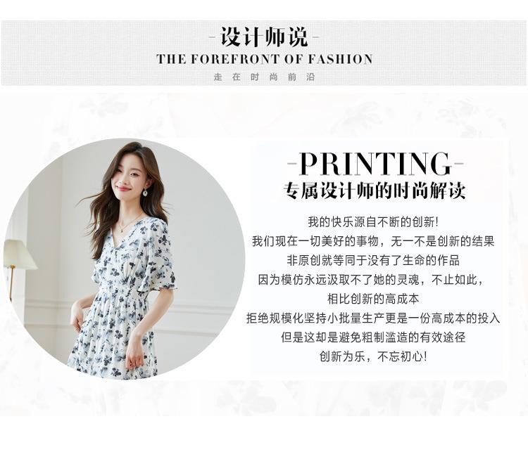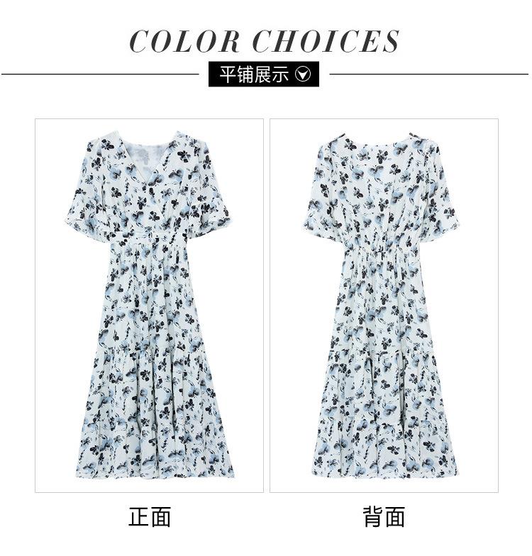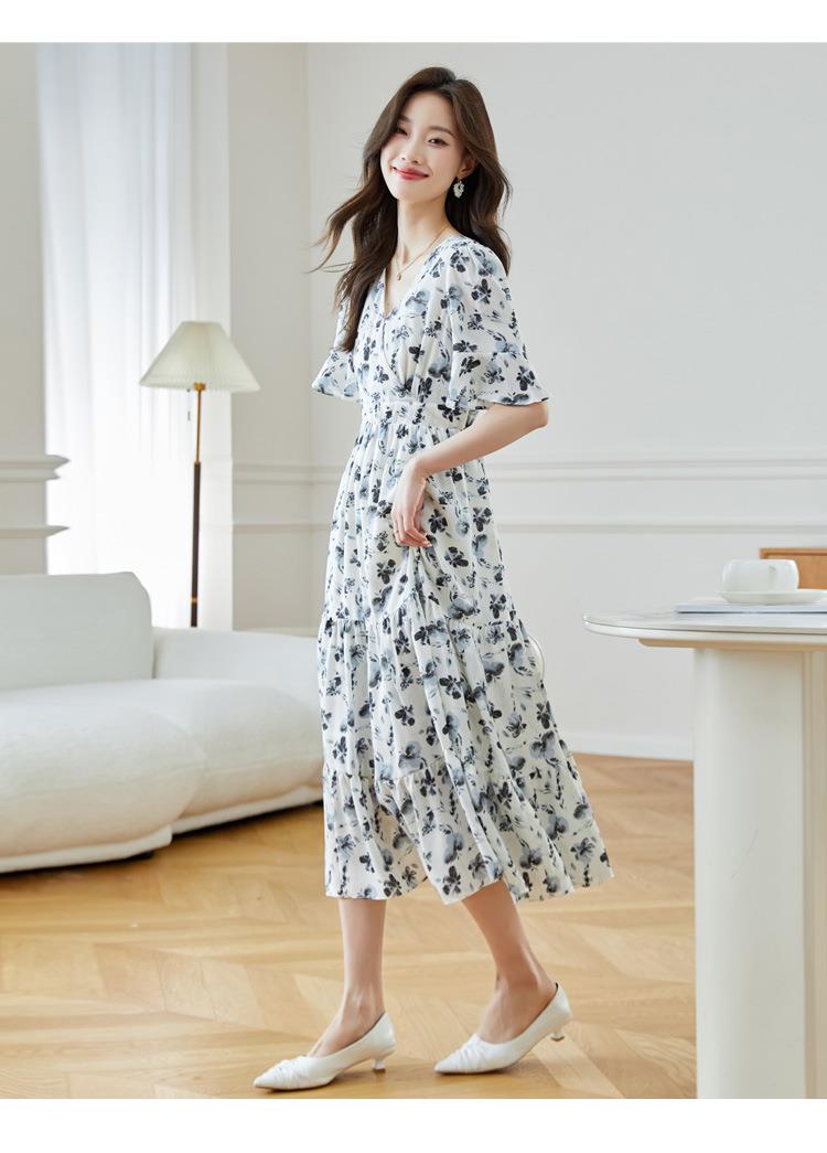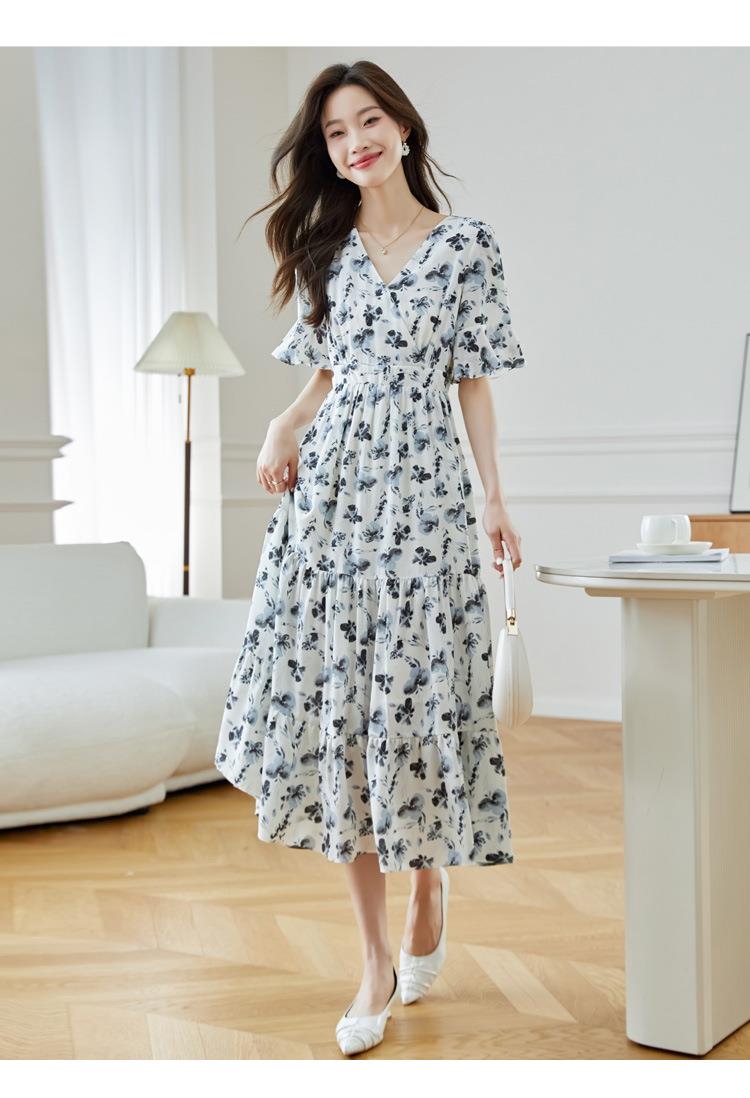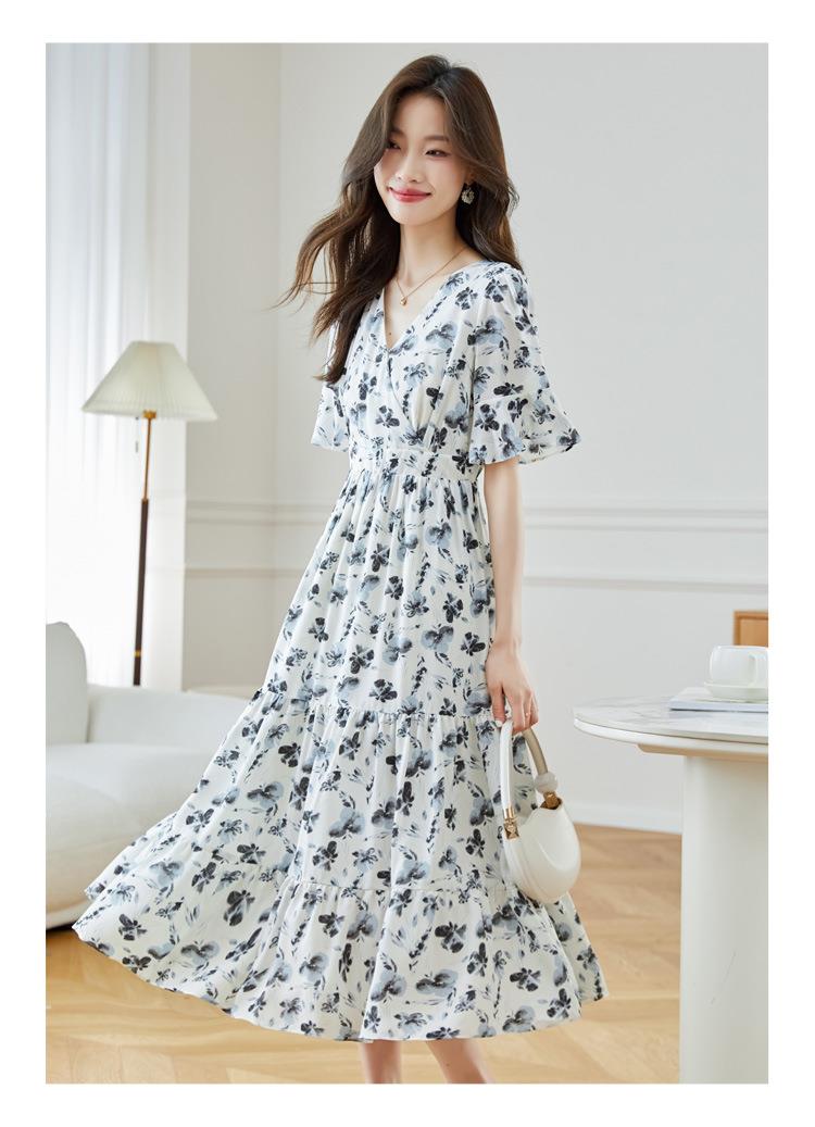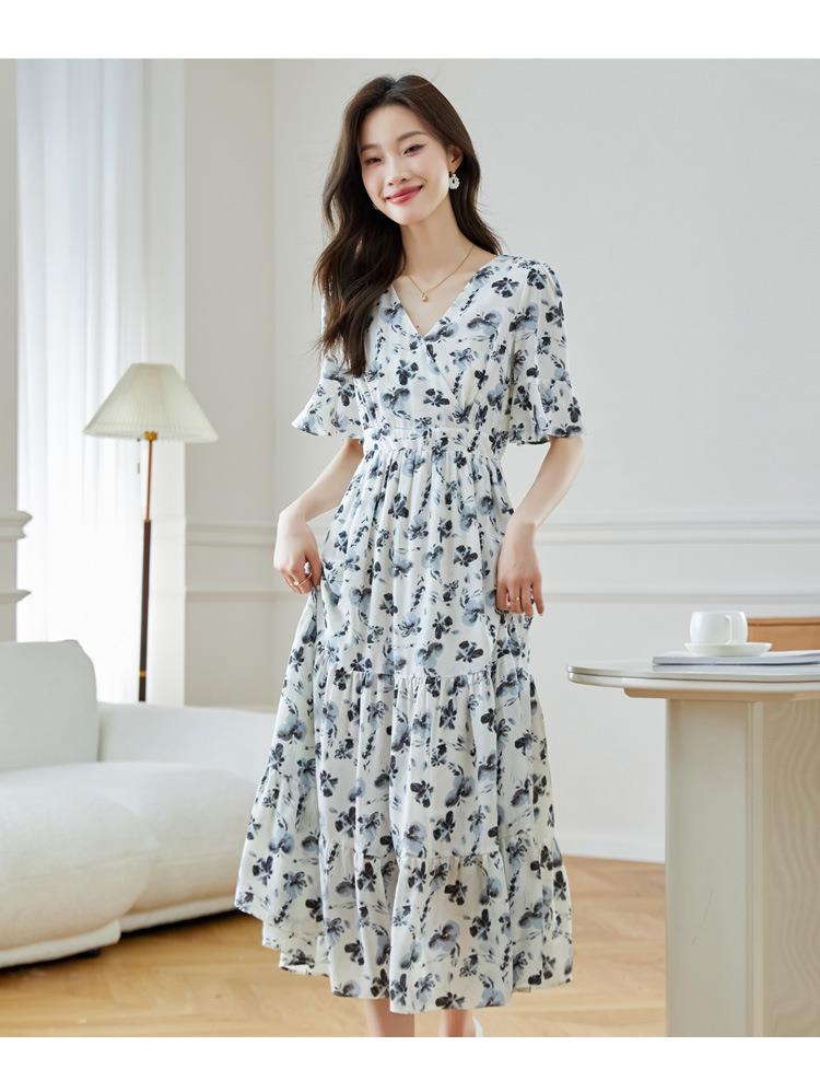 连衣裙女夏季2024新款气质中长款短袖V领雪纺碎花荷叶袖大摆长裙