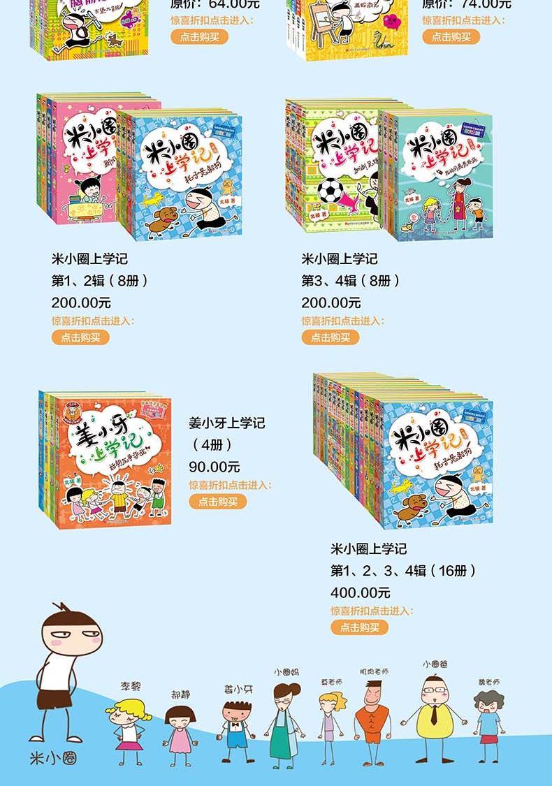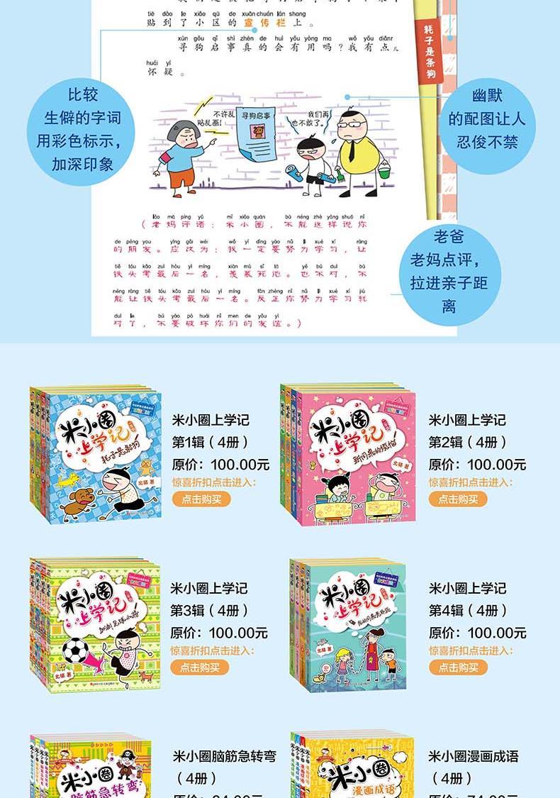 米小圈的一年级《我是小学生》 米小圈从幼儿园跨入小学一年级了。他发现,小学和幼儿园大不一样,这里有整天与他作对的同桌,有必须完成的家庭作业和让他头痛的英文单词。总之,这里有各种新奇好玩的事儿。上学的日子总是快乐又烦恼的。米小圈把这些通通写在了自己的日记里。《好朋友铁头》 米小圈幼儿园时的好朋友铁头转学成为了他的同学,他感到非常高兴。铁头优选的特点就是头很大,但却很不灵光,对于学习几乎一窍不通。就要期末考试了,铁头非常的苦恼。身为好朋友的米小圈怎能坐视不管,他开动脑筋发起了一个叫“铁头学习救援团”的组织,帮助铁头顺利通过考试。《耗子是条狗》 米小圈无意中在小区里发现一条怕猫的狗,并给它起名叫“耗子”。米小圈偷偷把耗子带回家去,遭到了老妈的强烈反对。小圈爸在外面给狗搭了一个窝,耗子终于有了自己的“豪宅”。可是这时耗子的主人却找来了……《瞧这一家人》 米小圈生长在一个快乐的家庭里,可他真的很快乐......