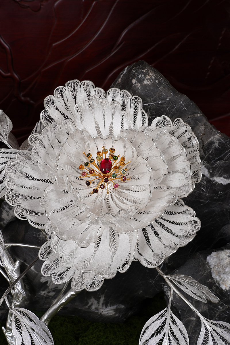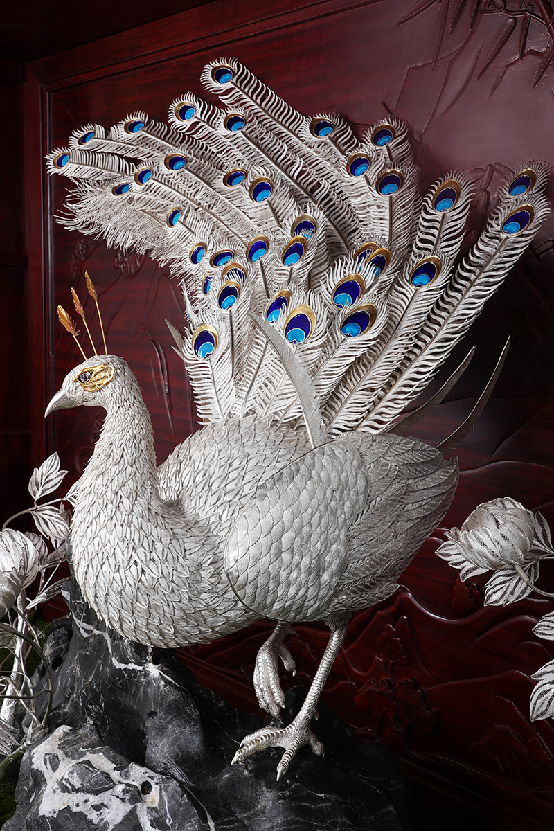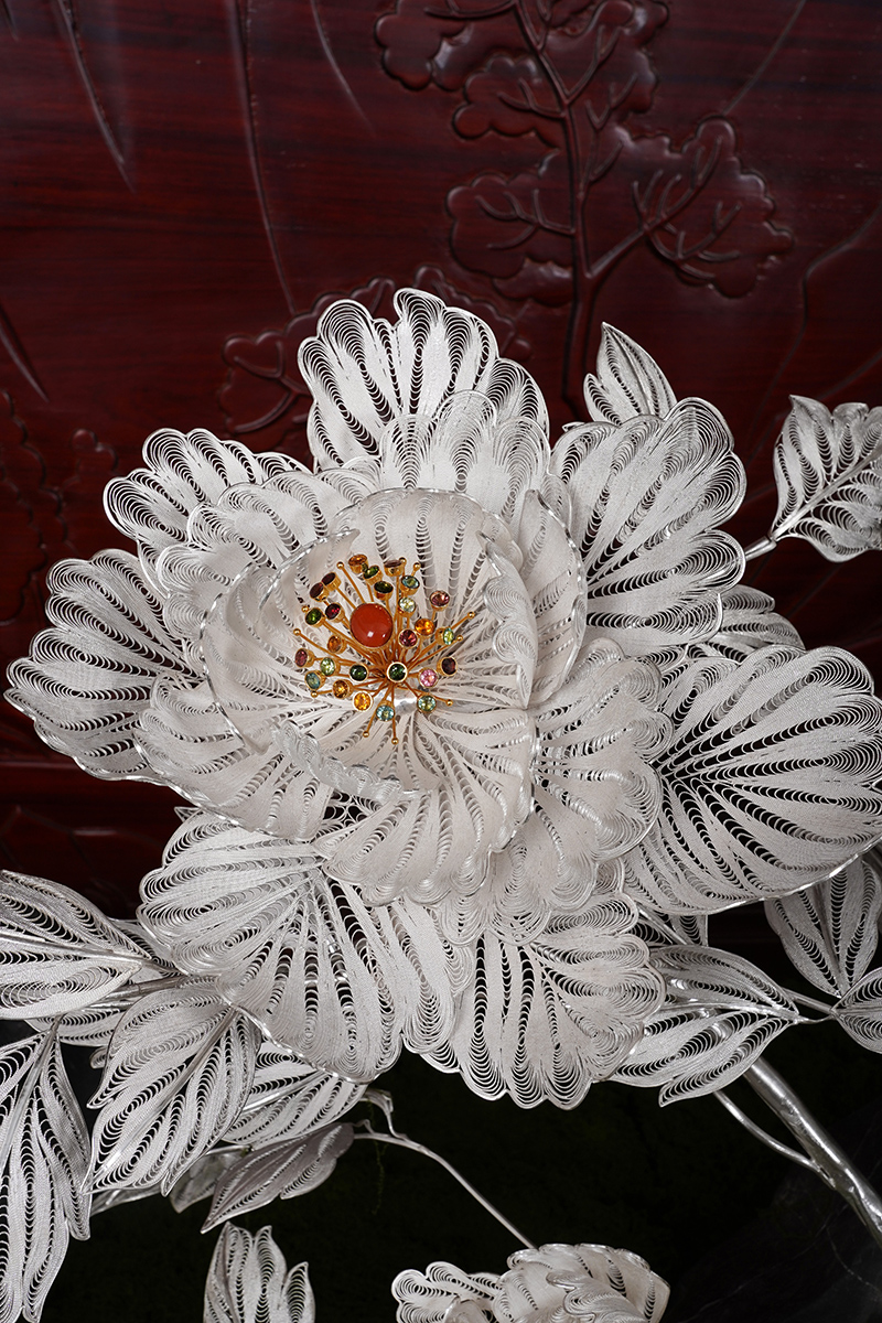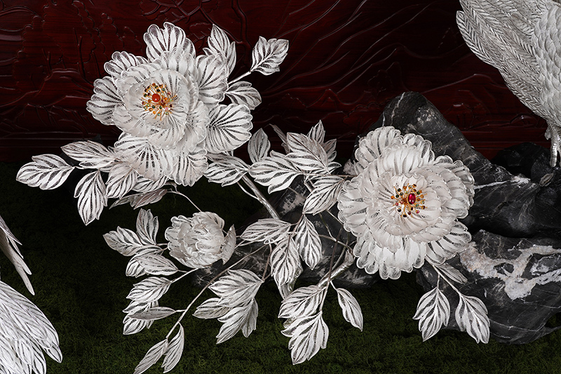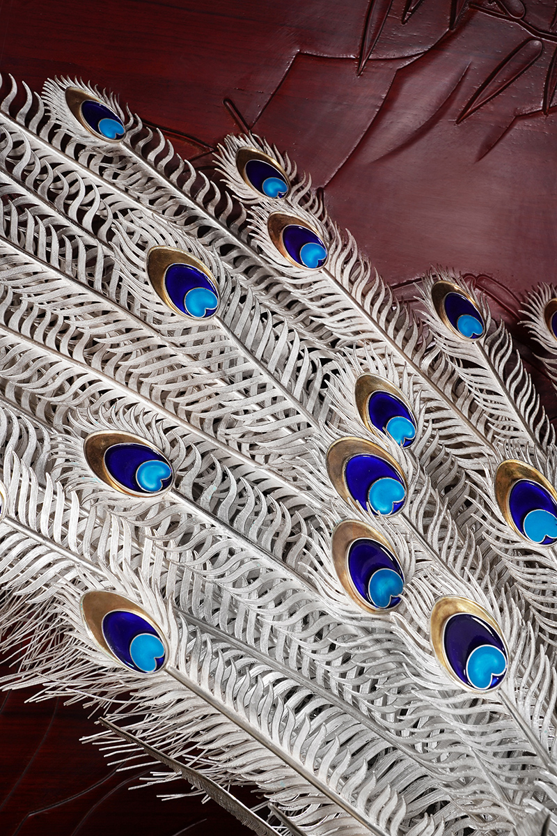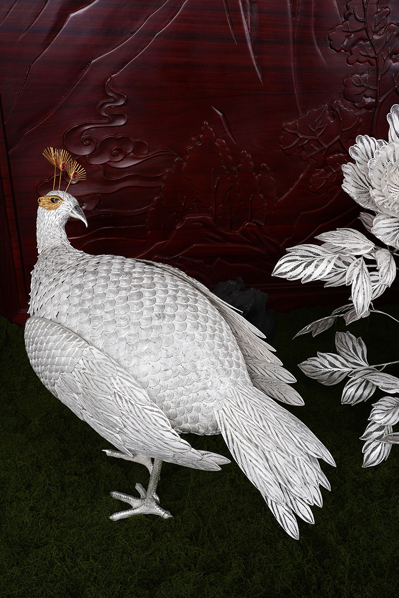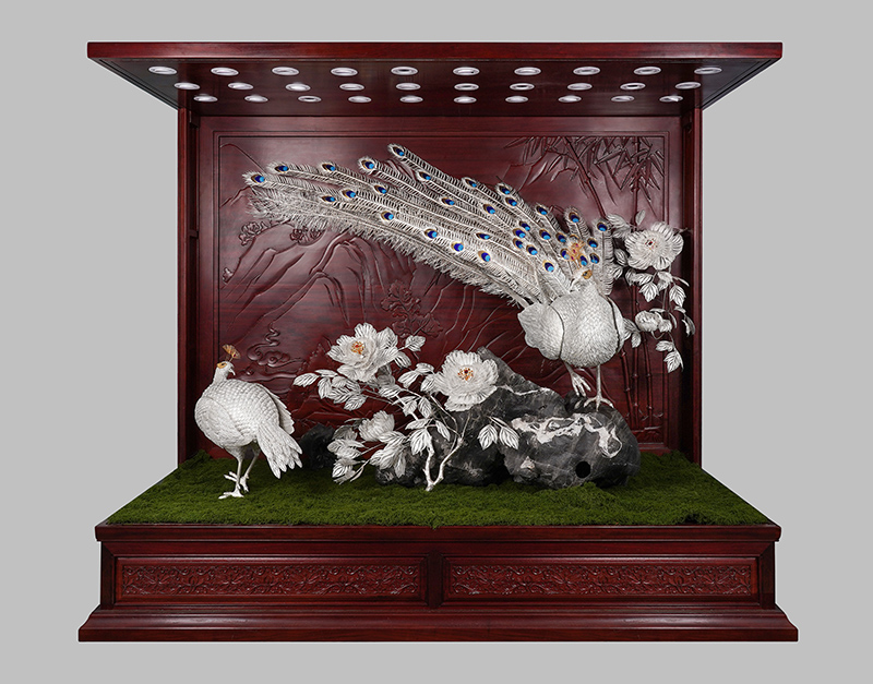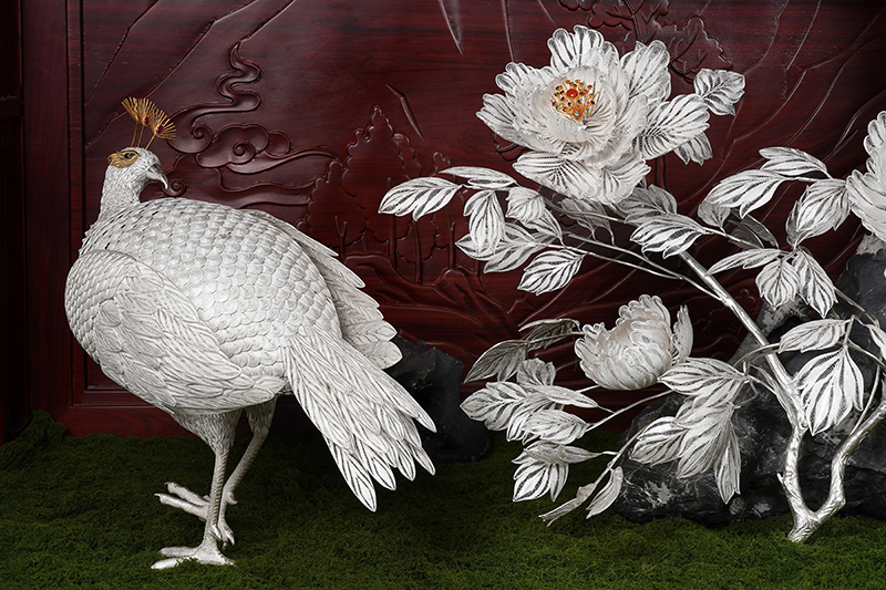 【作品寓意】:《盛世风华》以“锦绣神州,风华盛世”为设计灵感,以木雕屏风为底座,以银花丝雌雄孔雀和牡丹花为主体,主要采用国家级非遗项目成都银花丝技艺,糅合无胎成型技术、珐琅彩技术镀金技术等,旨在以非遗银花丝工艺,编织壮阔画卷,礼赞锦绣神州;以和平鸟孔雀与国花牡丹,歌颂祖国繁荣盛世;以立体全景化锦绣江山,期盼世界和平美好。