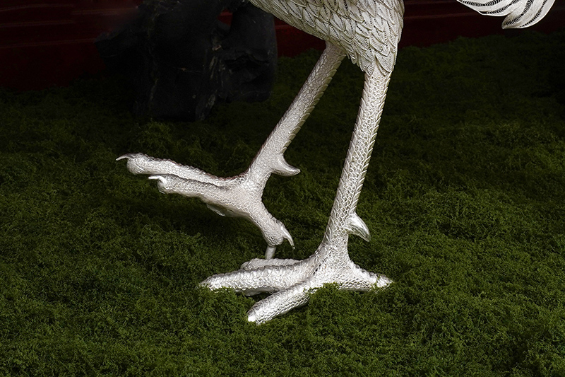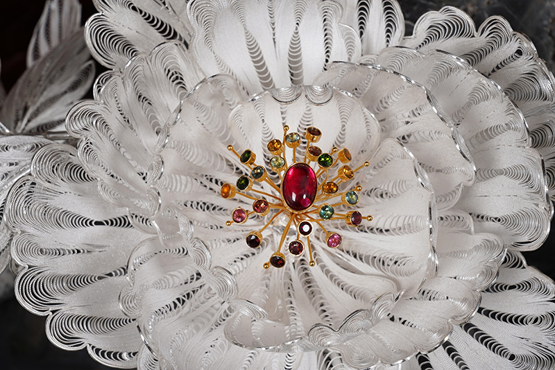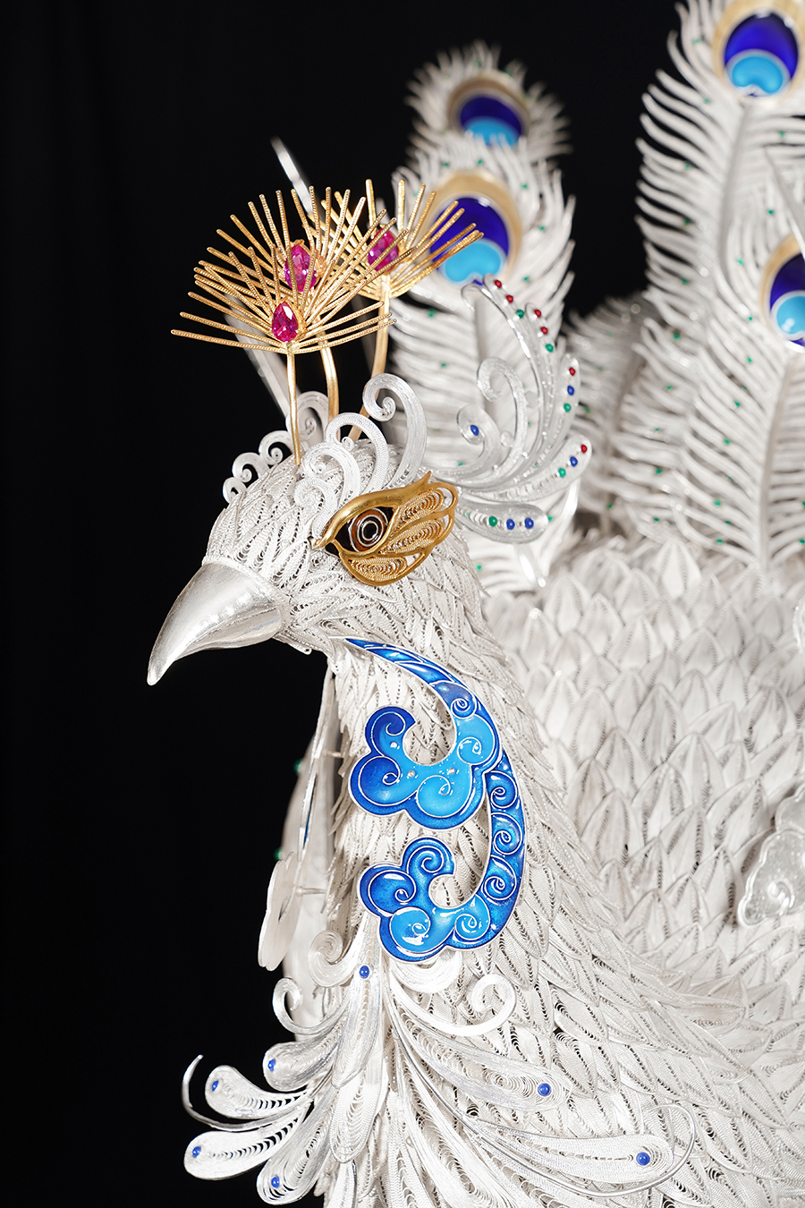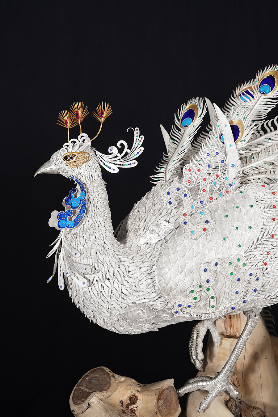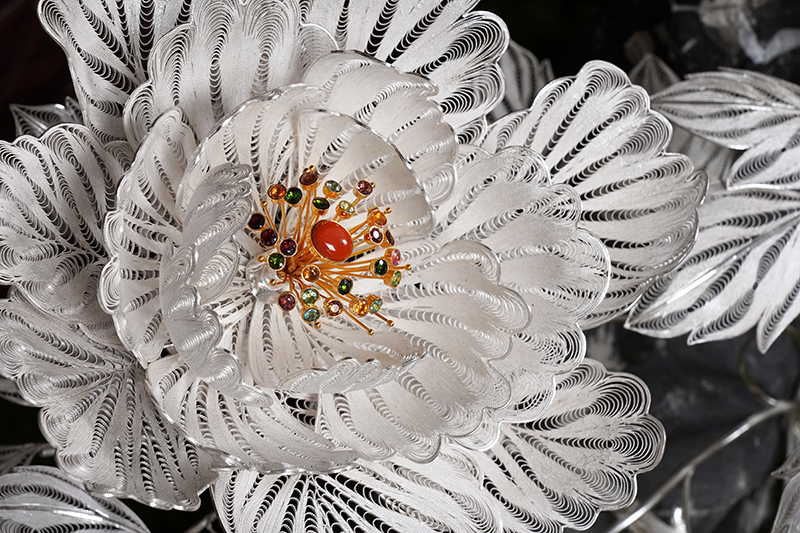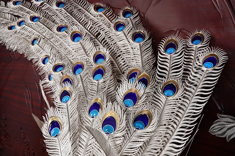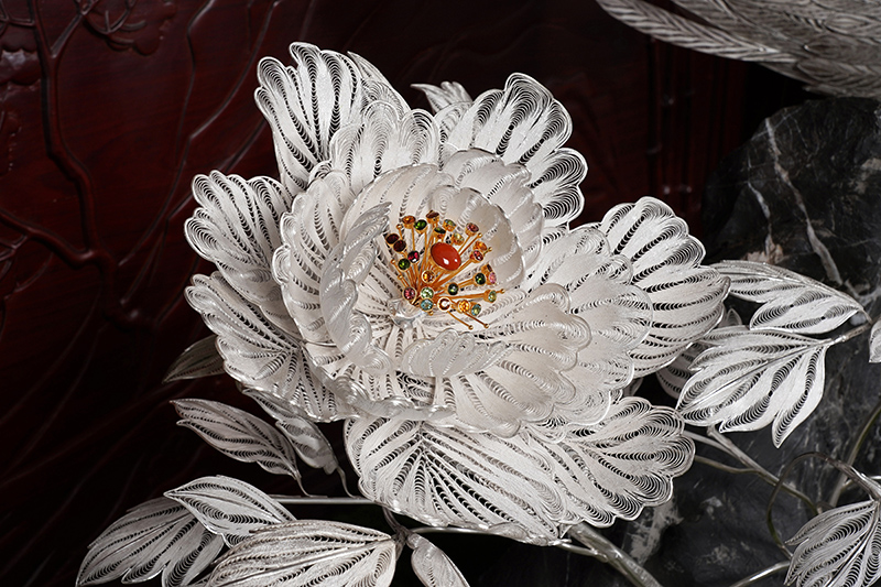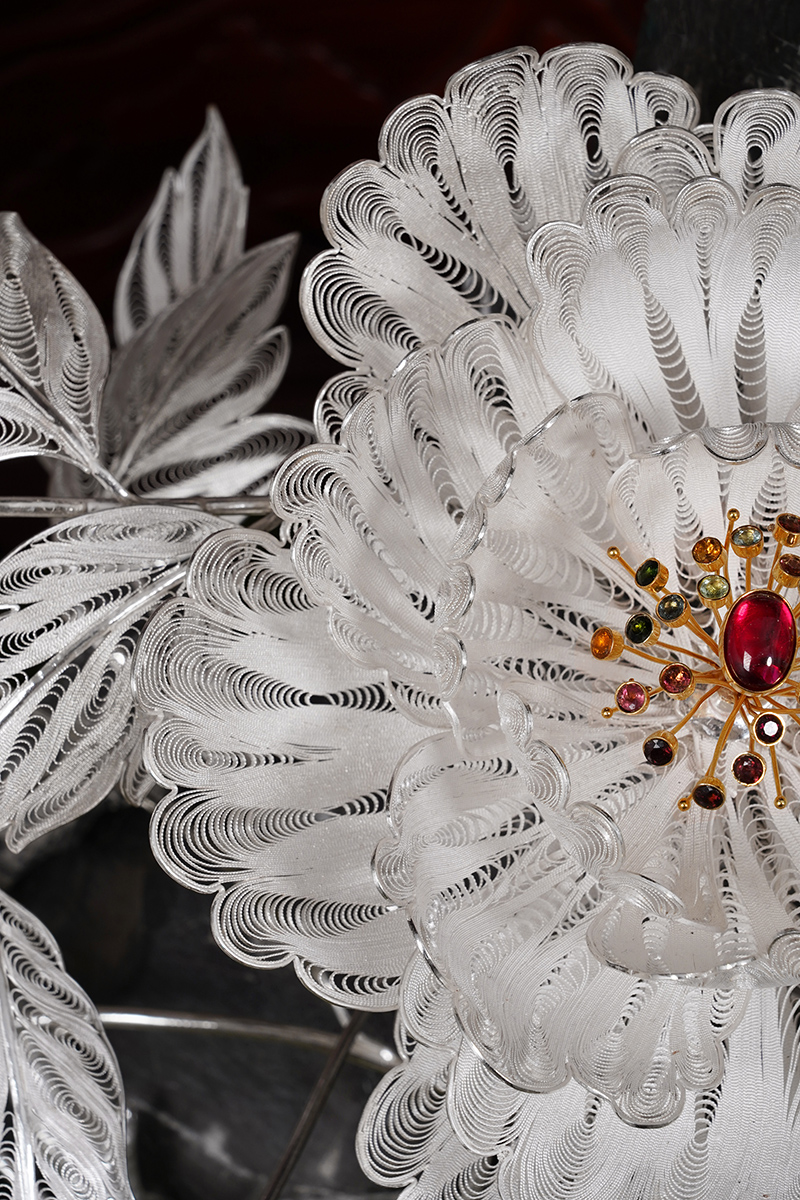 【作品寓意】:《盛世风华》以“锦绣神州,风华盛世”为设计灵感,以木雕屏风为底座,以银花丝雌雄孔雀和牡丹花为主体,主要采用国家级非遗项目成都银花丝技艺,糅合无胎成型技术、珐琅彩技术镀金技术等,旨在以非遗银花丝工艺,编织壮阔画卷,礼赞锦绣神州;以和平鸟孔雀与国花牡丹,歌颂祖国繁荣盛世;以立体全景化锦绣江山,期盼世界和平美好。