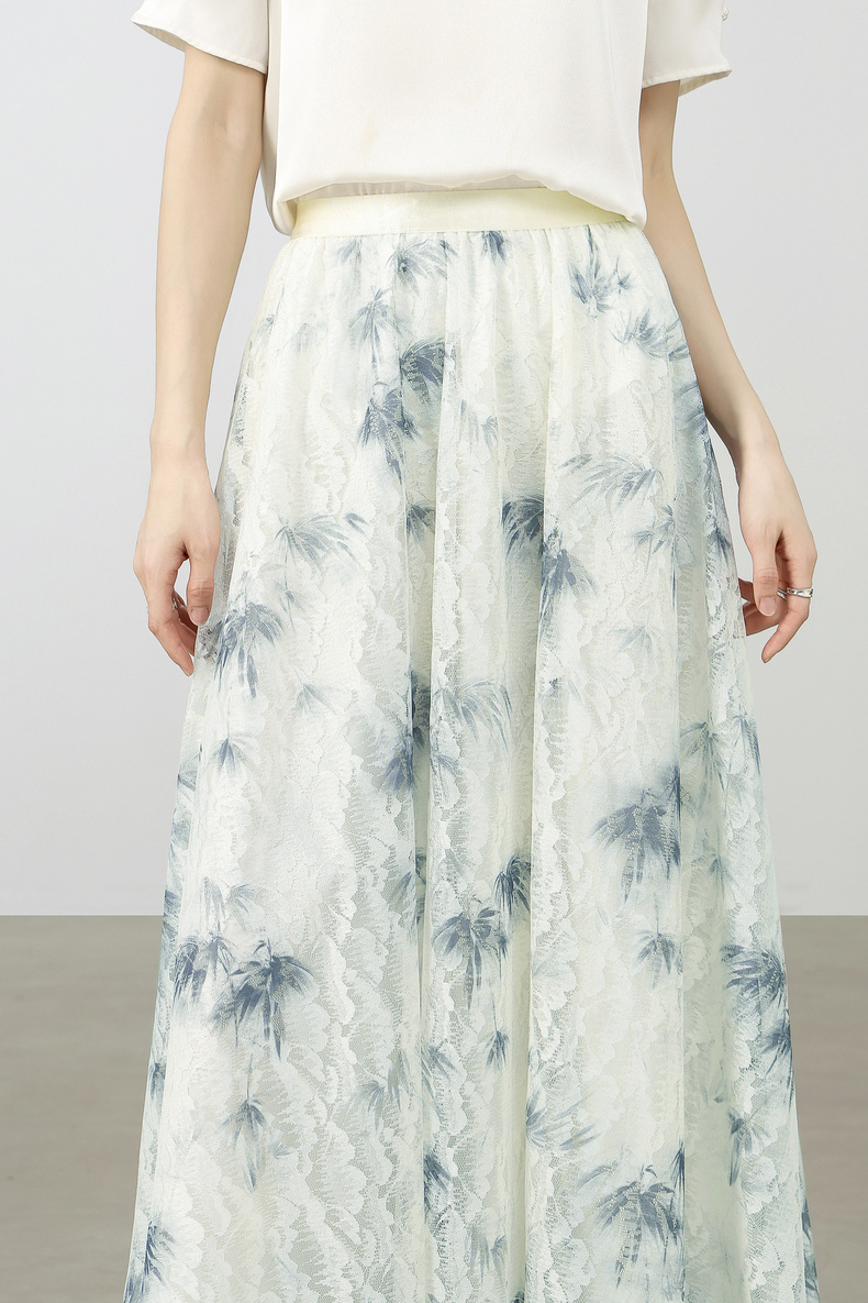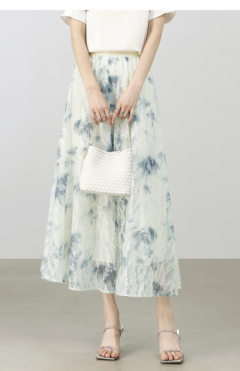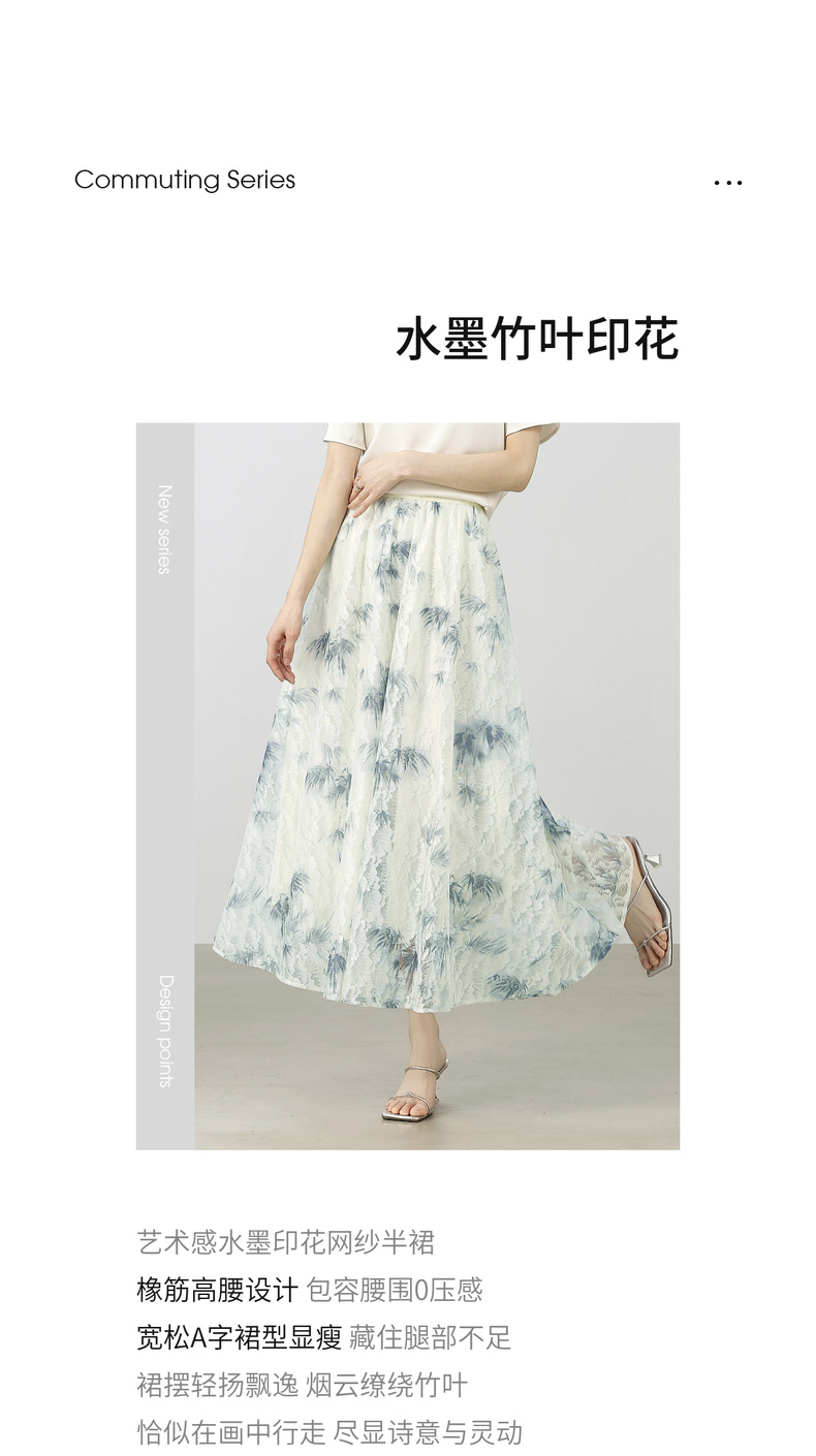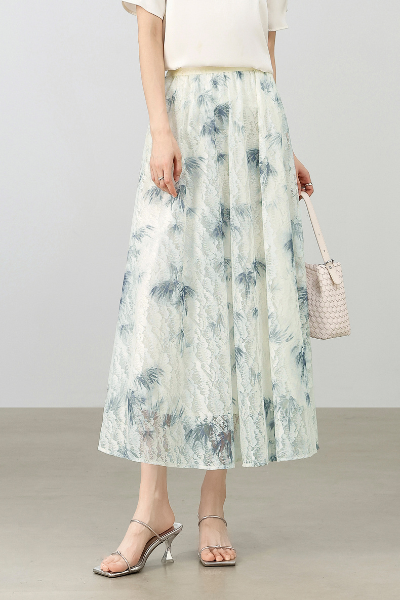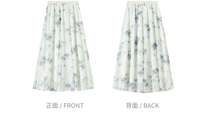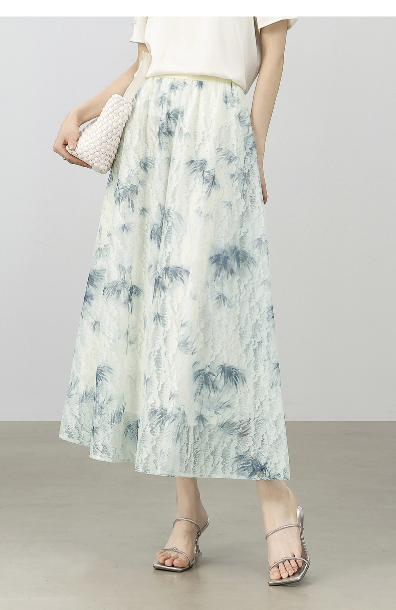 【内购】【遮肉显瘦】优雅松紧高腰艺术水墨竹叶印花宽松A字网纱裙半身裙-W53QA2698