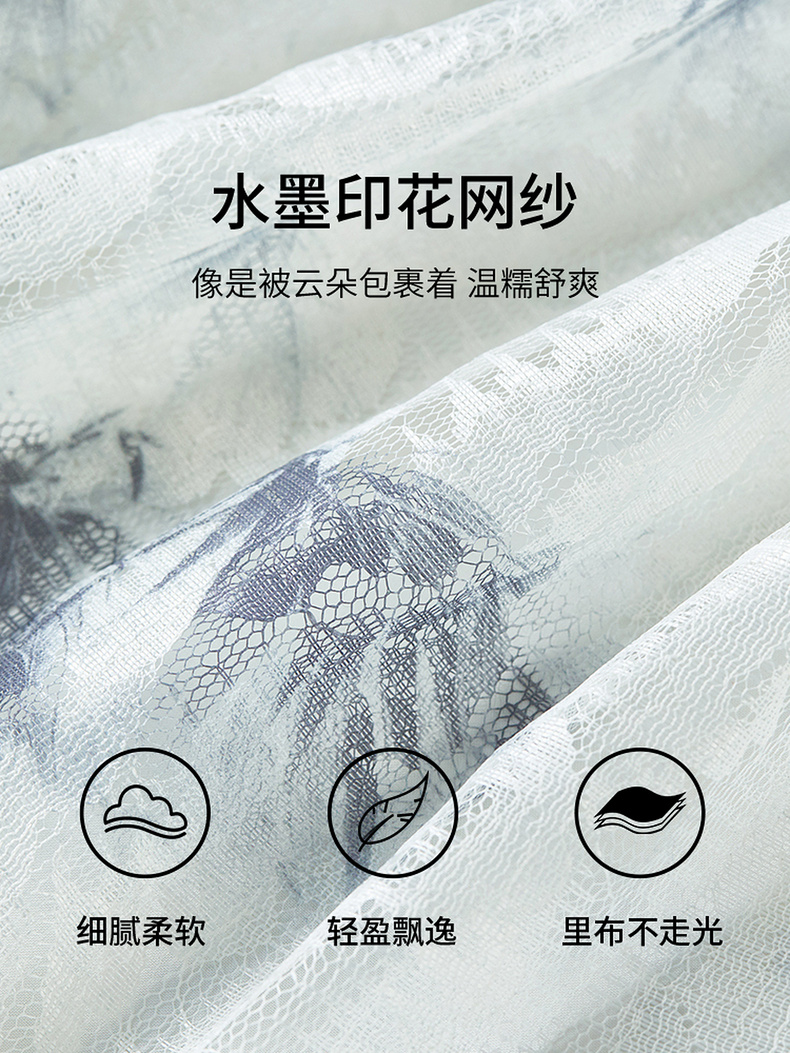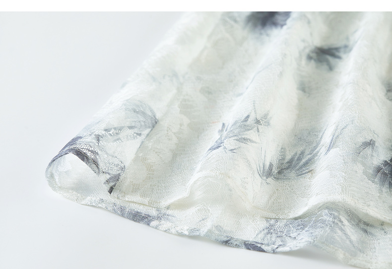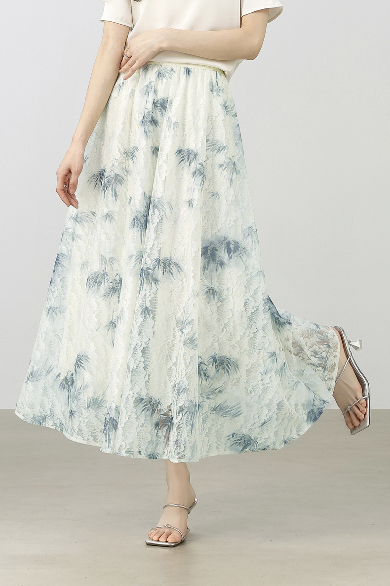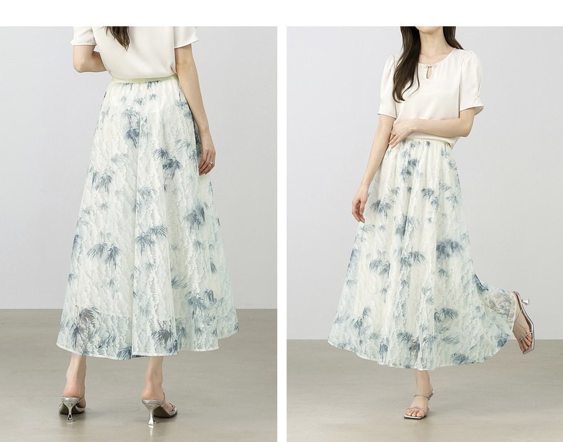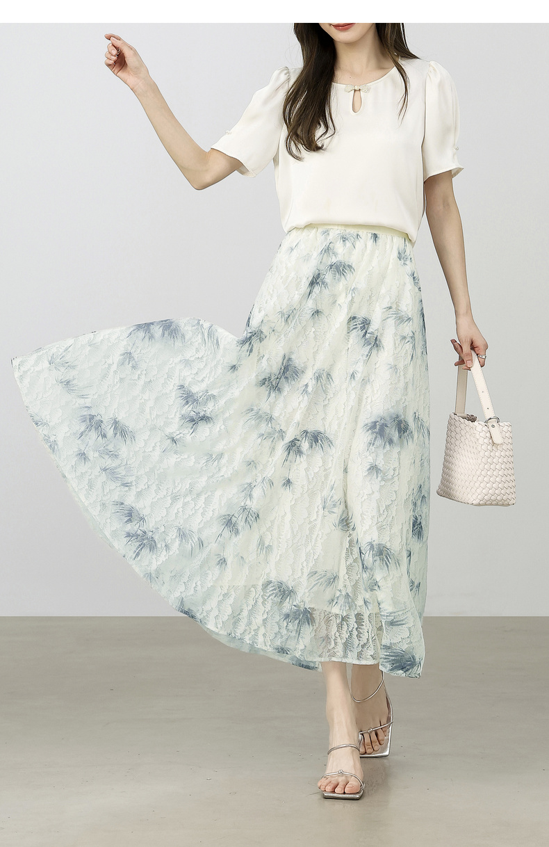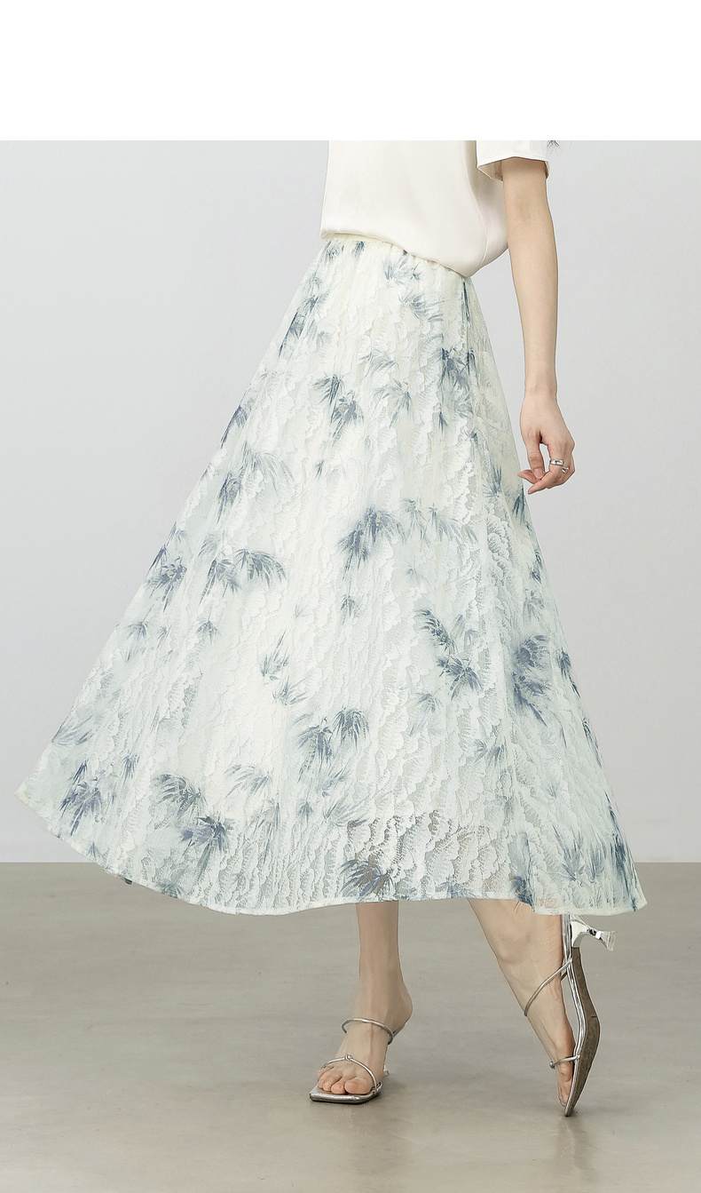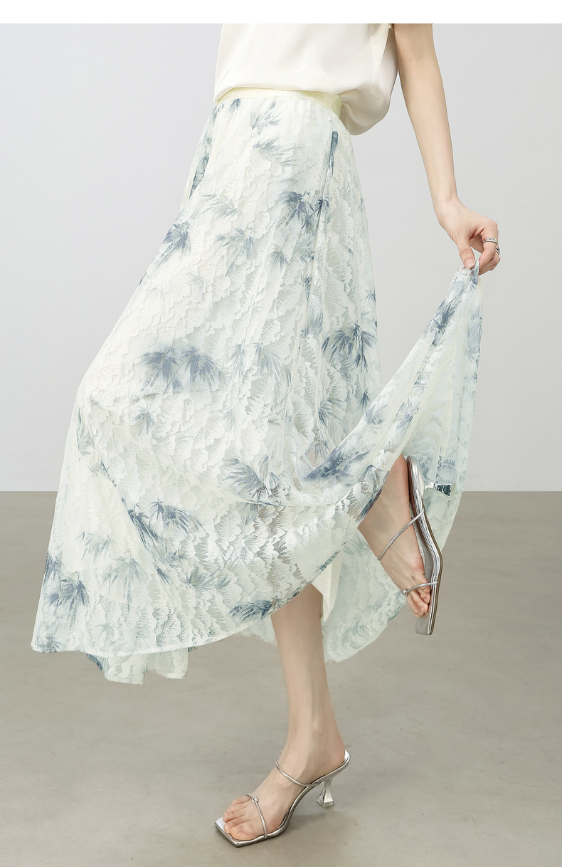 【内购】【遮肉显瘦】优雅松紧高腰艺术水墨竹叶印花宽松A字网纱裙半身裙-W53QA2698