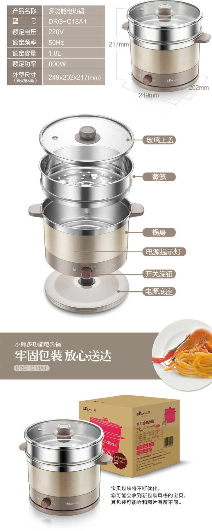 小熊(Bear)多功能电热锅 电热杯学生宿舍电煮锅煮面电火锅电锅DRG-C18A1