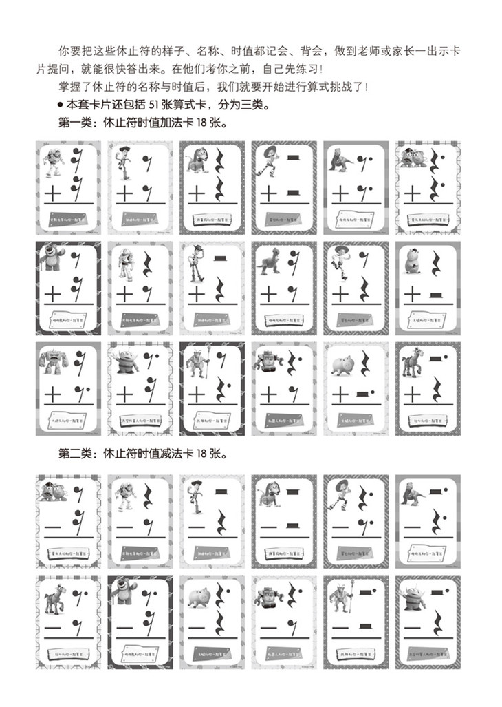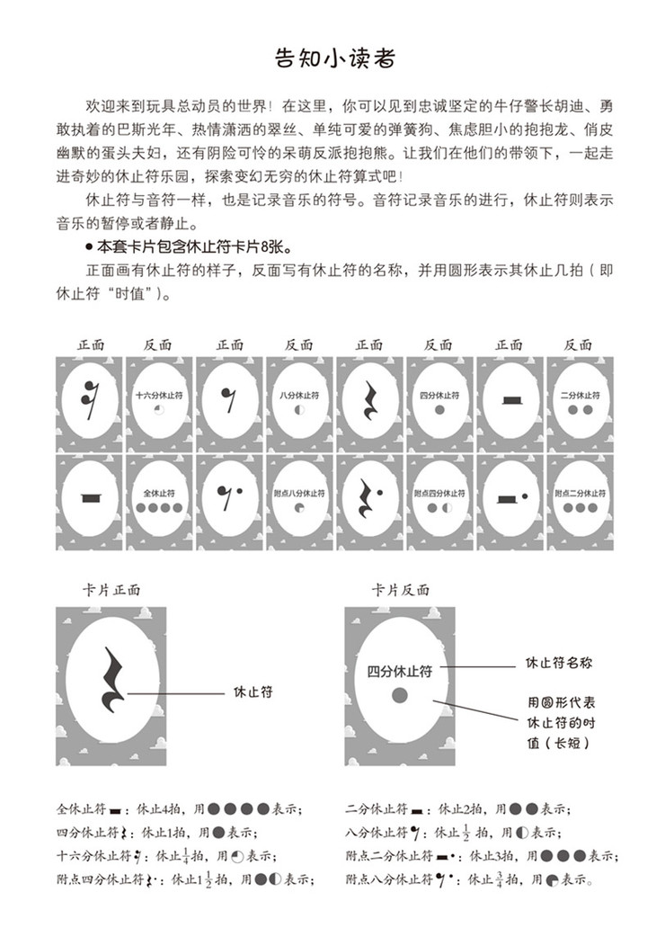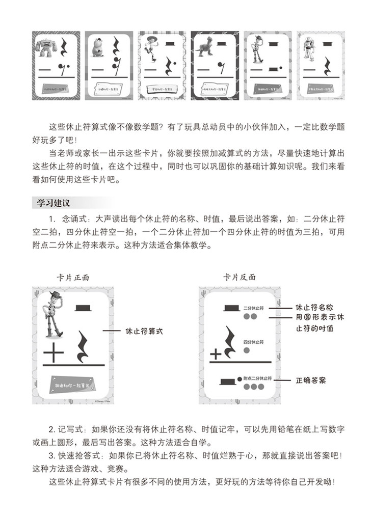 该系列为幼儿音乐启蒙学具,将音符、休止符等基本乐理知识以卡片式游戏形式配以迪士尼经典卡通形象共同呈现。让小朋友在游戏中认识音符、休止符,以及音符、休止符时值的加减计算,寓教于乐。设计风格亮丽醒目,人物形象生动可爱。适合音乐初学者、音乐启蒙老师以及琴童家长使用。