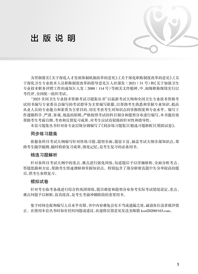 《2025全国卫生专业技术资格考试习题集丛书》以最新考试大纲和全国卫生专业技术资格考试用书编写专家委员会编写的考试指导为依据,编写工作遵循科学、严谨、客观、规范的原则,严格按照实际考试的科目划分和题型分布进行编写,切实考查考生对知识点的掌握程度和专业水平,本套习题集丛书包括《同步练习题集》、《精选习题集》和《模拟试卷》,能够有效帮助考生考前复习、自测和反馈学习成果。同步练习题集针对考试大纲各科目编写针对性练习,题型全面,题量丰富,涵盖考试大纲的所有知识点,并着重突出重点、难点,帮助考生随学随测,检测学习成果,强化记忆,是考生复习强化的必备用书。