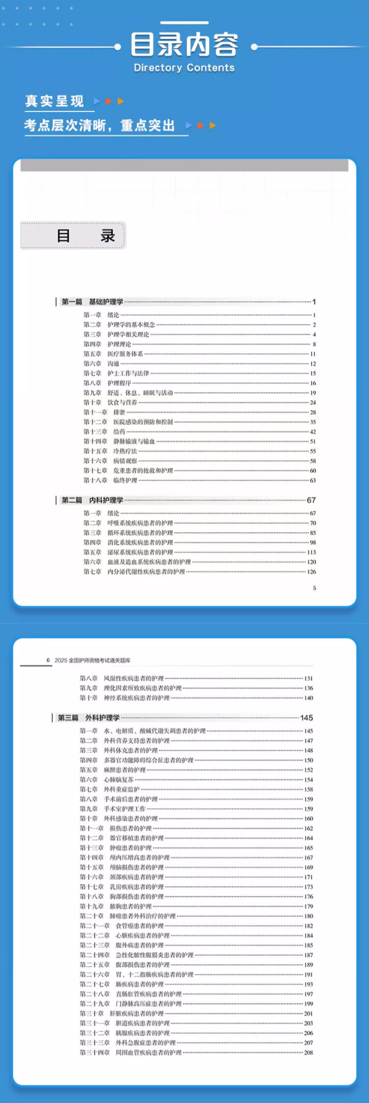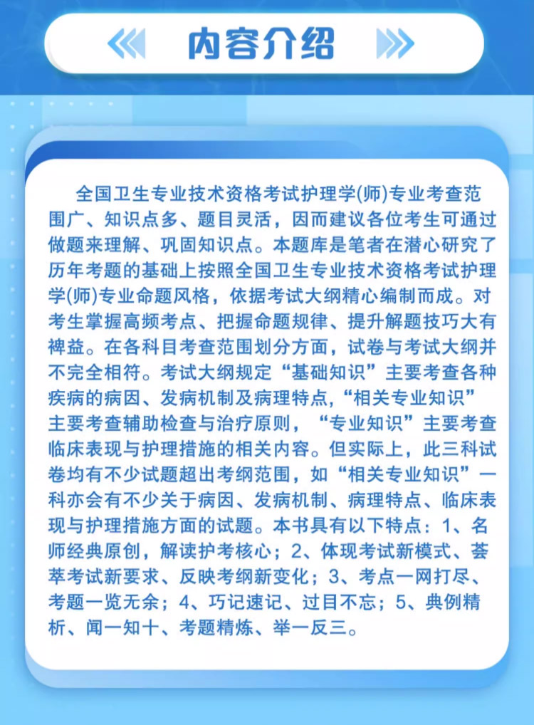 主编多年来一直从事护理教学工作,深谙护士执业资格考试、护理学专业技术资格考试的出题规律及命题特点,有丰富的教学经验和图书编写经验。主编在悉心研究、总结归纳近10年考题,以《全国卫生专业技术资格考试 护理学(师)》为蓝本,将历年考题按章节整理,帮助考生考前了解考试、熟悉题型、培养思维、掌握考点、顺利过关。本书具有重点把握精准、难点分析到位、题型题量贴切、模拟演练逼真等特点。本书对考试大纲中知识点与考试科目系统结合,覆盖大纲中所涉及的高频考点,具有较好的系统性。