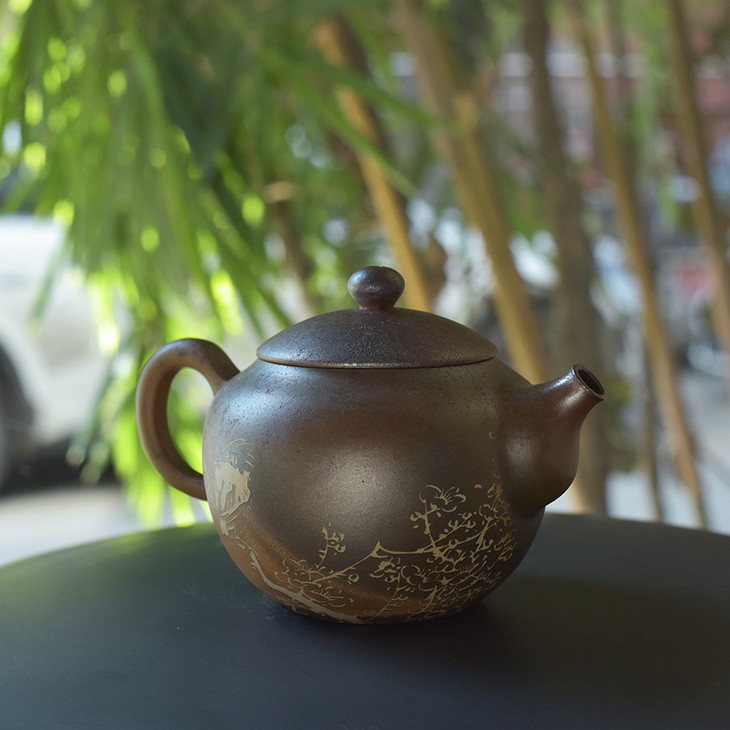 柴烧浴火,书画为饰,因了建水陶独有的刻填工艺,田记所出之器,古拙、肃穆、天真,灵动逸纵之趣跃然于器,用花鸟装饰,意境深远,别具一格,形成了独有的艺术效。使用上等建水紫陶全手工古法制泥,经年陈腐,全手工慢轮制作,反复精修,历长时干坯,传统龙窑七天高温柴烧而成。