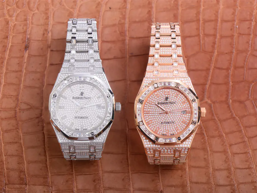 TZ爱彼皇家橡树系列15452男装满天星钻表新款(区别于老款:1、侧面有钻;2、表带镶嵌大颗方钻;3、条丁刻度;4、内置LOGO。),手工镶嵌1000多颗莫桑钻(硬度和光泽与金刚石最相似的硅物质,需用至少10倍的放大镜观察其内含物来辨别),搭载进口9015机芯改原装3120自动机械机芯,走时稳定寿命较长,男装尺寸41mmX10mm(女装37mm开发中),防刮蓝宝石镜面,身份与财富最好的缩影。TZ工厂每一支腕表都赠送香港太子钟表行皮套。
