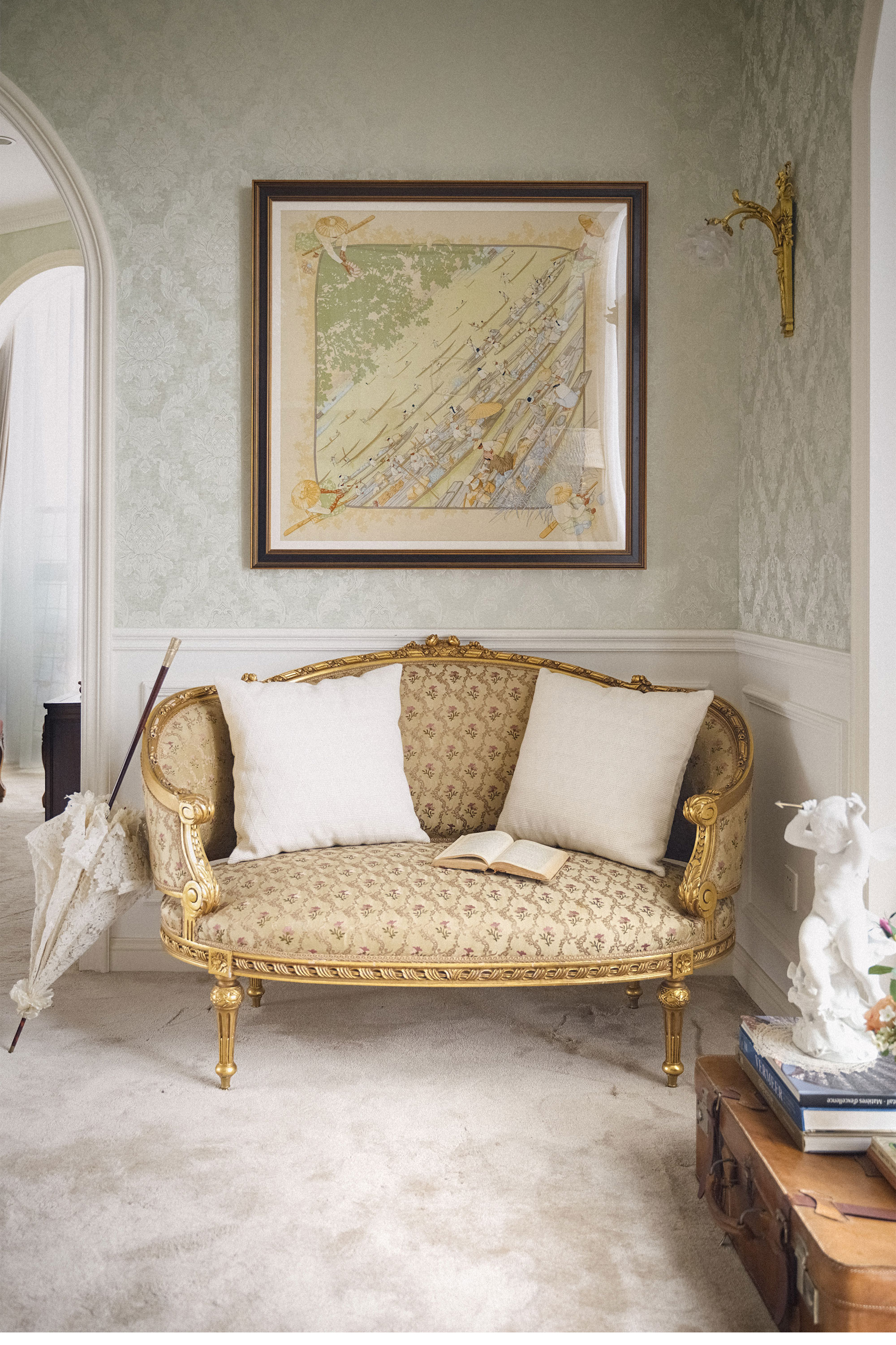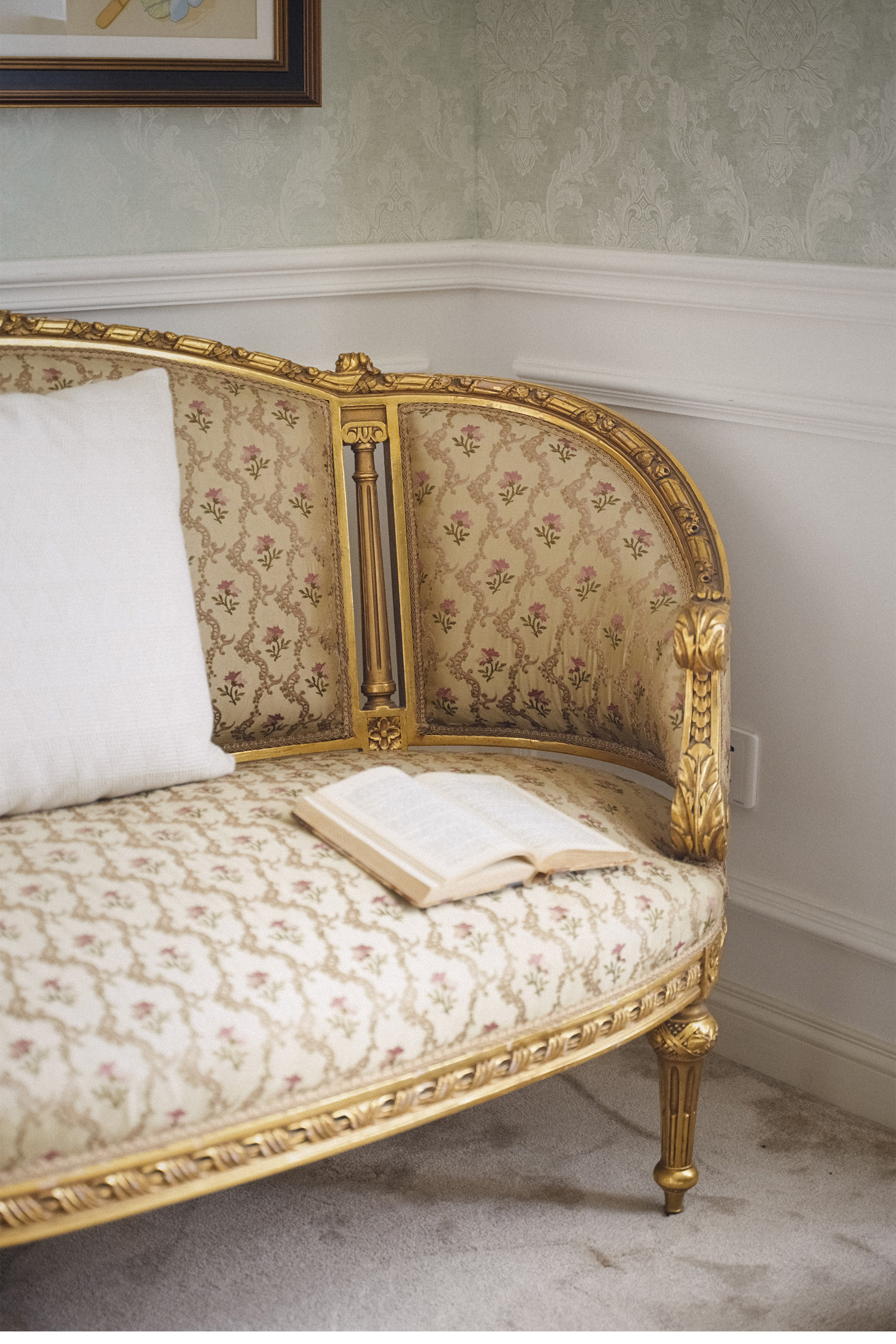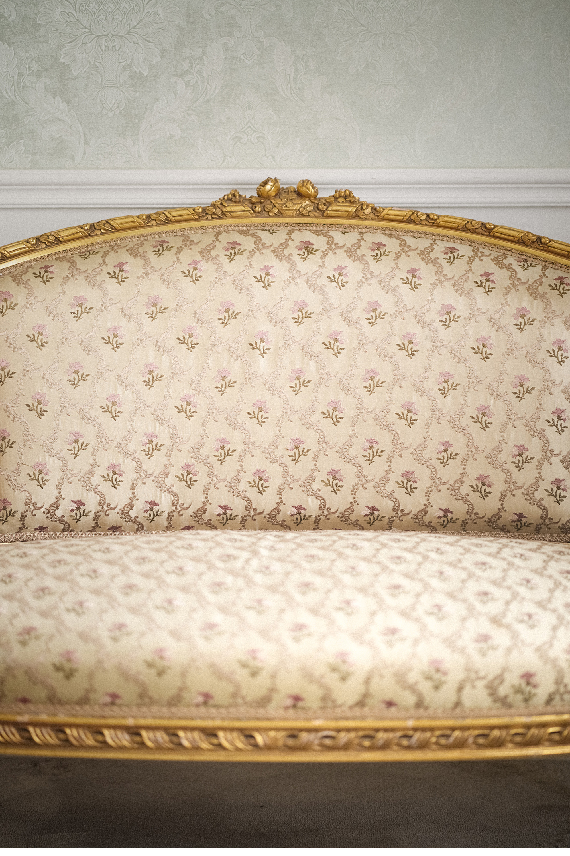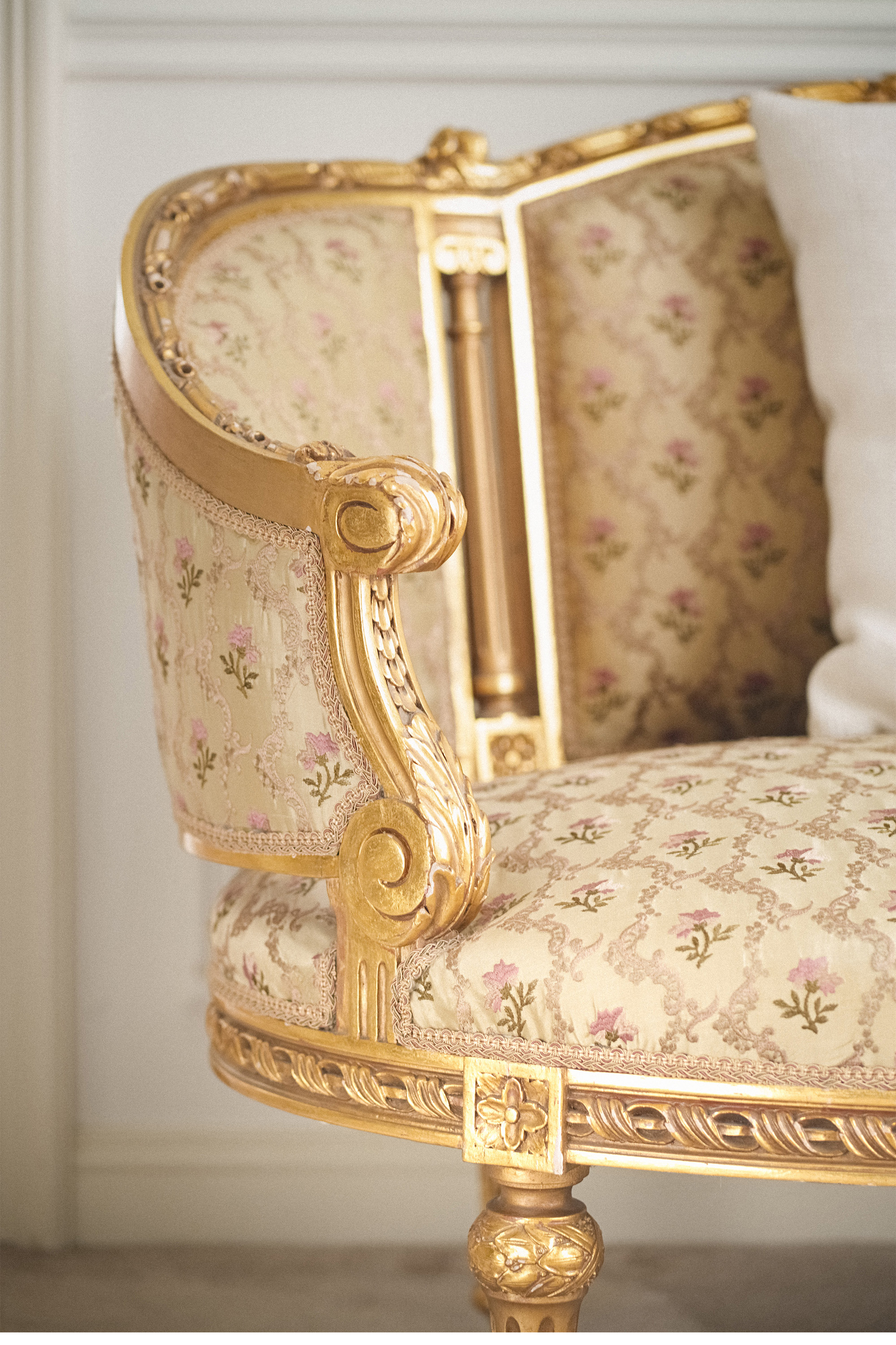 19世纪法国出品路易十六风格木鎏金装饰花卉缎面靠背沙发