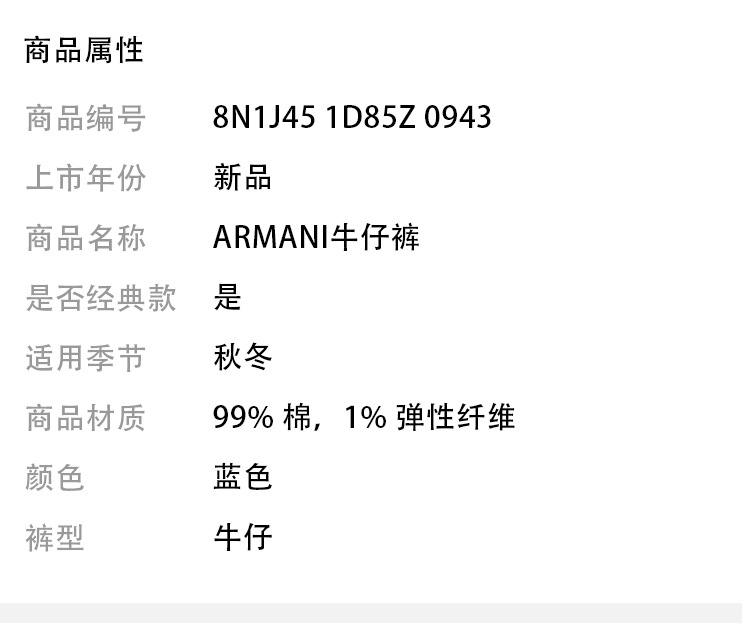 EMPORIO ARMANI 阿玛尼 男士牛仔裤 蓝色 8N1J45 1D85Z 0943