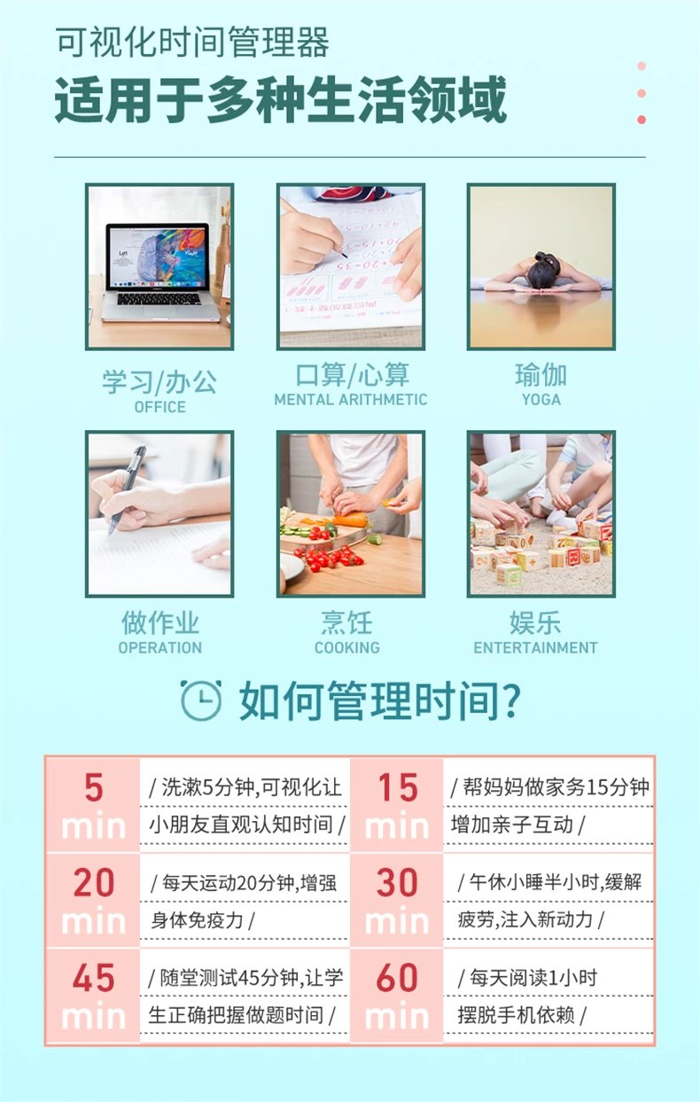 因为家里的孩子做作业的时候,老是东张西望的,好多家长就买这个可视化计时器 回家 孩子可以随着蓝色面积的变少,感受到时间的变化,现在写作业学习的时候,注意力集中多了,赞!!