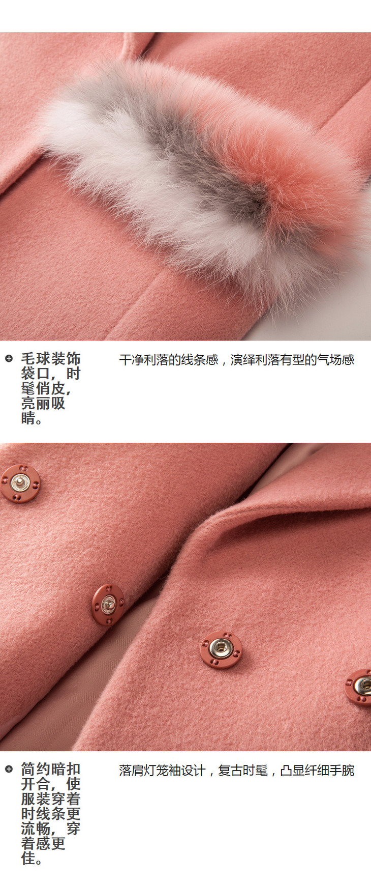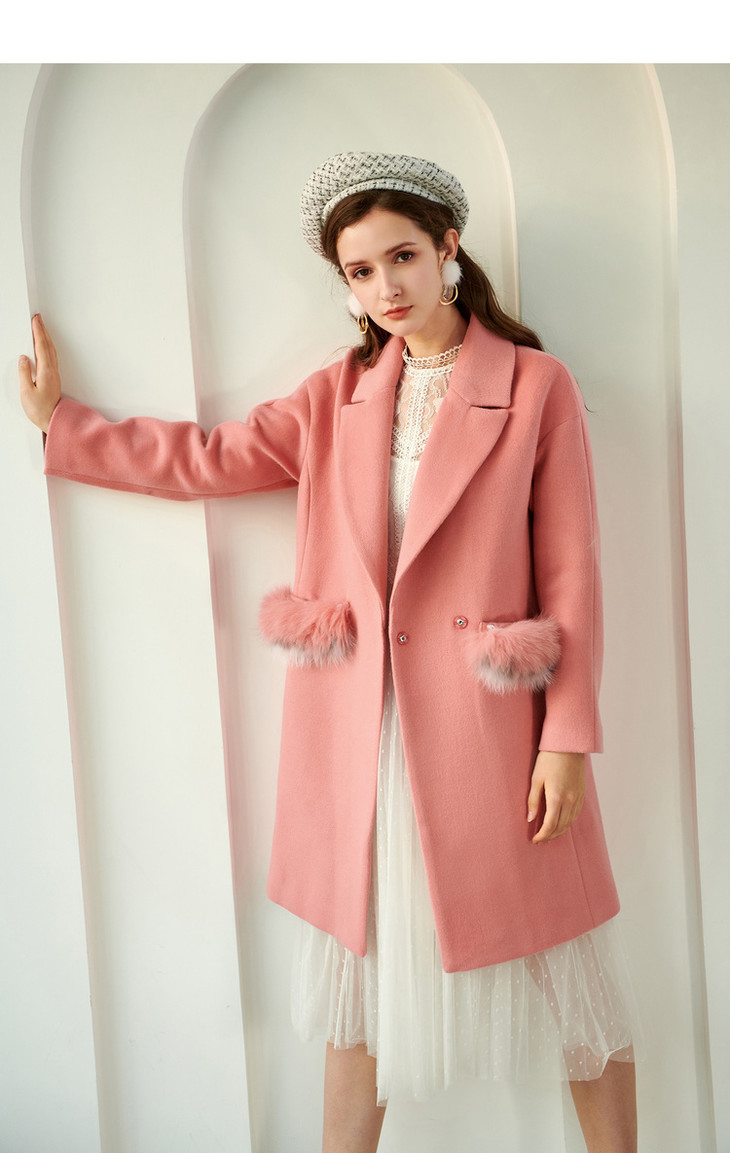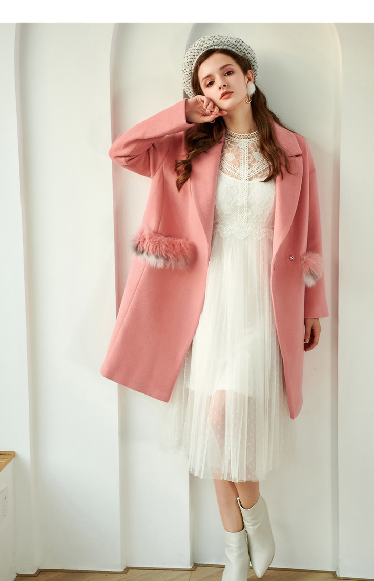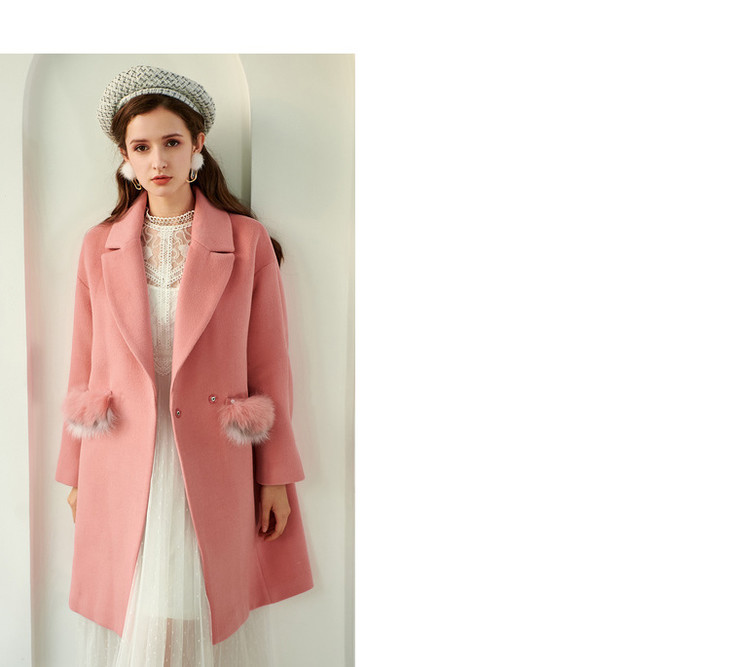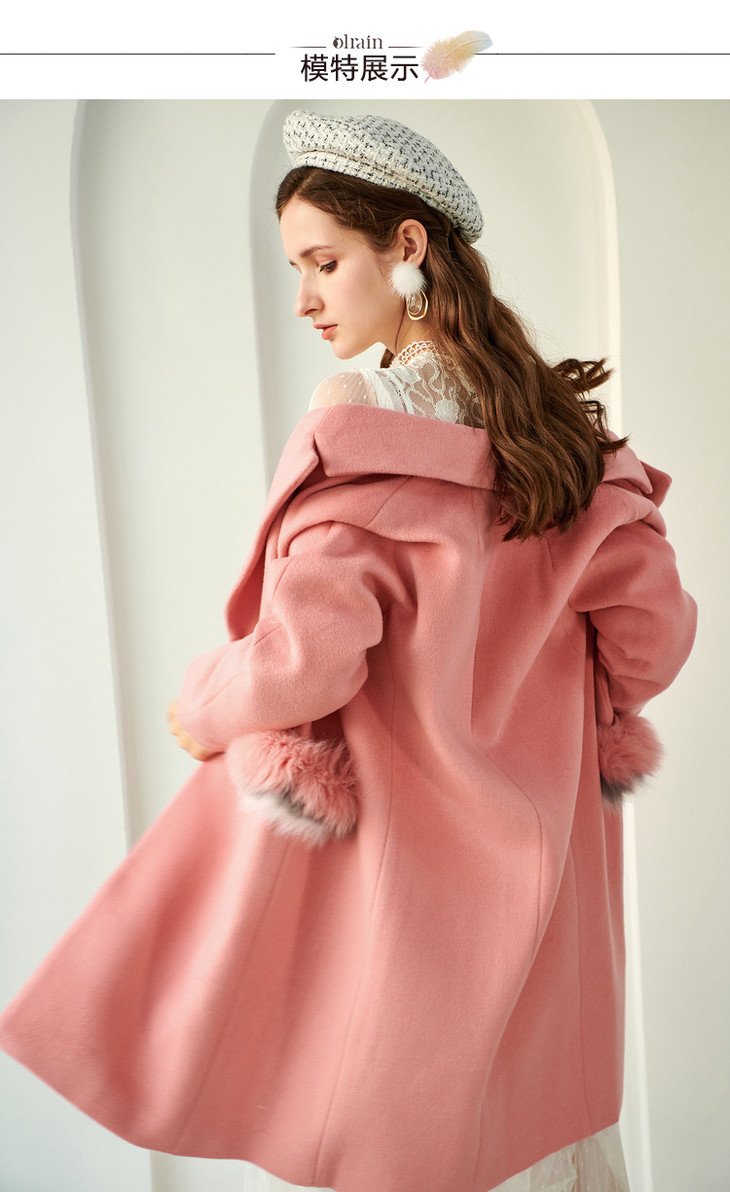 欧芮儿2019秋翻领呢子大衣女长袖粉色毛呢外套女中长款