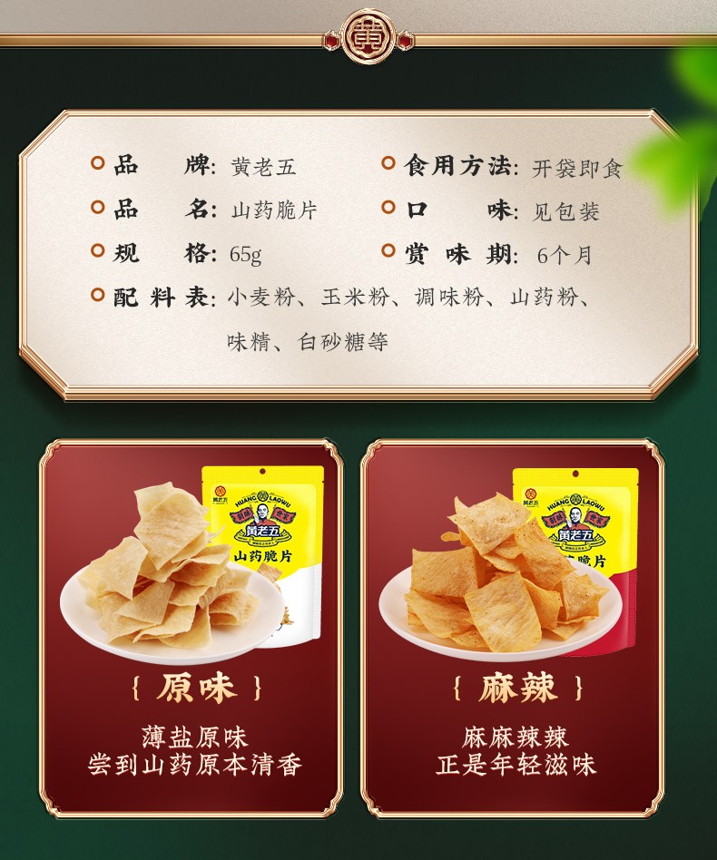 【分仓直发包邮】黄老五山药脆片65g*8袋(原味/香辣混合发货)