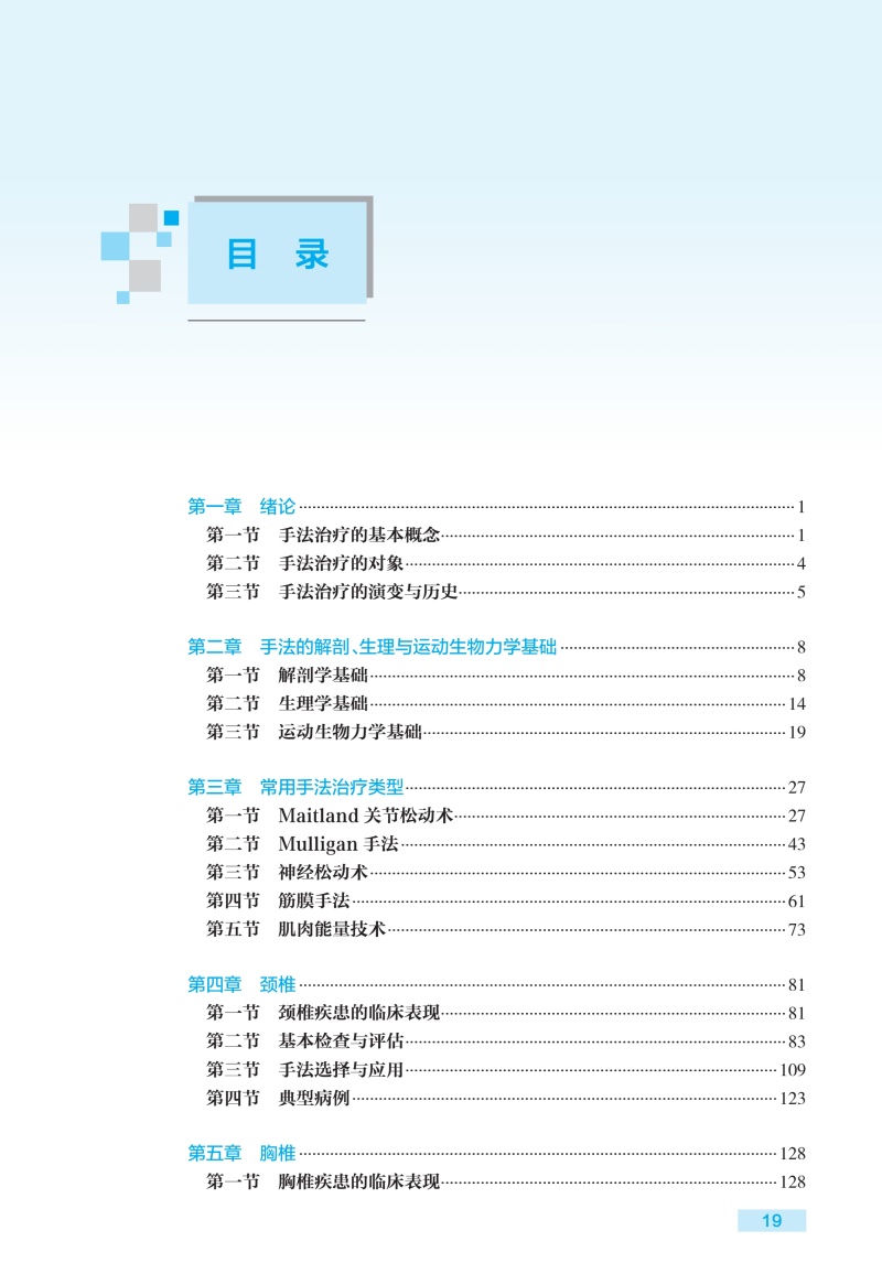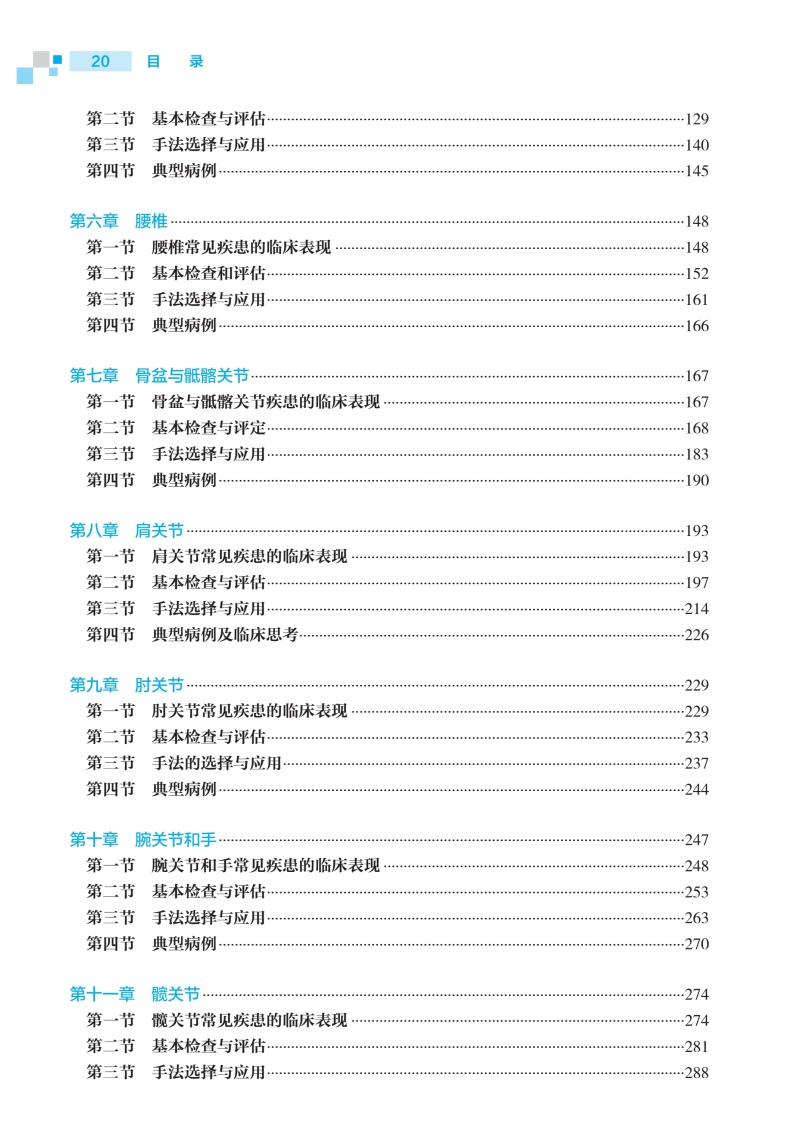 第一章绪论/1 第一节手法治疗的基本概念/1 第二节手法治疗的对象/4 第三节手法治疗的演变与历史/5 第二章手法的解剖、生理与运动生物力学基础/8 第一节解剖学基础/8 第二节生理学基础/14 第三节运动生物力学基础/19 第三章常用手法治疗类型/27 第一节Maitland关节松动术/27 第二节Mulligan手法/43 第三节神经松动术/53 第四节筋膜手法/61 第五节肌肉能量技术/73 第四章颈椎/81 第一节颈椎疾患的临床表现/81 第二节基本检查与评估/83 第三节手法选择与应用/109 第四节典型病例/123 第五章胸椎/128 第一节胸椎疾患的临床表现/128 第二节基本检查与评估/129 第三节手法选择与应用/140 第四节典型病例/145 第六章腰椎/148 第一节腰椎常见疾患的临床表现/148 第二节基本检查和评估/152 第三节手法选择与应用/161 第四节典型病例/166 第七章骨盆与骶髂关节/167 第一节骨盆与骶髂关节疾患的临床表现/167 第二节基本检查与评定/168 第三节手法选择与应用/183 第四节典型病例/190 第八章肩关节/193 第一节肩关节常见疾患的临床表现/193 第二节基本检查与评估/197 第三节手法选择与应用/214 第四节典型病例及临床思考/226 第九章肘关节/229 第一节肘关节常见疾患的临床表现/229 第二节基本检查与评估/233 第三节手法的选择与应用/237 第四节典型病例/244 第十章腕关节和手/247 第一节腕关节和手常见疾患的临床表现/248 第二节基本检查与评估/253 第三节手法选择与应用/263 第四节典型病例/270 第十一章髋关节/274 第一节髋关节常见疾患的临床表现/274 第二节基本检查与评估/281 第三节手法选择与应用/288 第四节典型病例/300 第十二章膝关节/302 第一节膝关节常见疾患的临床表现/302 第二节基本检查与评估/308 第三节手法选择与应用/318 第四节典型病例及临床思考/333 第十三章踝关节与足/335 第一节踝关节与足部常见疾患的临床表现/335 第二节基本检查与评估/341 第三节手法选择与应用/346 第四节典型病例/351 第十四章内脏/354 第一节内脏常见疾患的临床表现/354 第二节基本检查与评估/355 第三节手法选择与应用/356 第四节典型病例及临床思考/364 第十五章颞下颌关节及头枕部/366 第一节颞下颌关节及头枕部常见疾患的临床表现/366 第二节基本检查与评估/367 第三节手法选择与应用/371 第四节典型病例/376