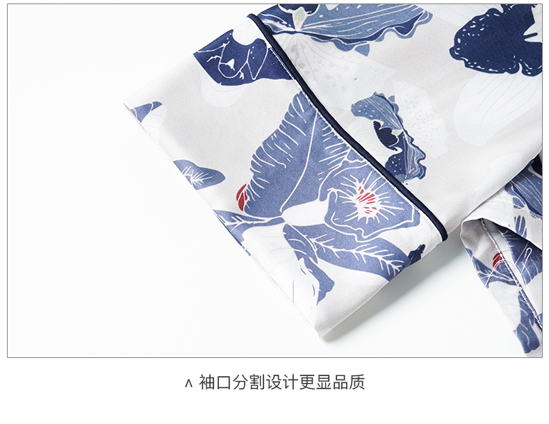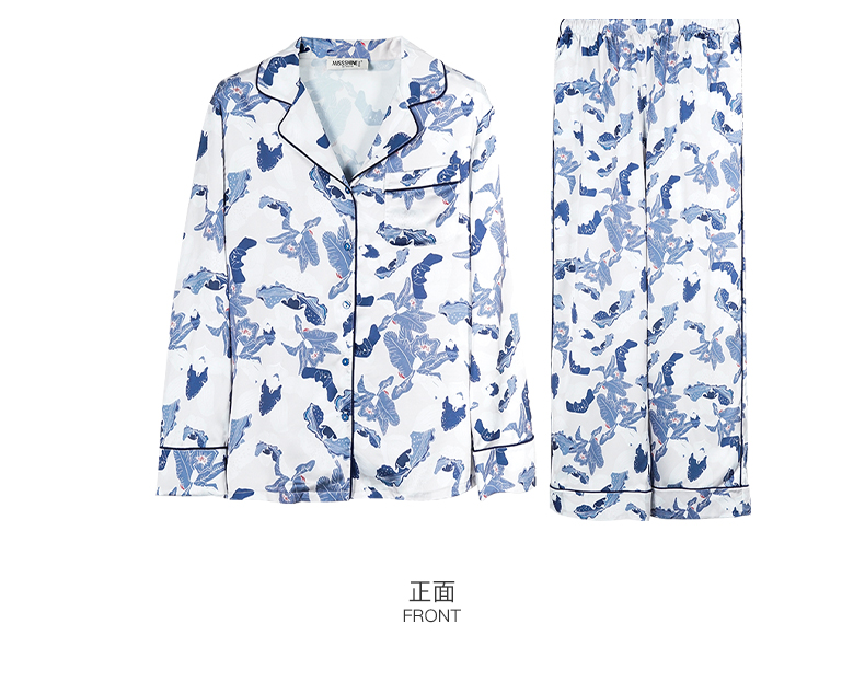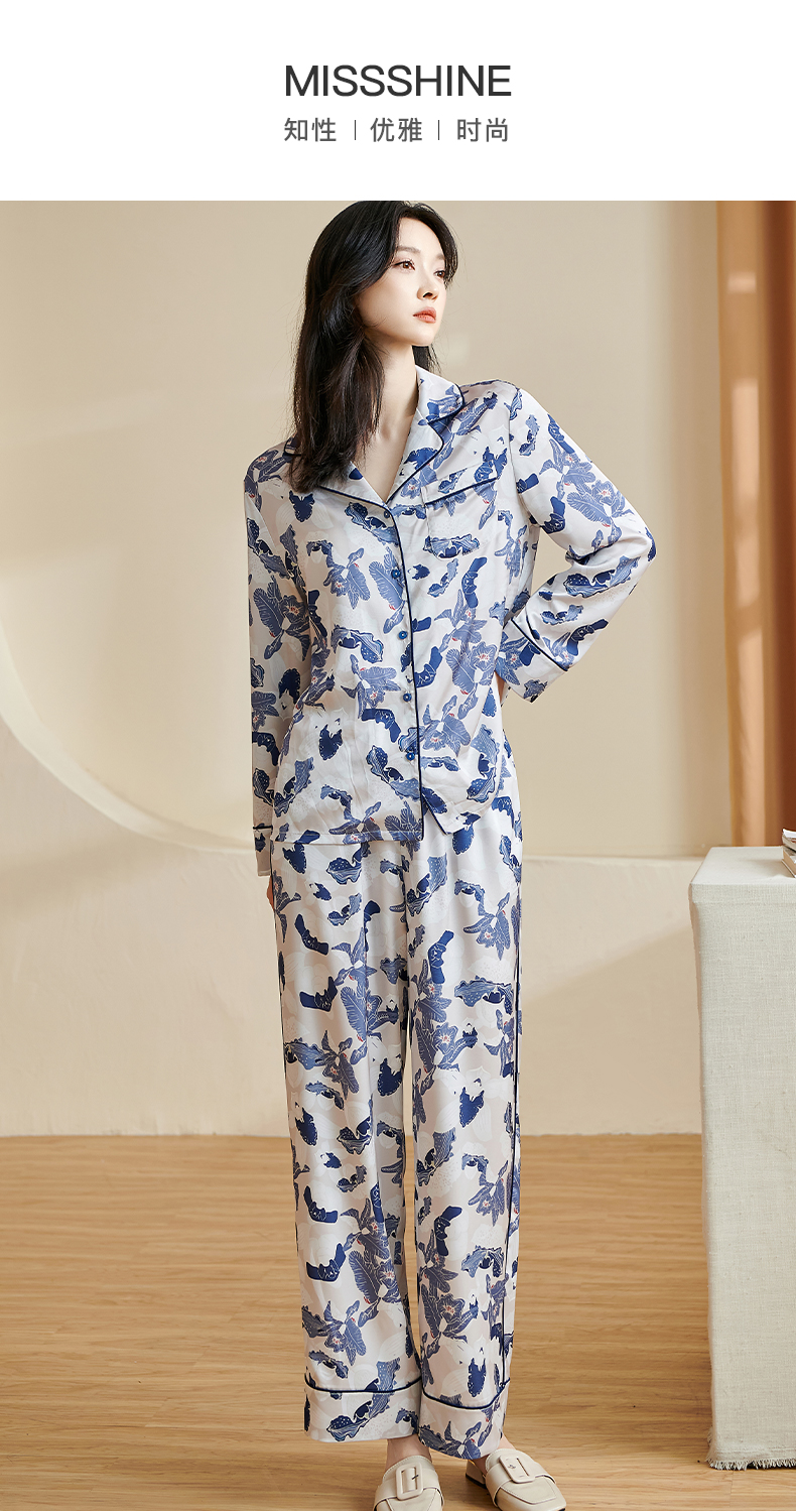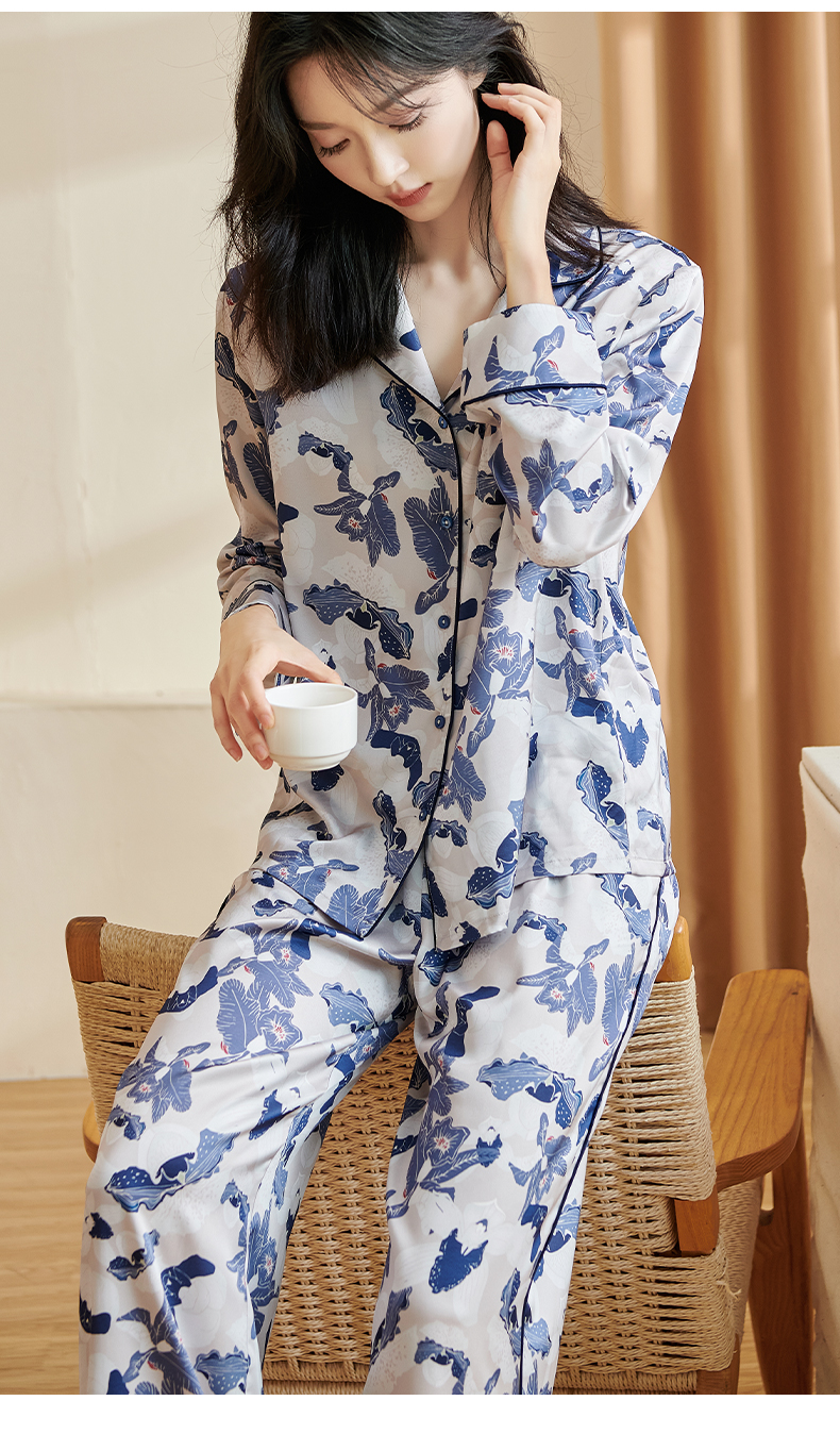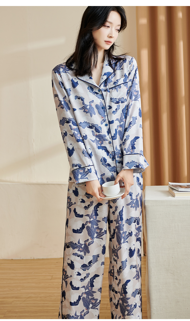 随性家居服套装 舒适仿真丝易打理 丝滑手感 亲肤透气 单排扣印花裤子两件套2699