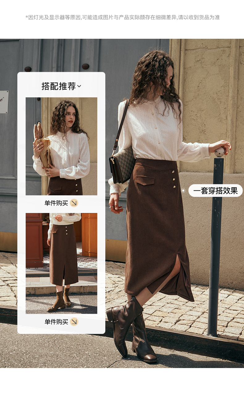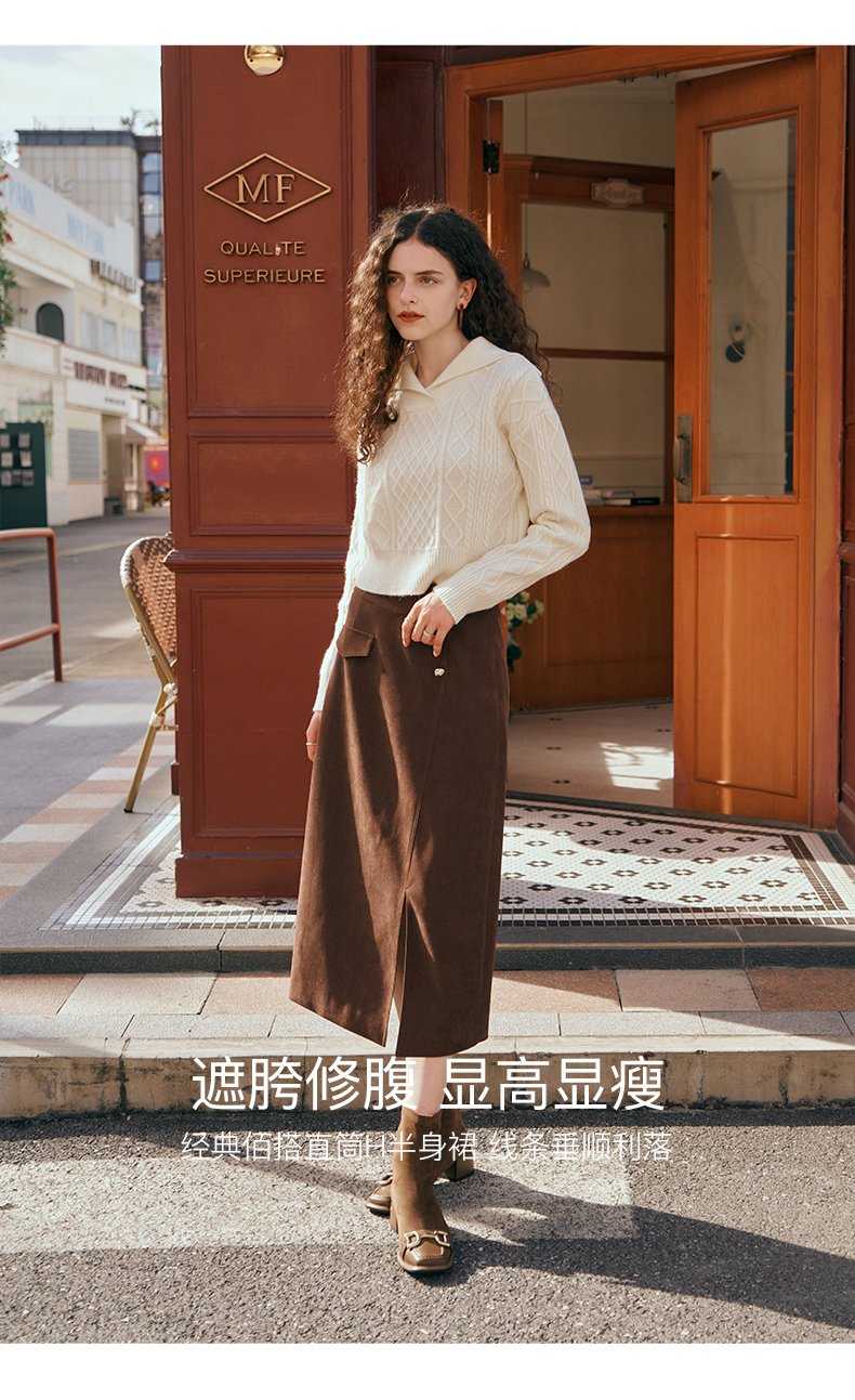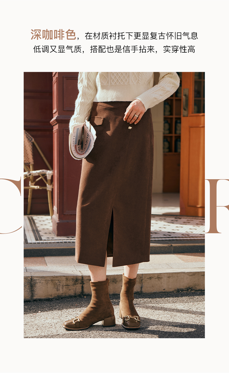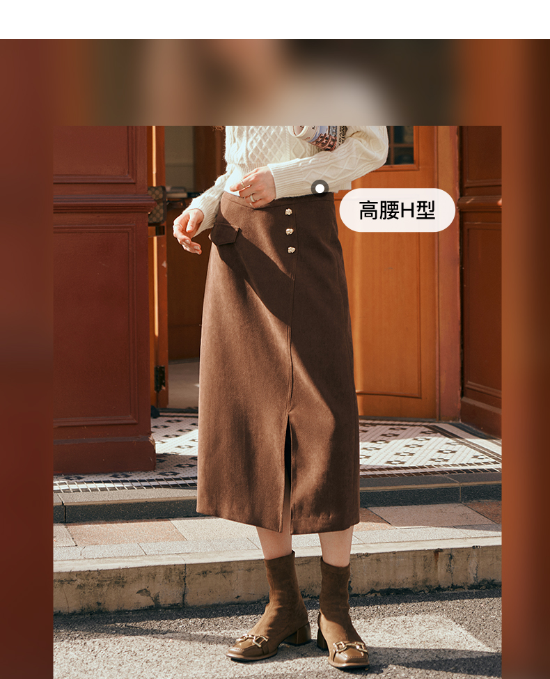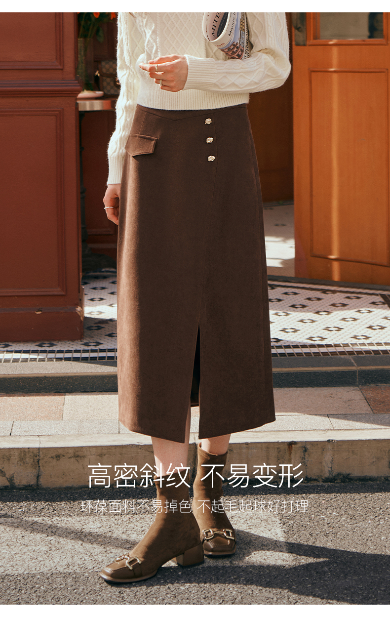 OLrain欧芮儿深咖啡色半身裙女初秋2023年新款高腰直筒百搭中长裙