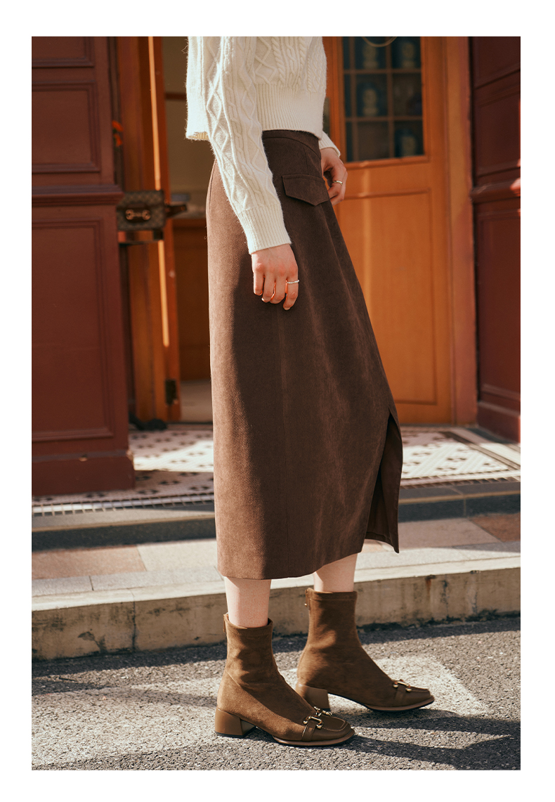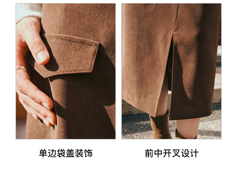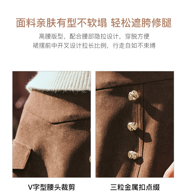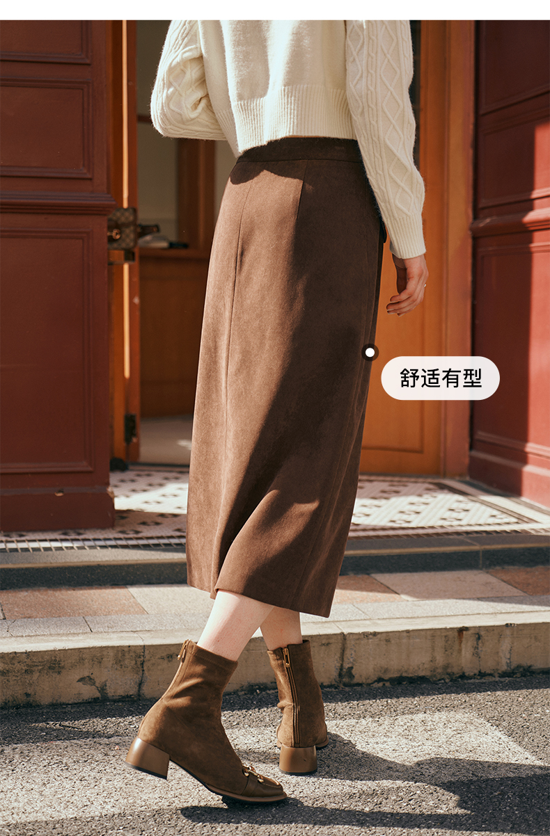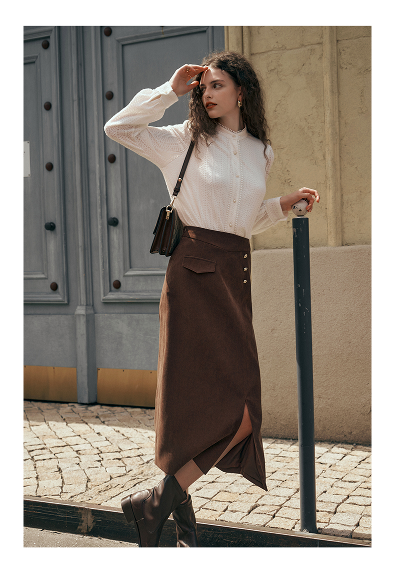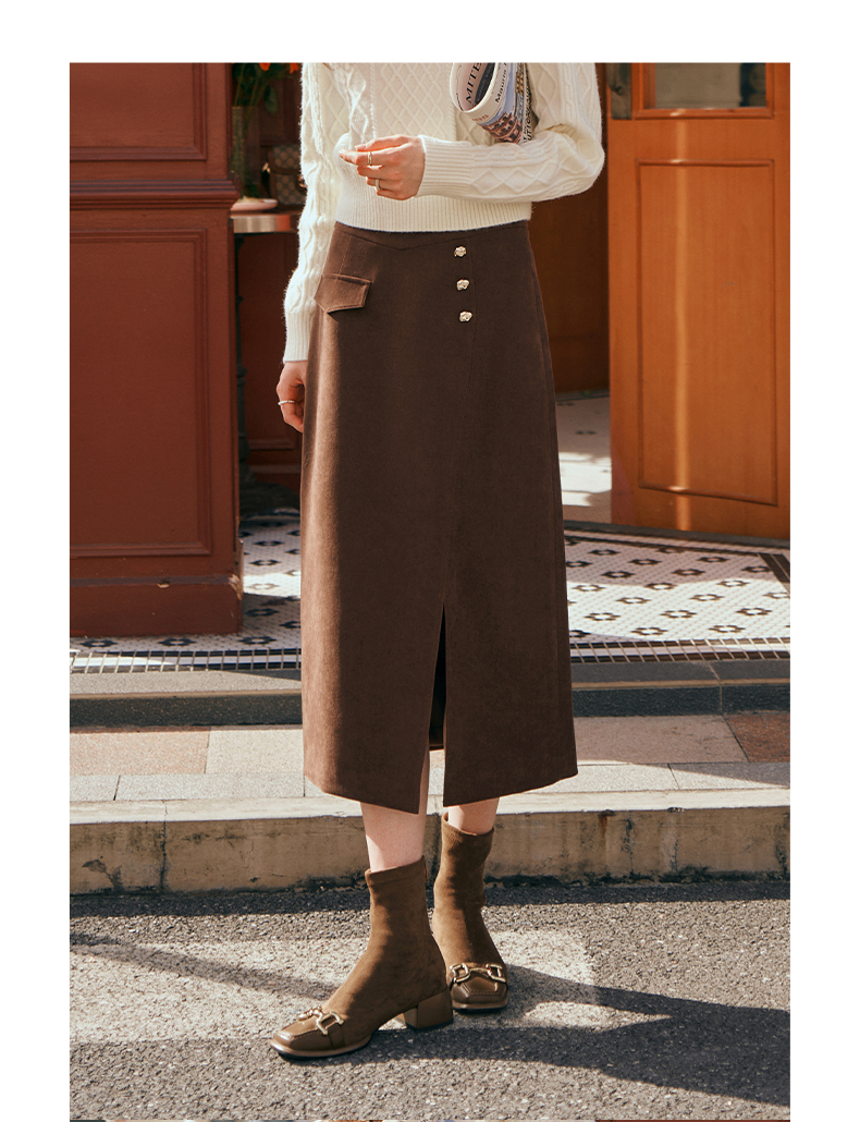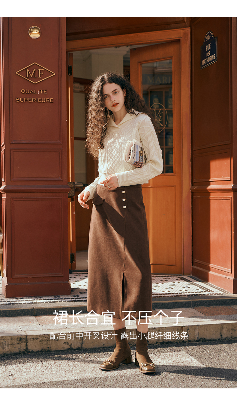 OLrain欧芮儿深咖啡色半身裙女初秋2023年新款高腰直筒百搭中长裙