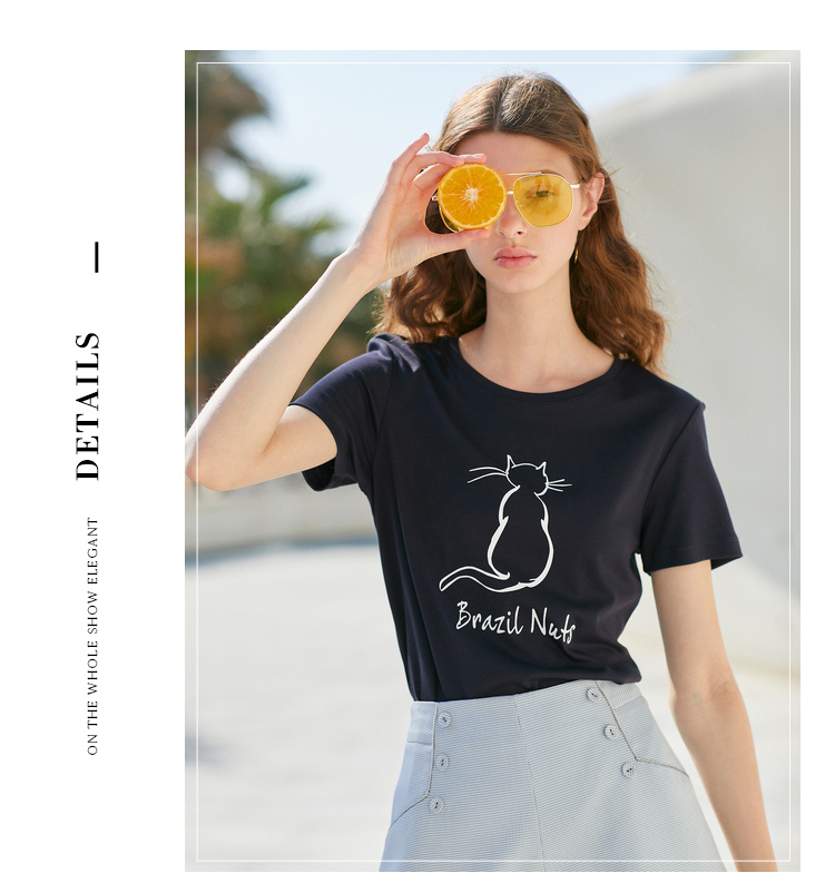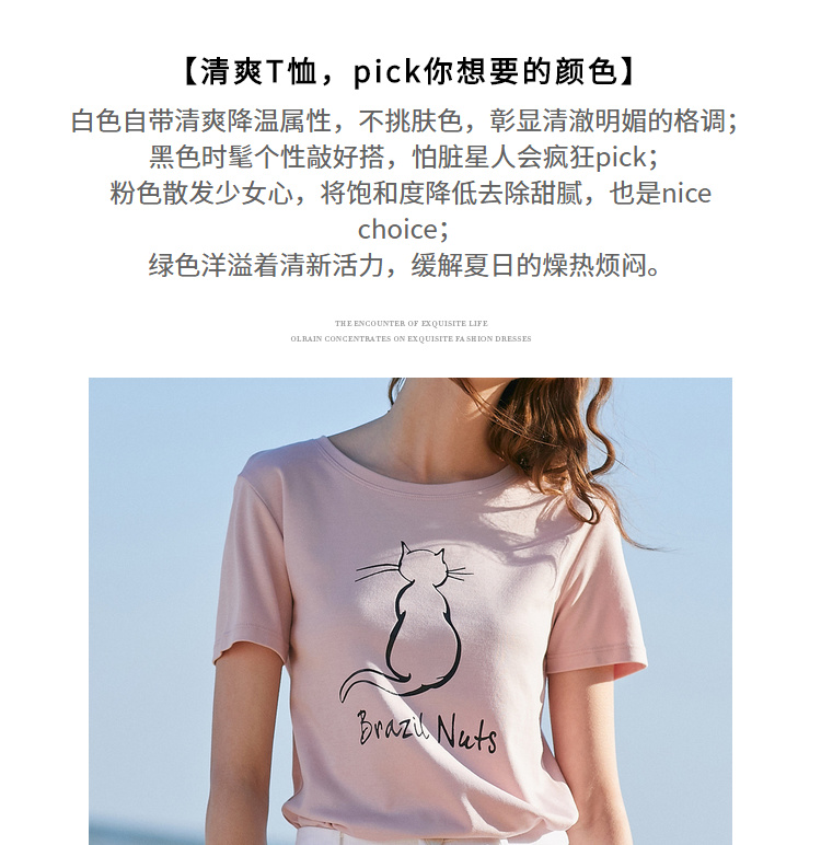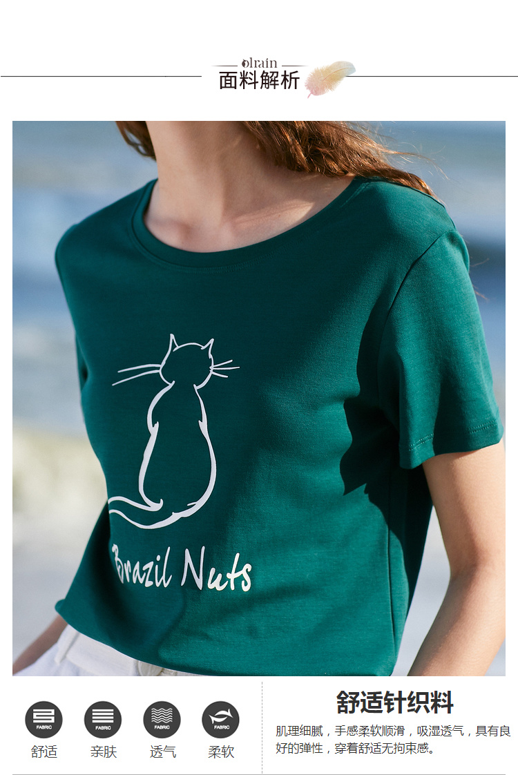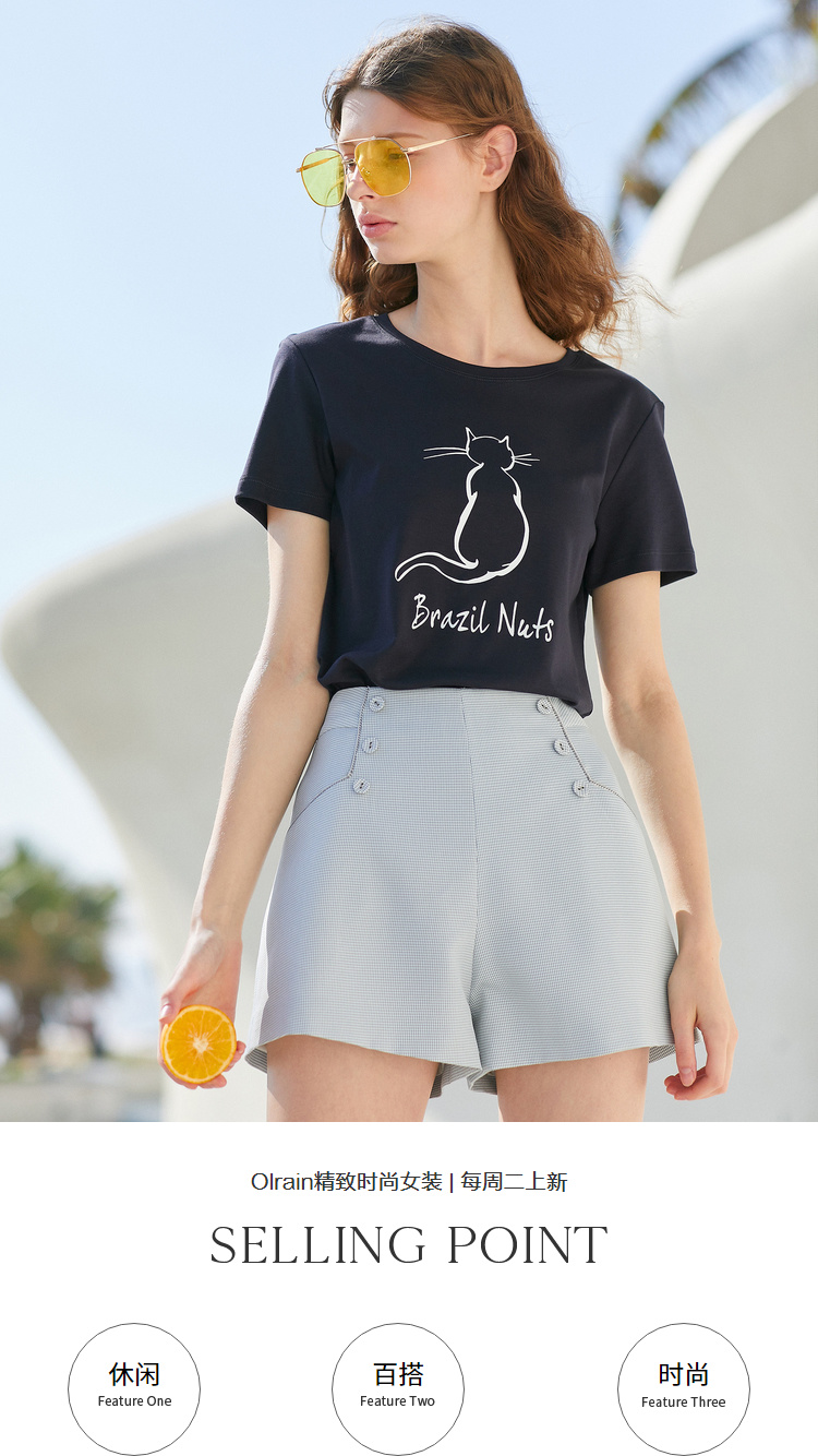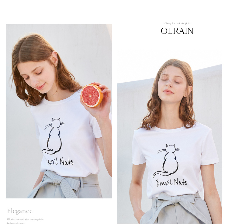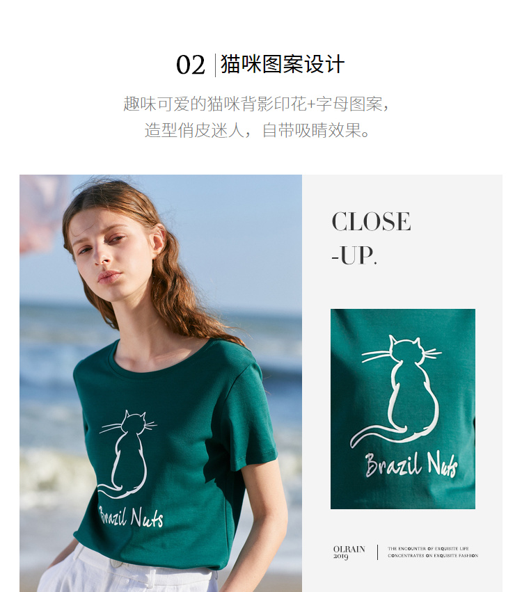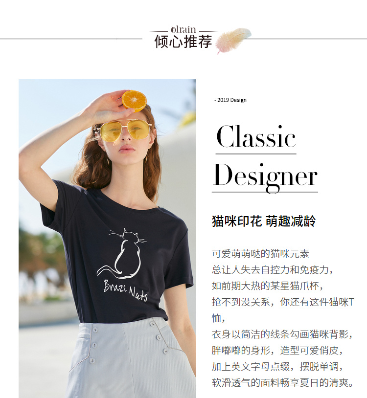 欧芮儿2021新款女装夏装黑色T恤女宽松猫咪字母印花短袖t恤女上衣