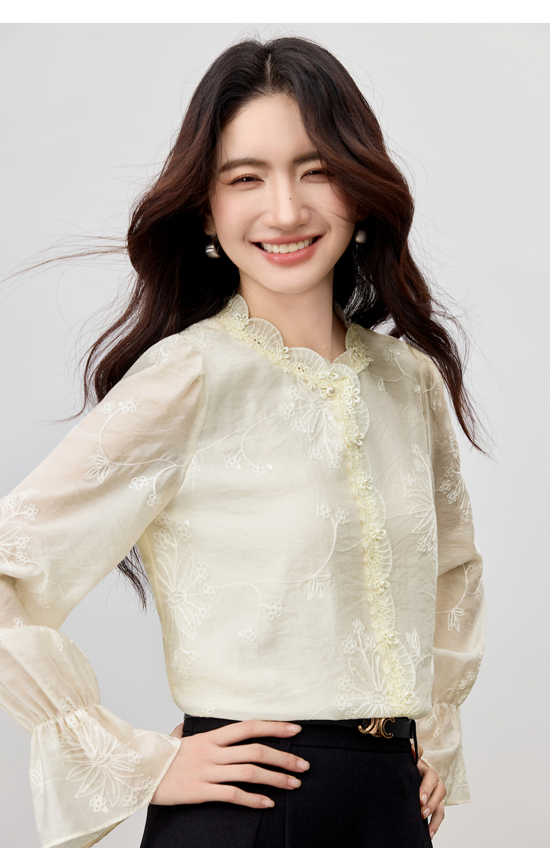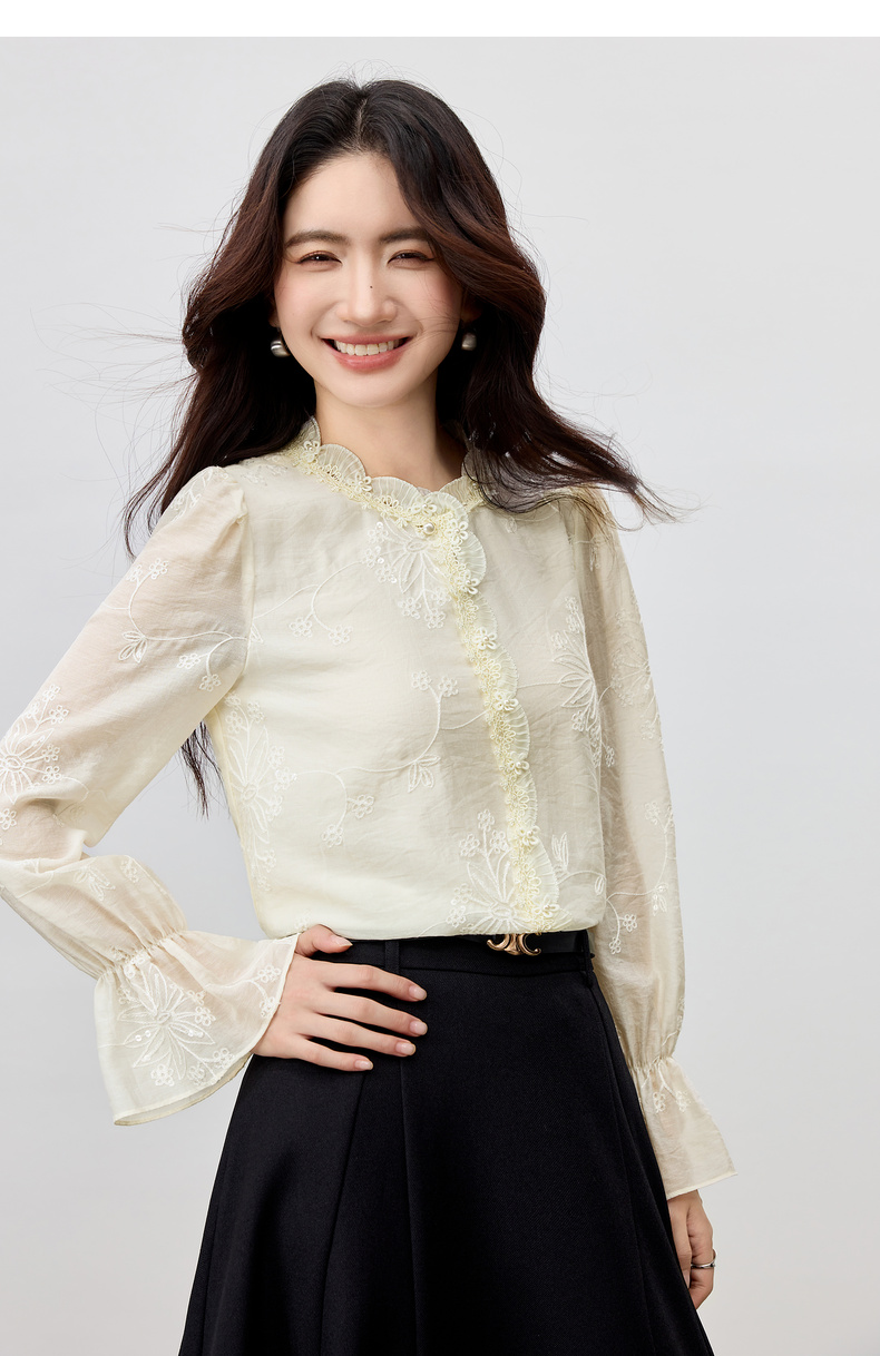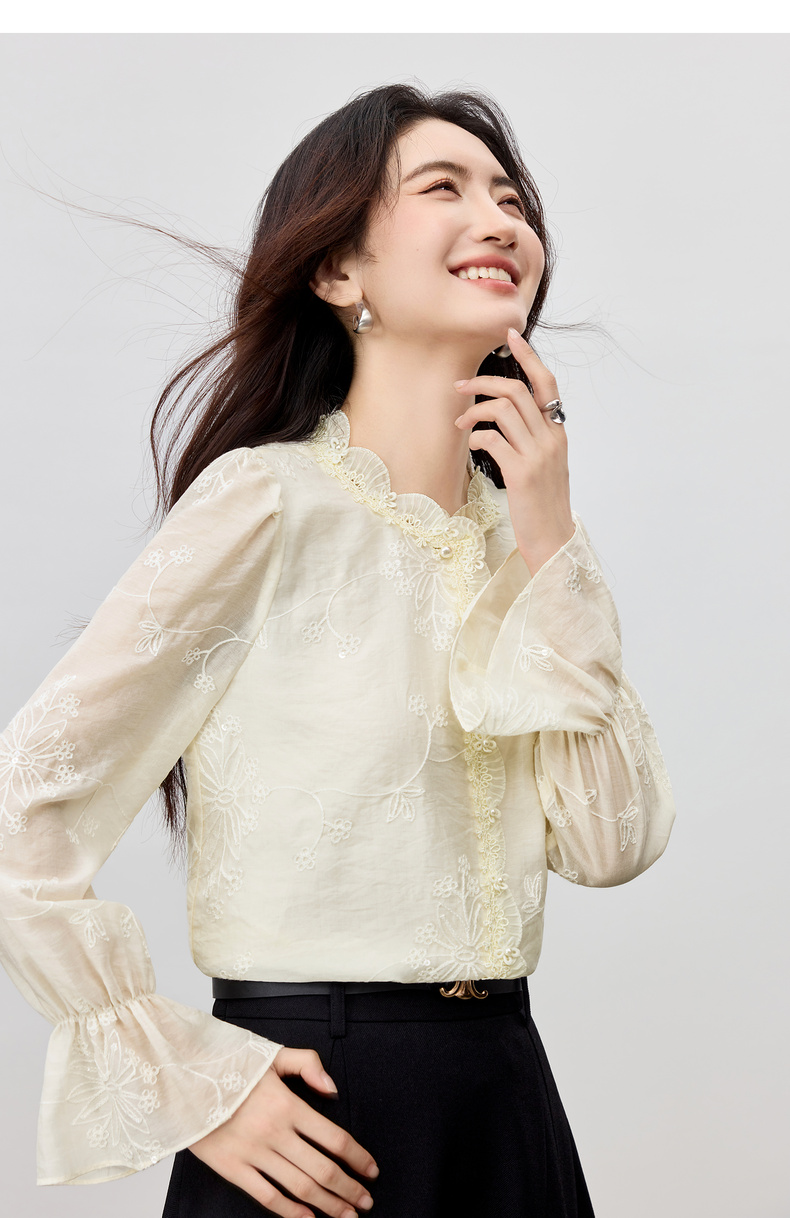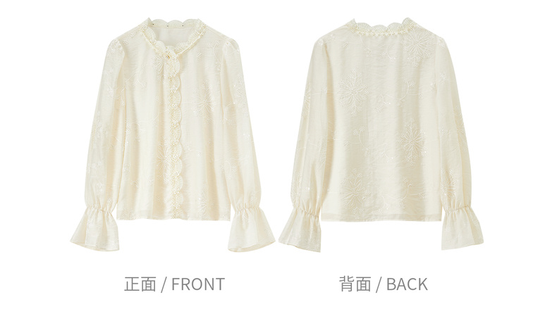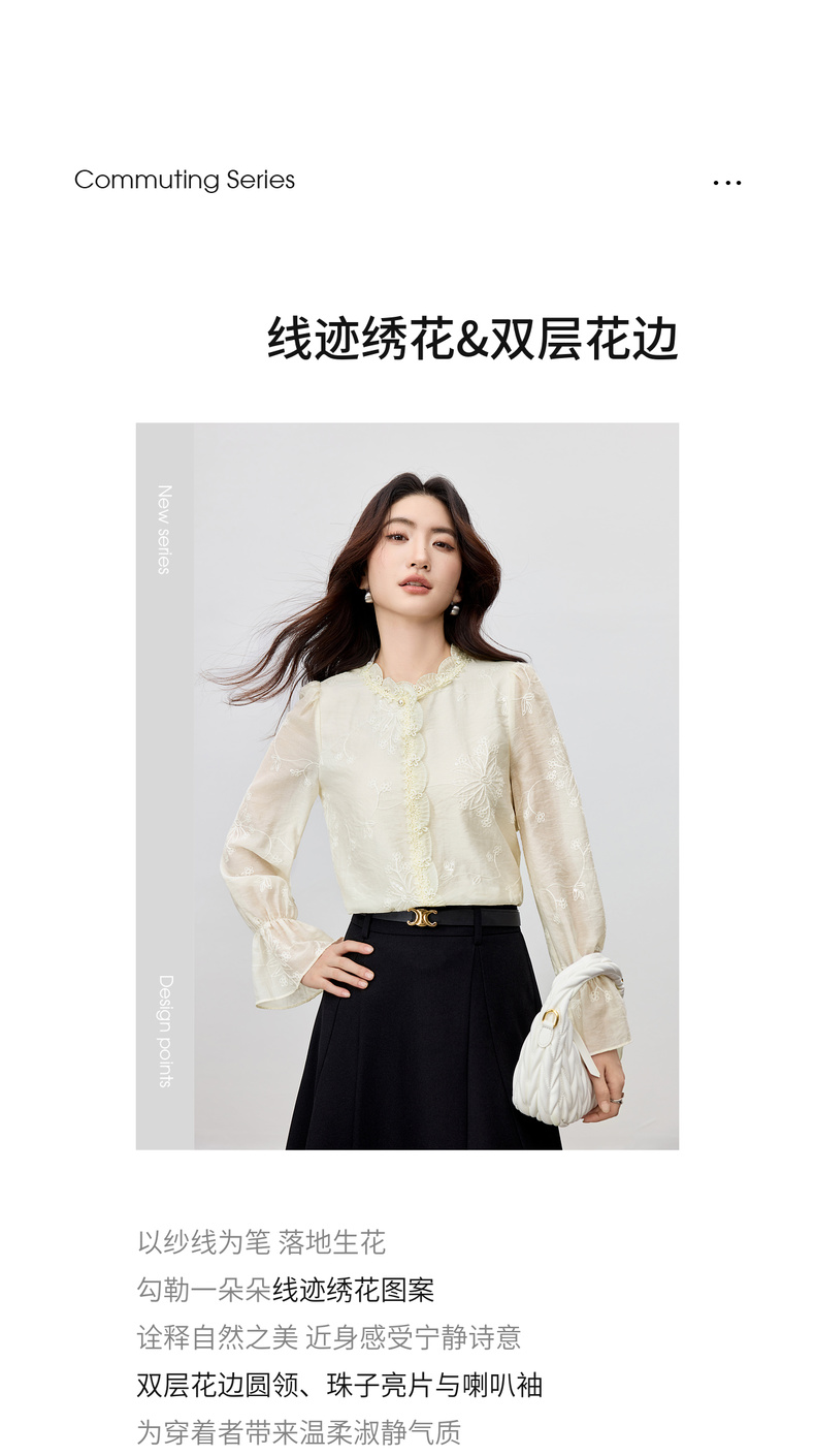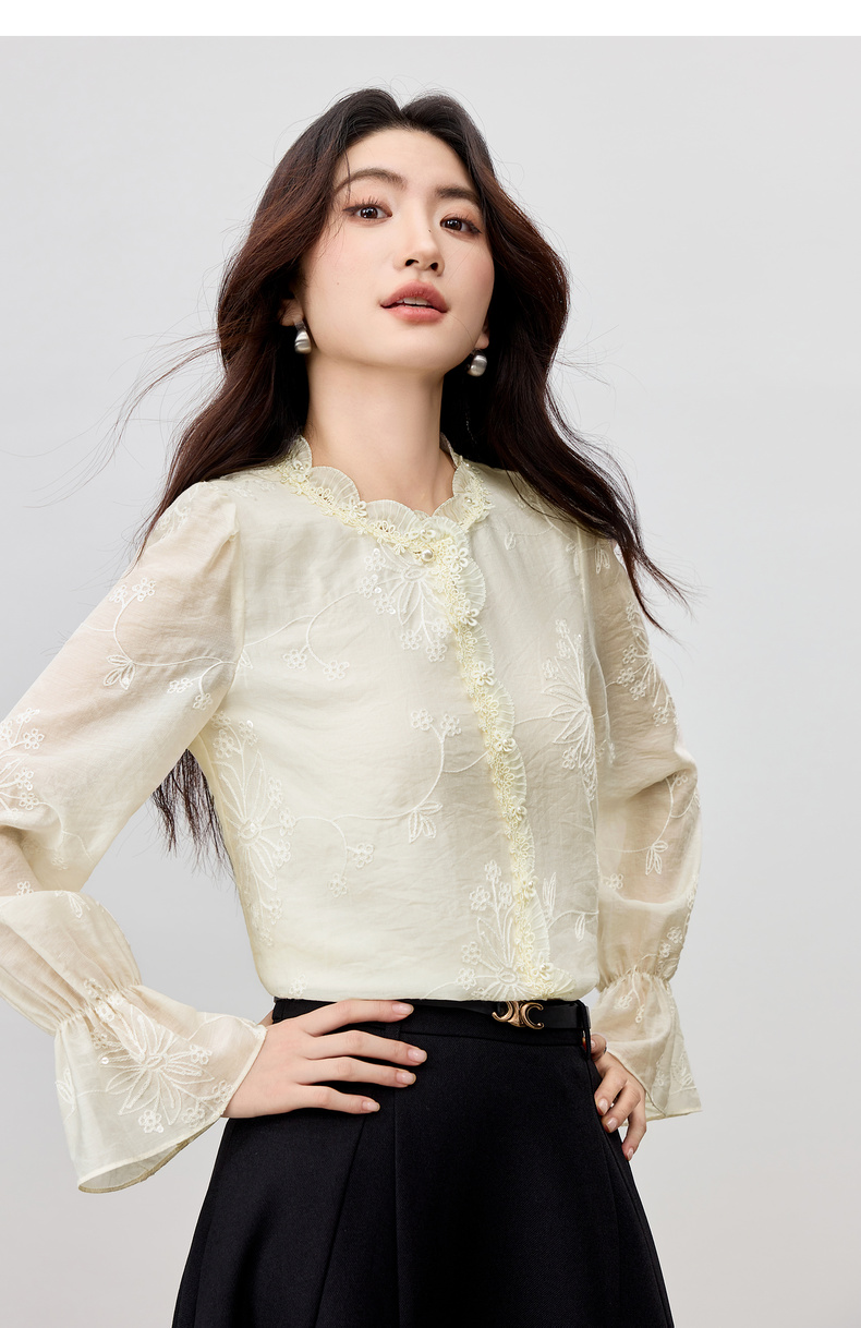 【内购】【莱赛尔】优雅通勤双层花边圆领线迹花卉亮片喇叭袖雪纺衫-Q53VA3928
