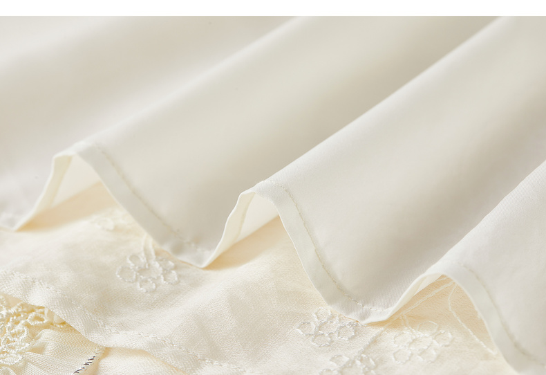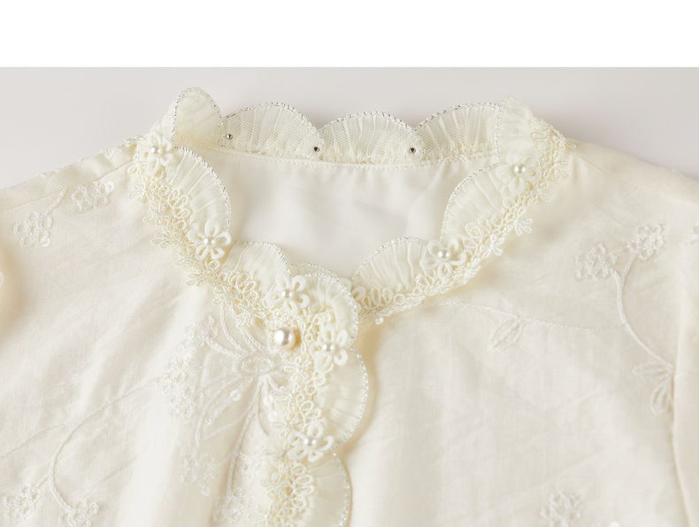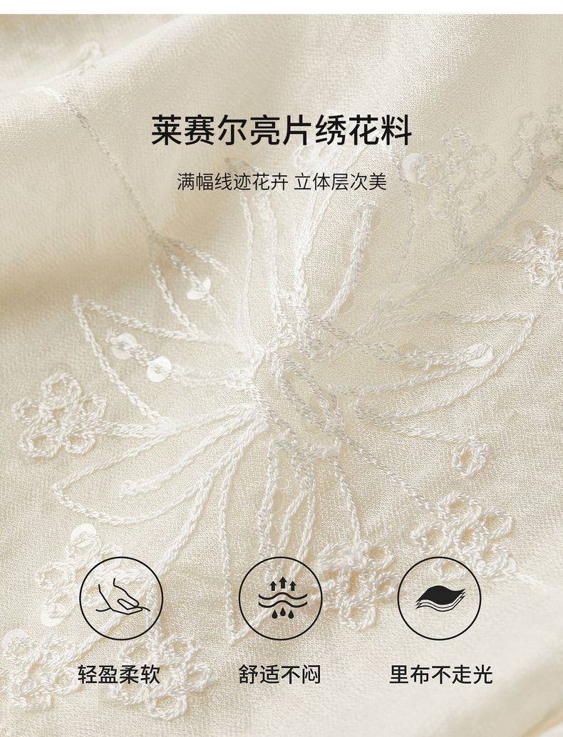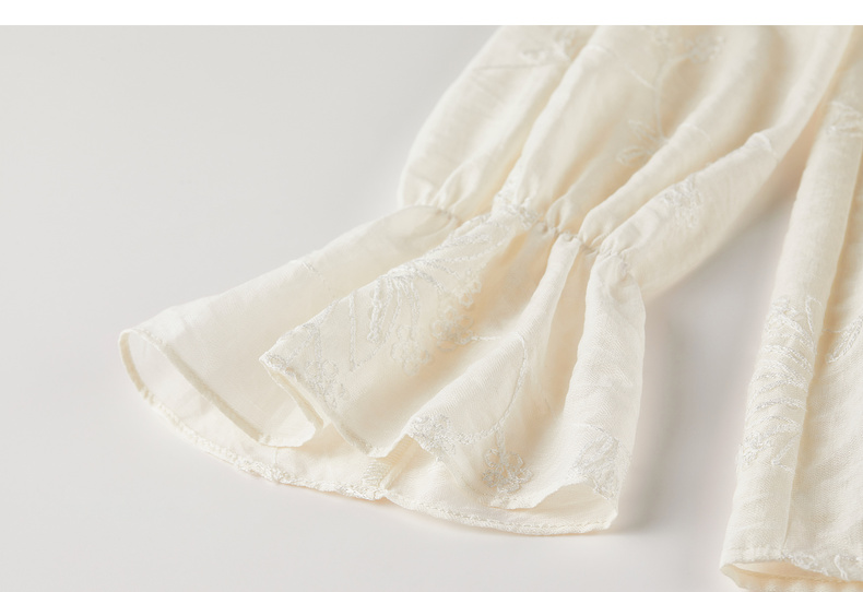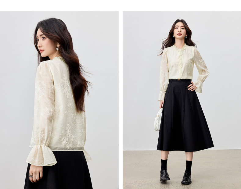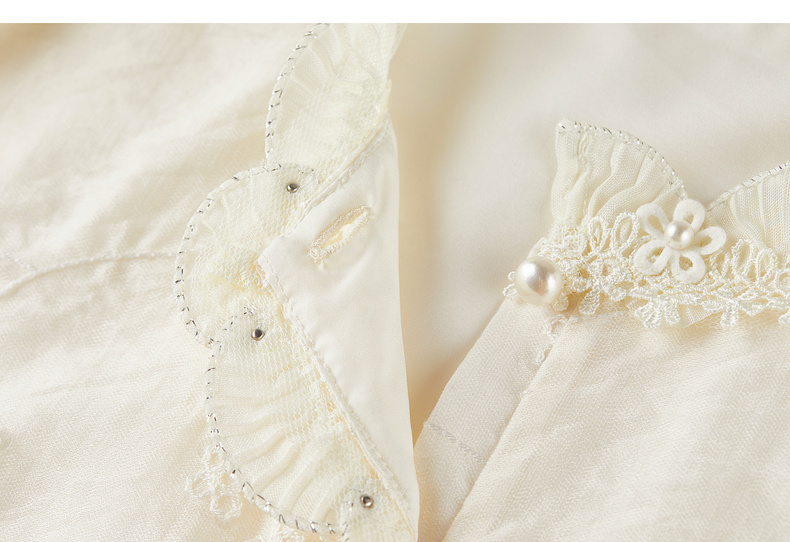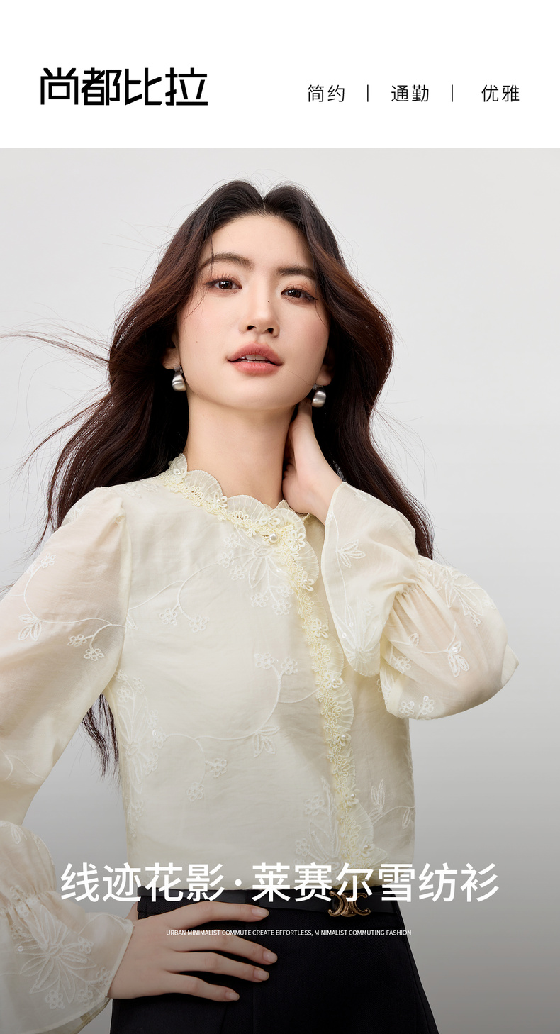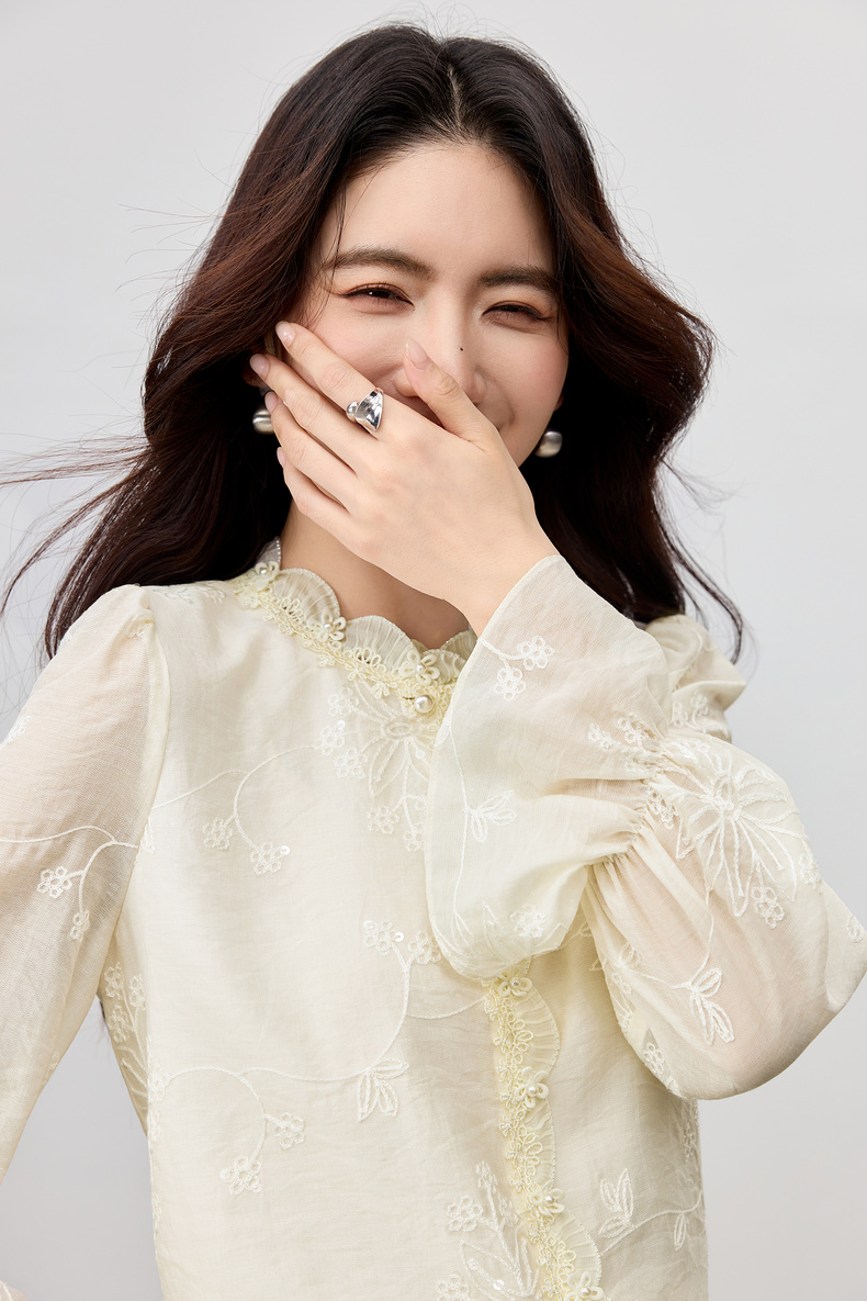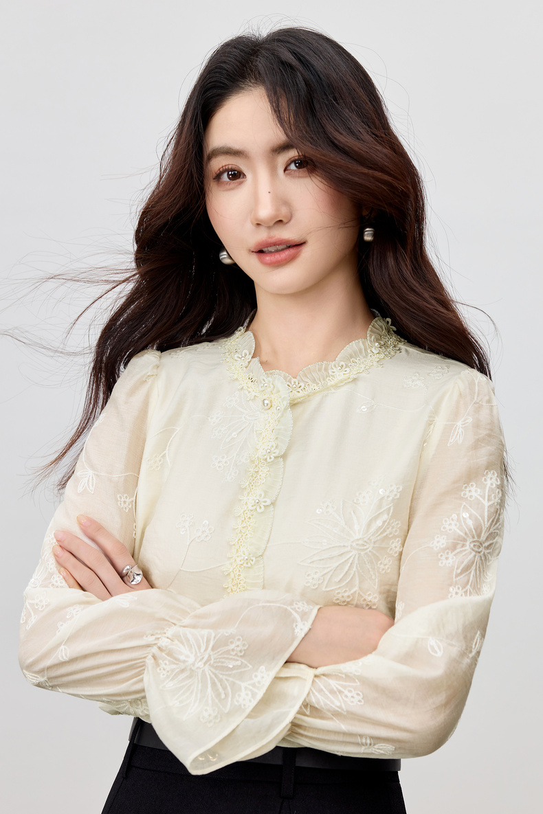 【内购】【莱赛尔】优雅通勤双层花边圆领线迹花卉亮片喇叭袖雪纺衫-Q53VA3928