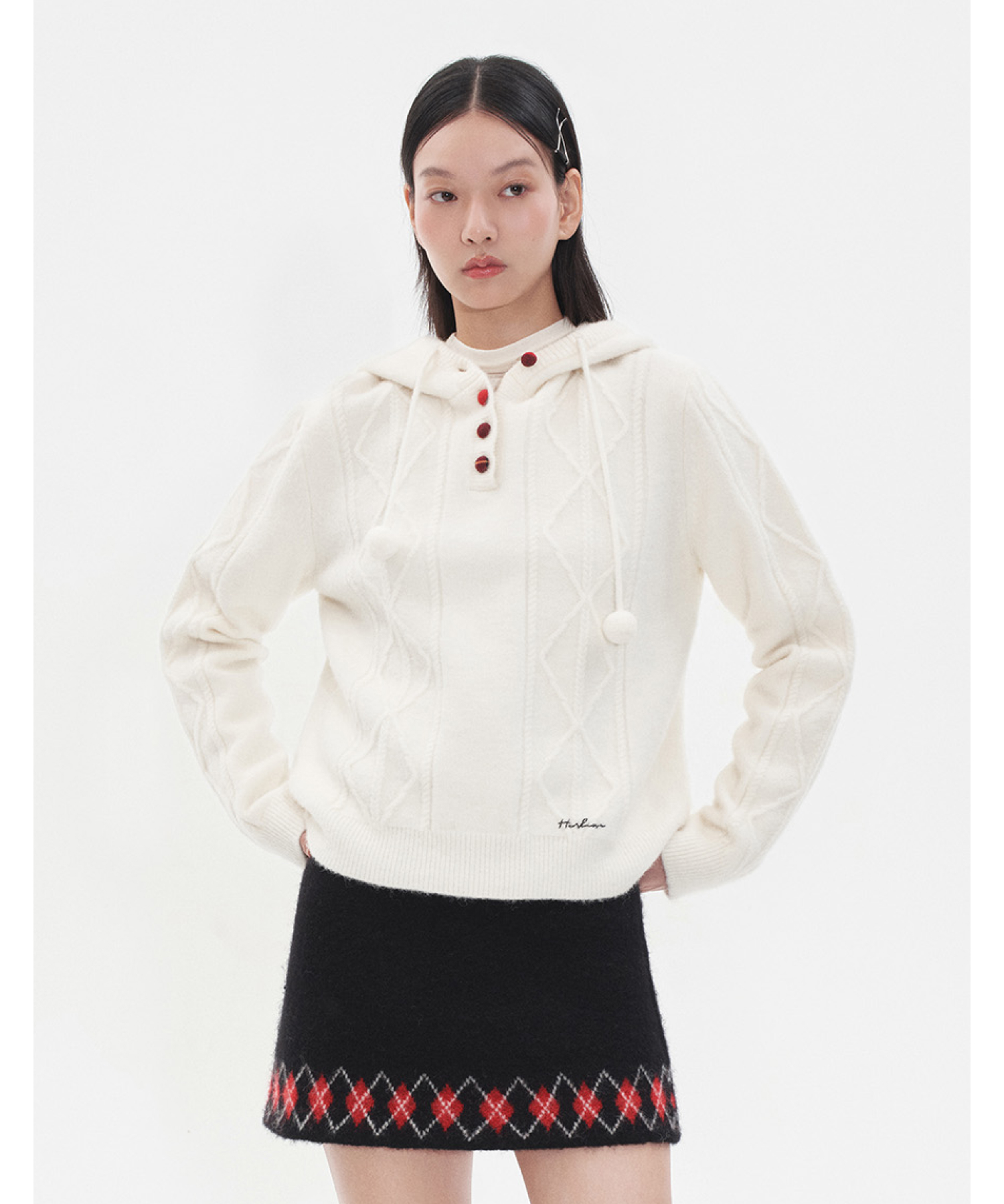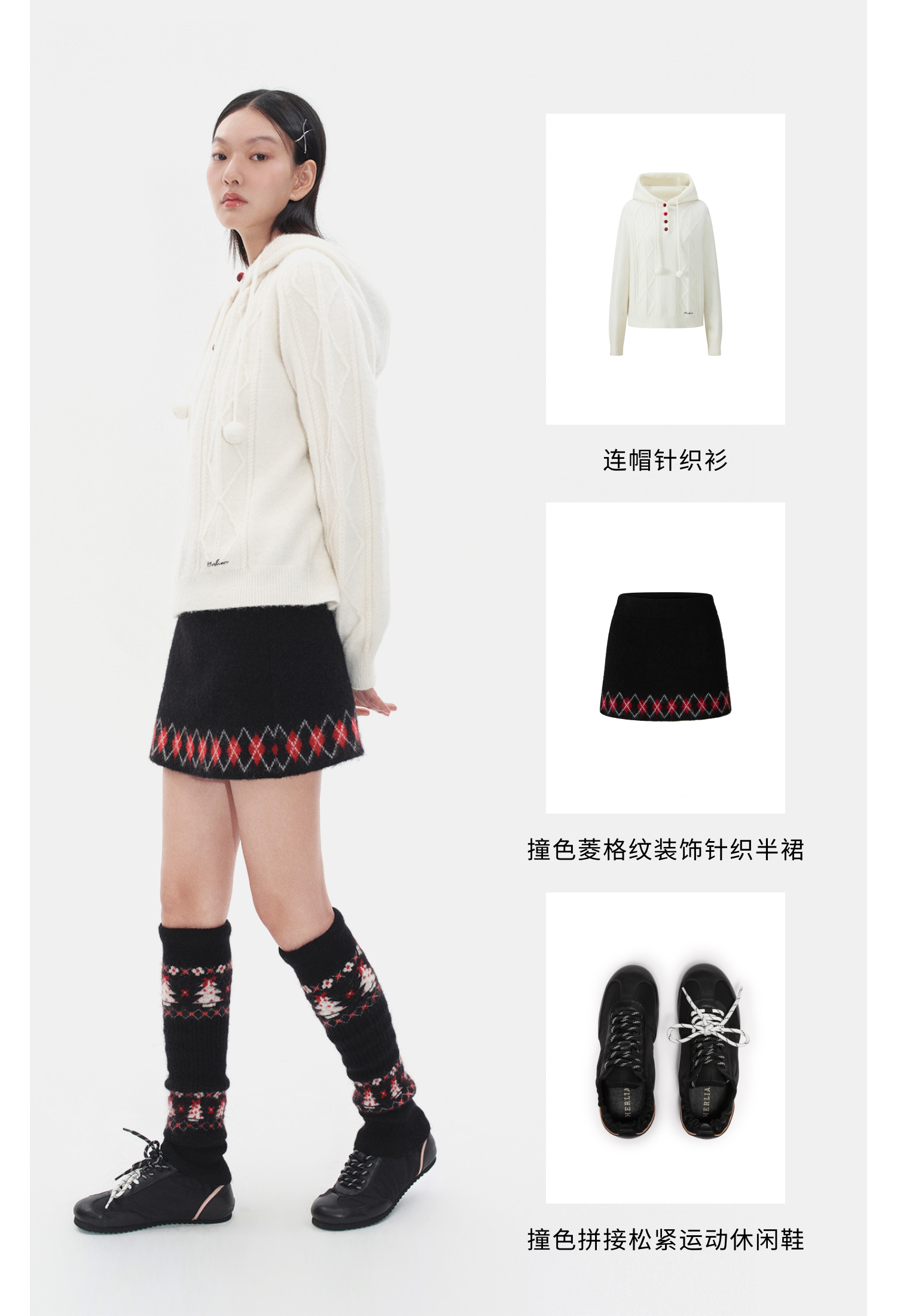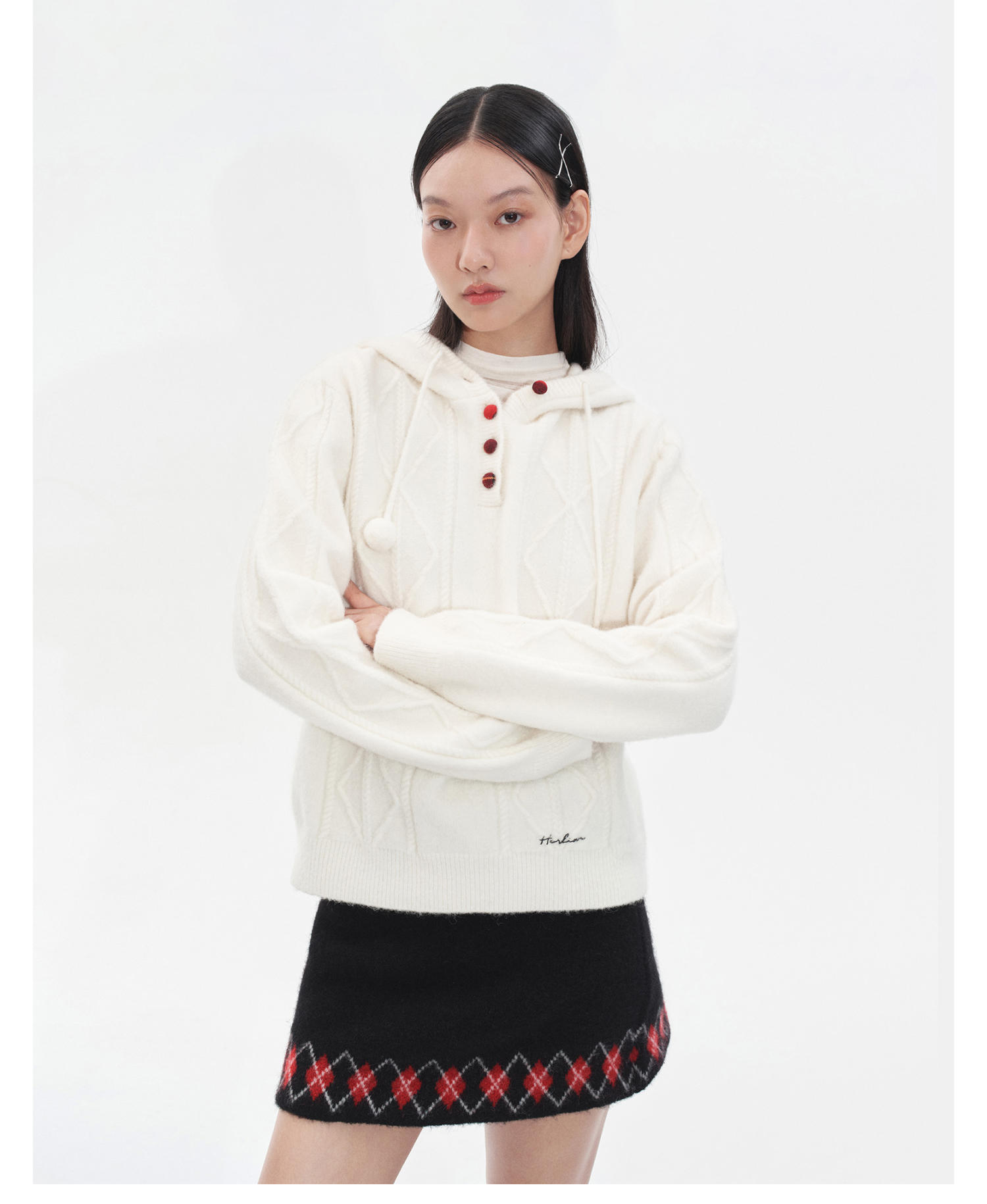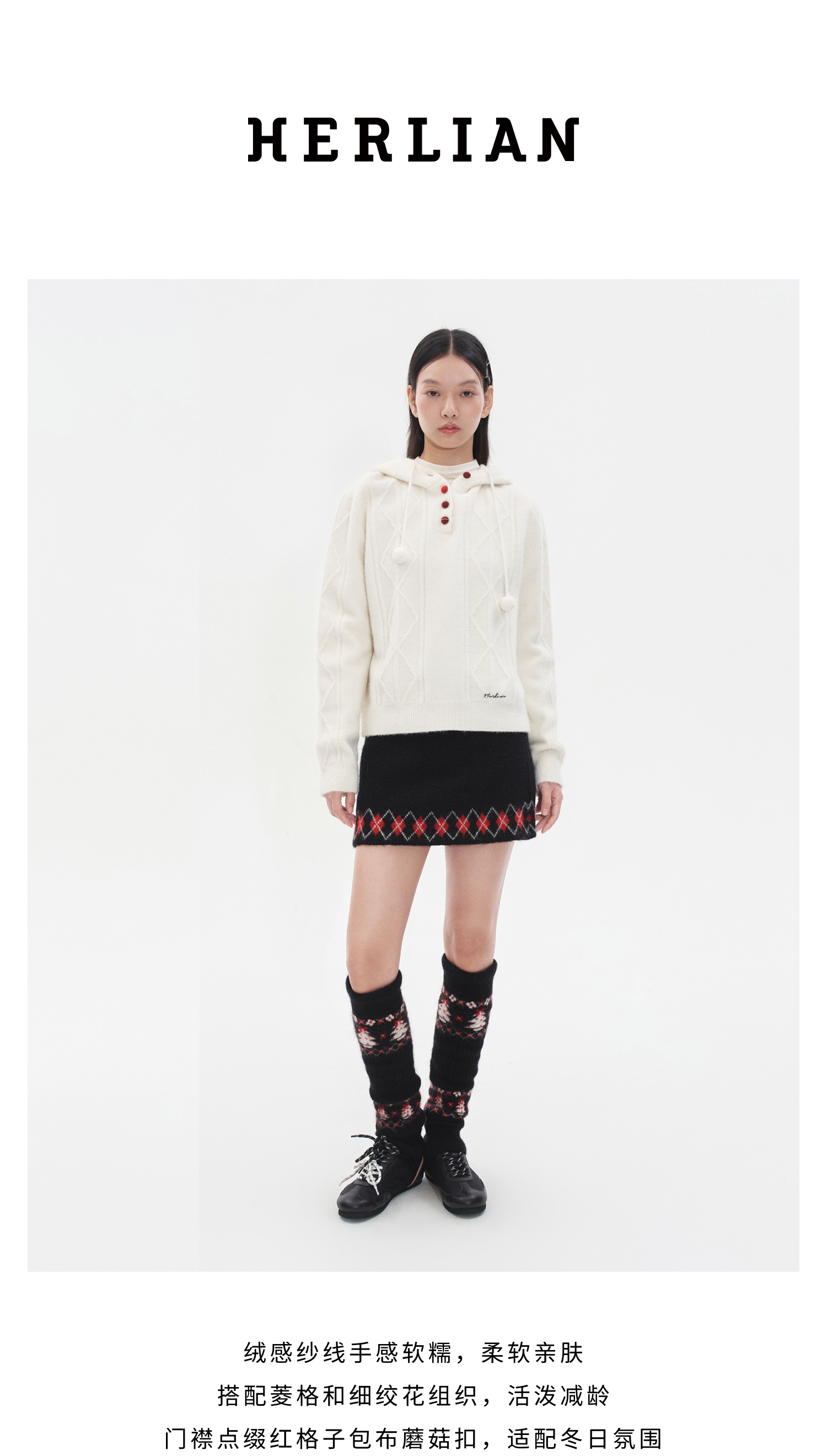 HERLIAN 2025年秋季新品女士黑红格子包扣设计连帽POLO针织衫
