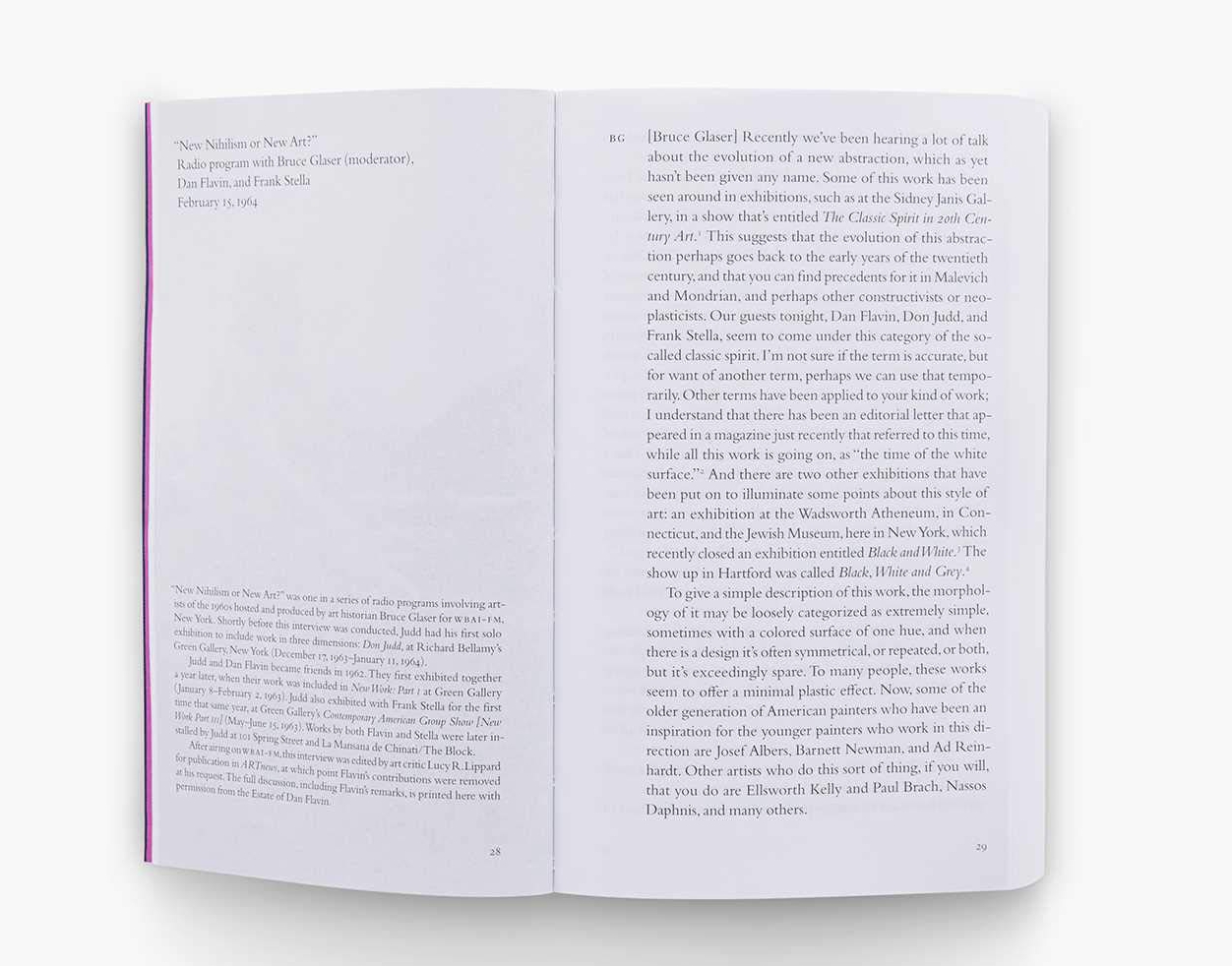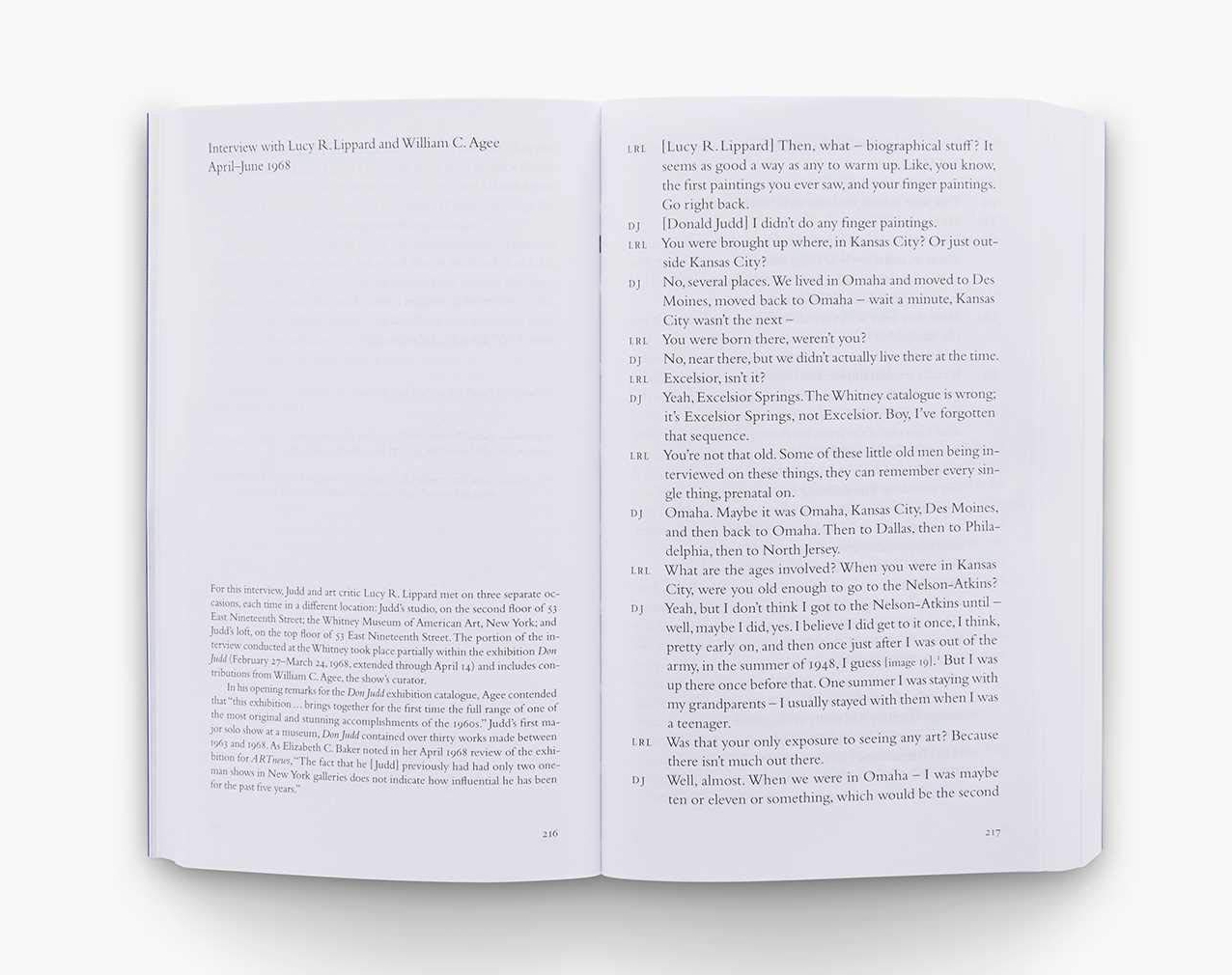 This collection of interviews engages a diverse range of topics, from philosophy and politics to Judd’s insightful critiques of his own work and the work of others such as Mark di Suvero, Edward Hopper, Yayoi Kusama, Barnett Newman, and Jackson Pollock. The opening discussion of the volume between Judd, Dan Flavin, and Frank Stella provides the foundation for many of the succeeding conversations, focusing on the nature and material conditions of the new art developing in the 1960s. The publication also gathers a substantial body of unpublished material across a range of mediums including extensive interviews with art historians Lucy R. Lippard and Barbara Rose.