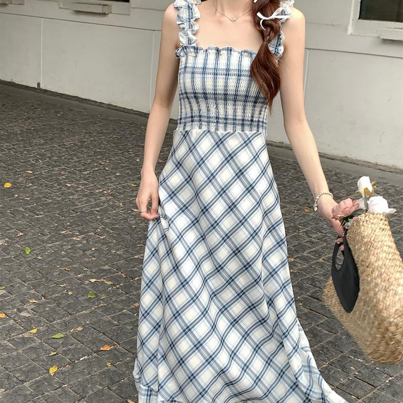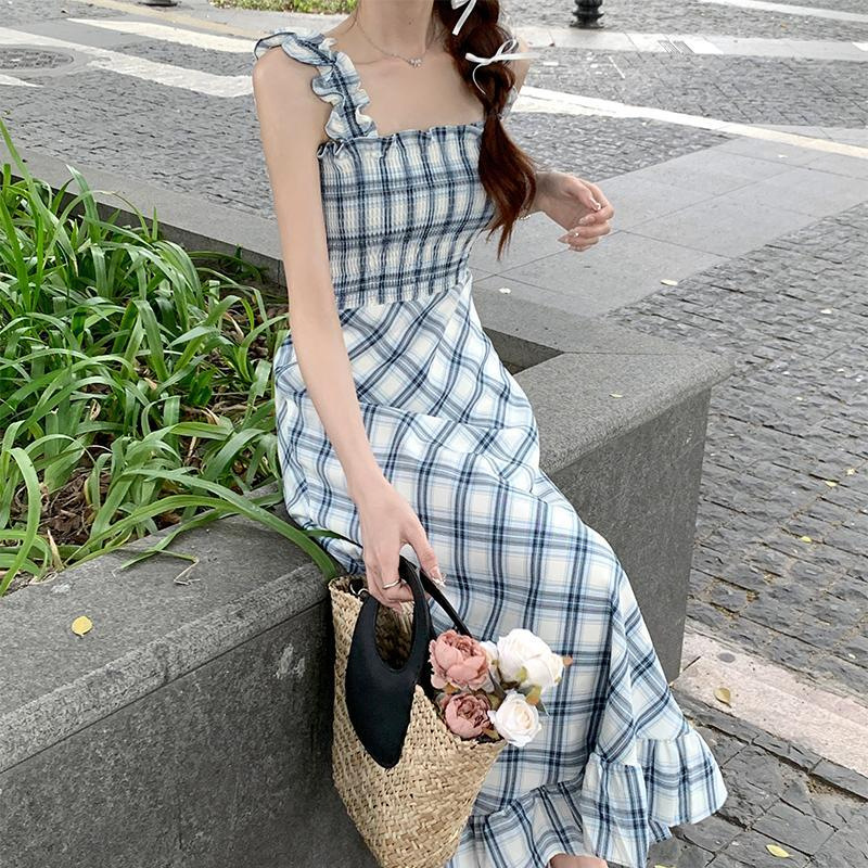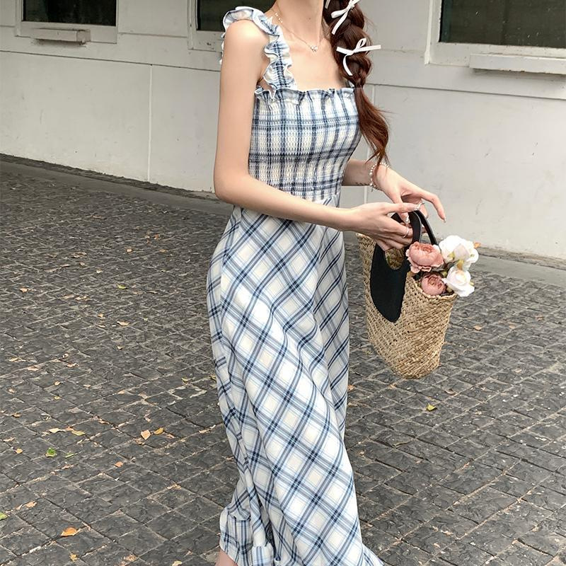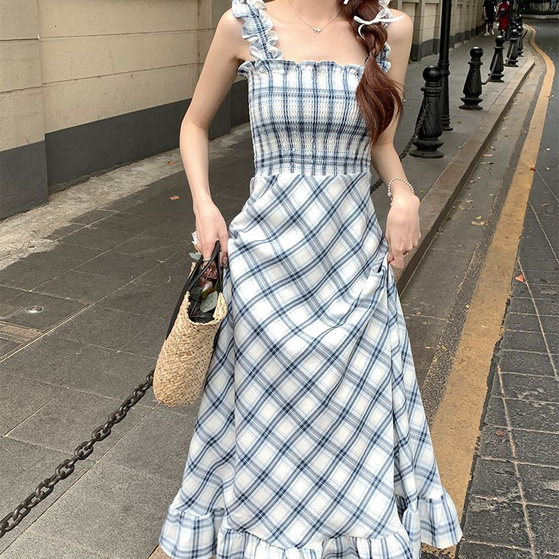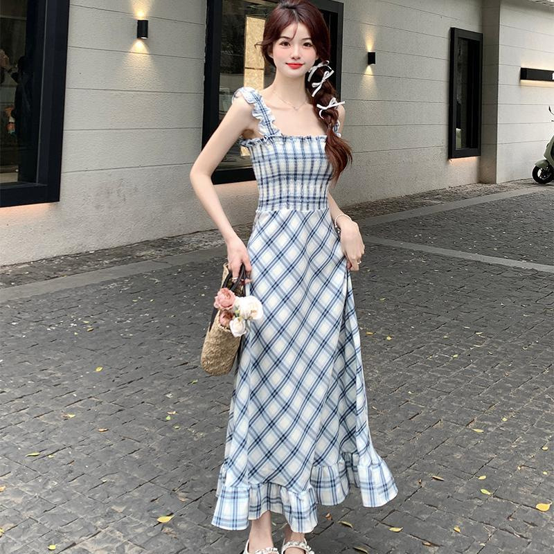 夏季新款【法式甜美温柔风 格子吊带连衣裙女】复古无袖收腰茶歇中长裙
