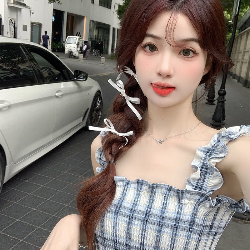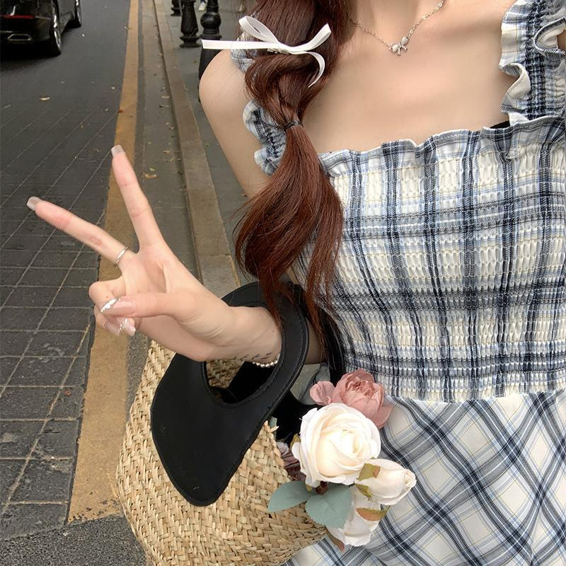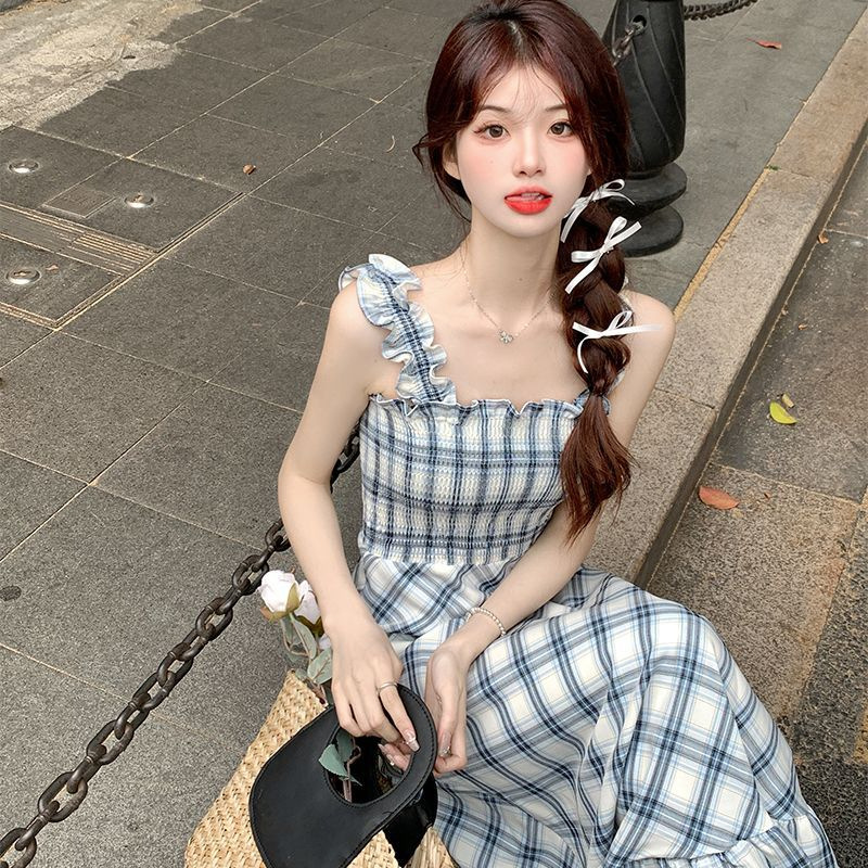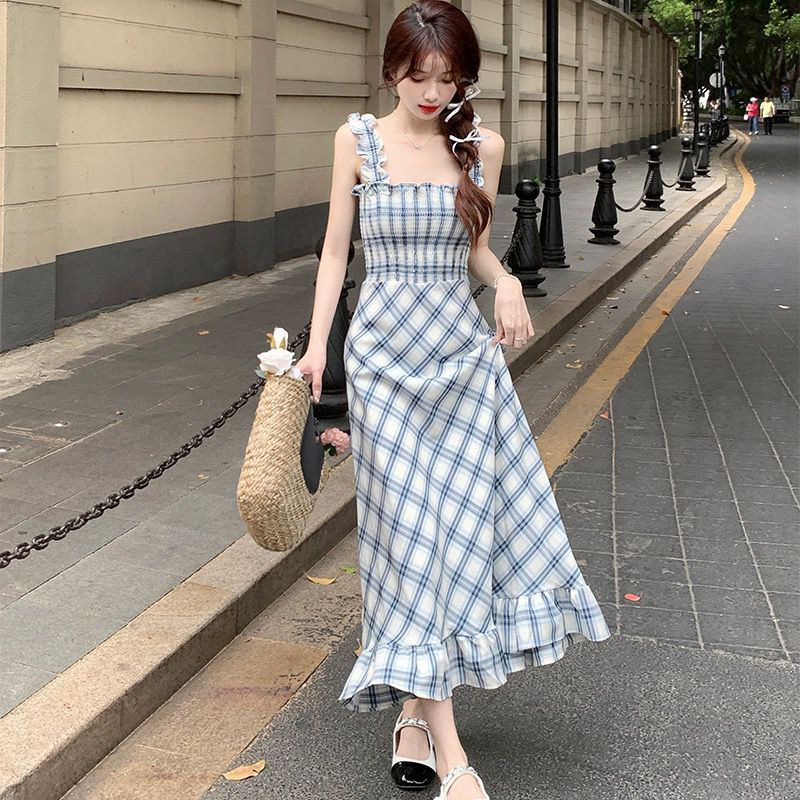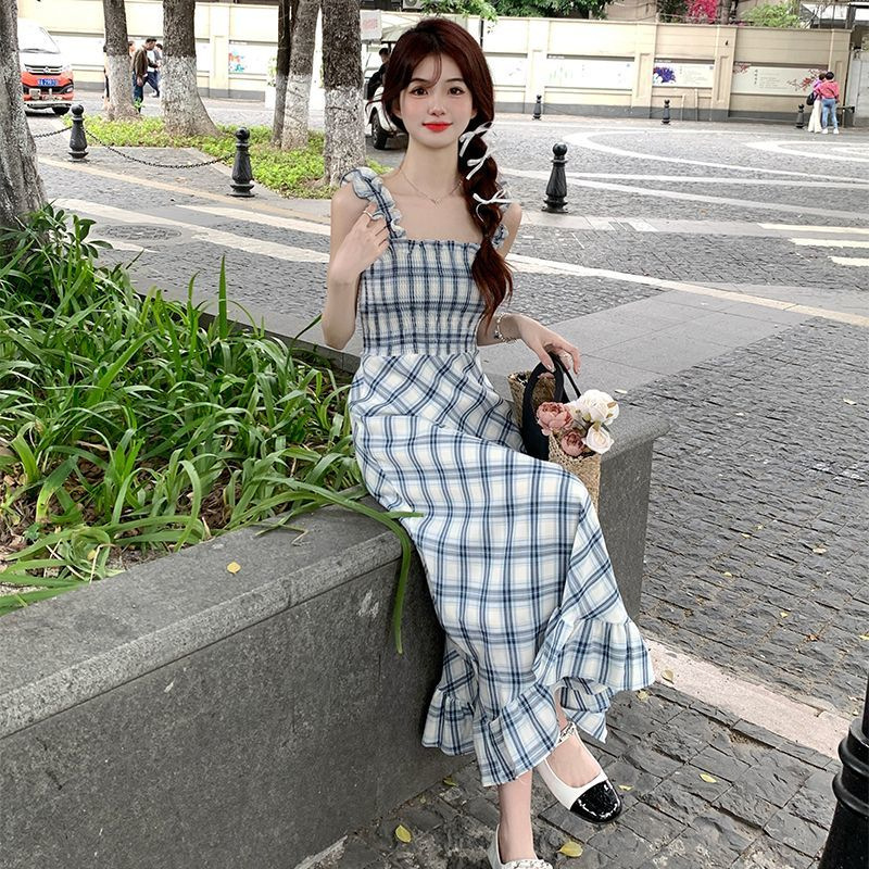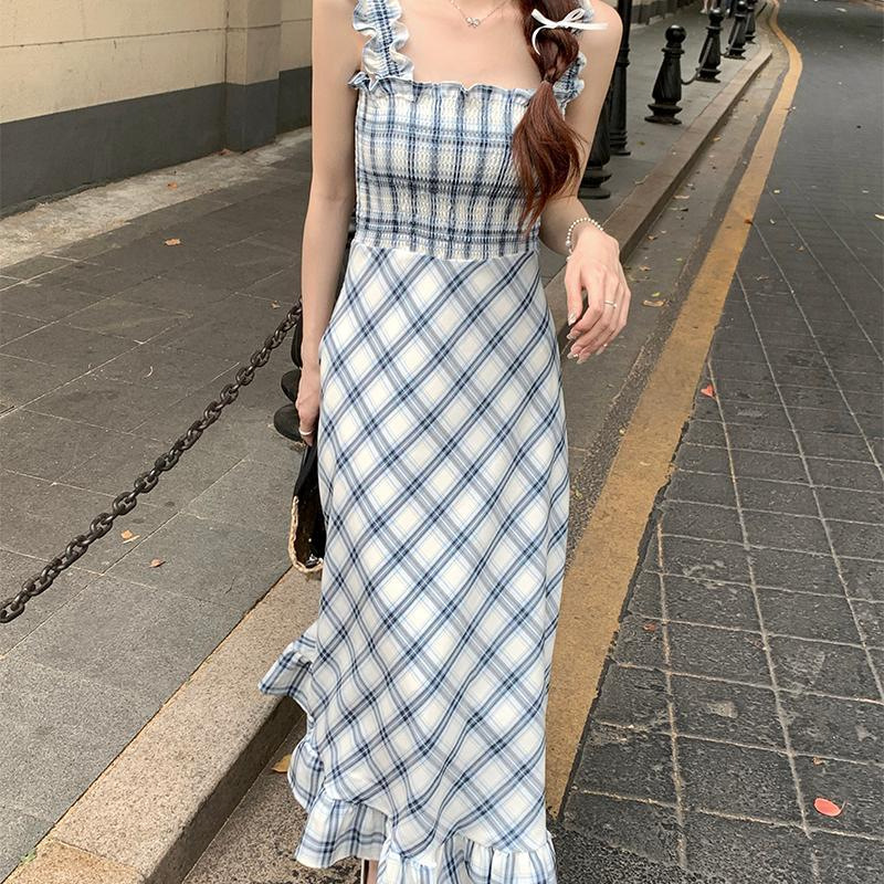夏季新款【法式甜美温柔风 格子吊带连衣裙女】复古无袖收腰茶歇中长裙