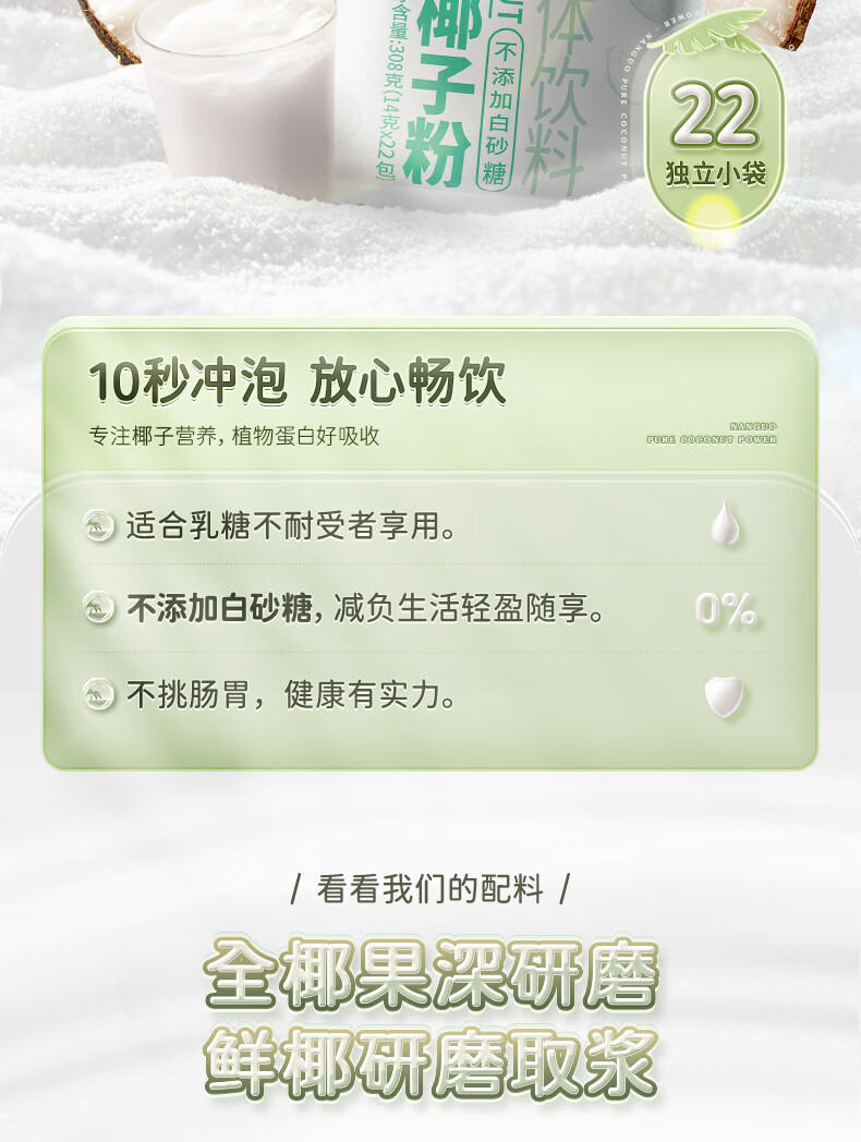 【南国纯椰子粉】 低温研磨工艺 保留椰子风味与营养 不添加蔗糖与香精