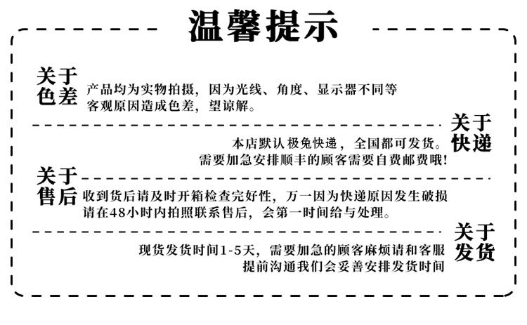 【关于售后】不影响二次销售的情况下,支持七天无理由退换货,超时不支持退换,收到有问题请把快递面单与产品放一起拍照联系客服!