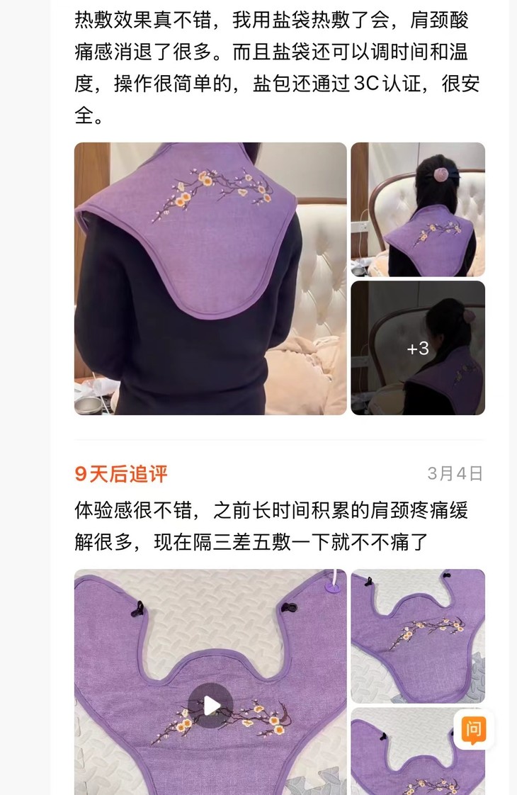 姐妹们‼️作为一个颈椎病十级患者‼️ 我真的太有发言权了! 每天带娃、做家务,还要低头看手机处理工作 肩颈真的快扛不住了😭 如果肩颈不舒服 整个人的脖子都处于低落 状态不光显得体态难看 精气神更不好! 长久低头还容易造成富贵包显老显胖 直到我遇见这个【暖肩盐敷包】♨️ 真的是宝藏戴在身上暖乎乎的!