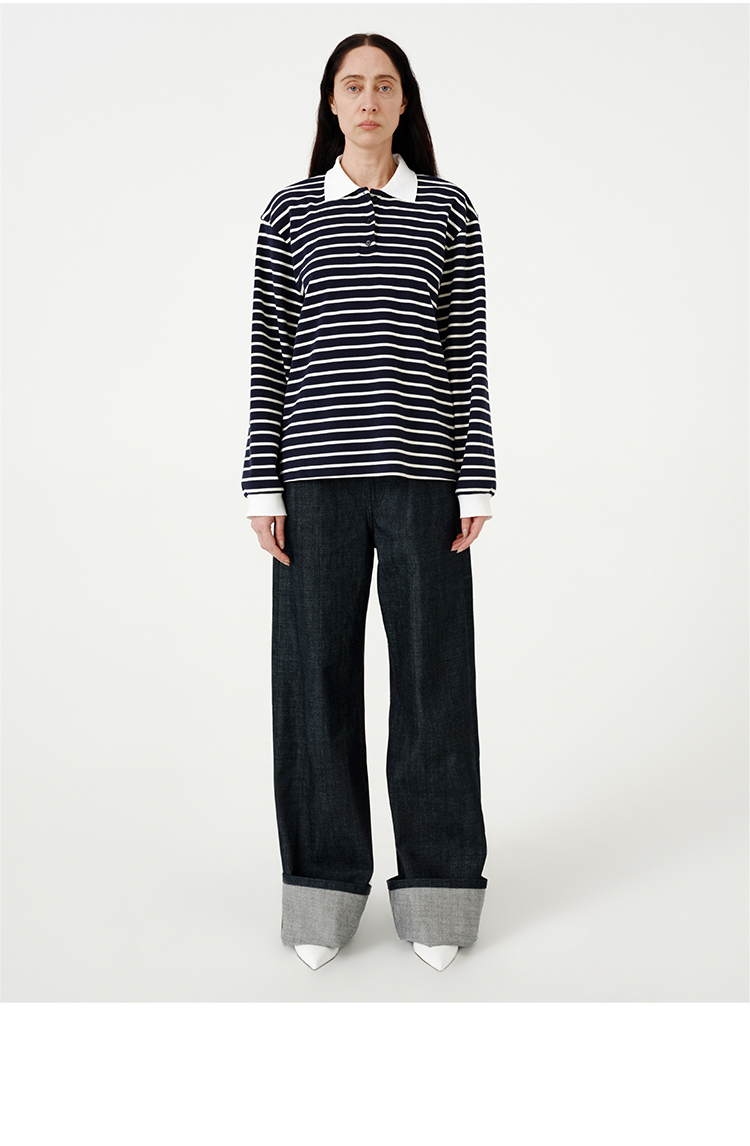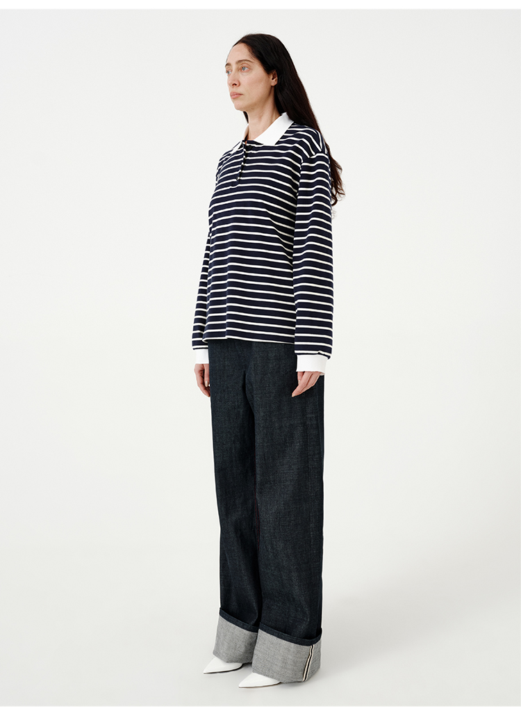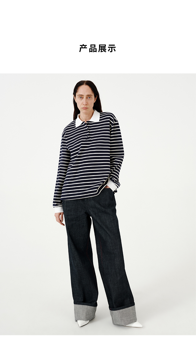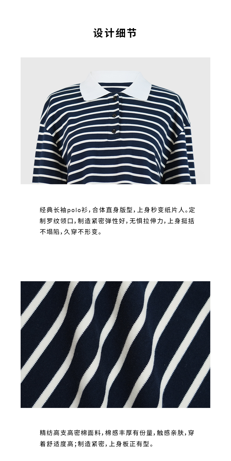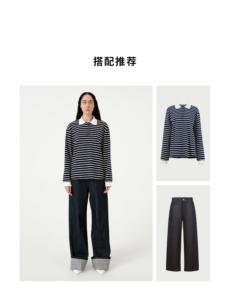 HIDEMI 甄选自然棉极简设计感廓形POLO长袖上衣 自然白/黑白条纹
