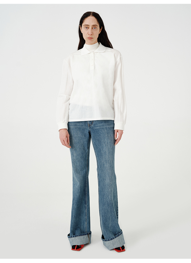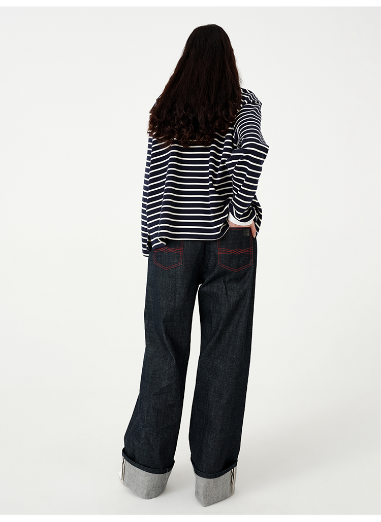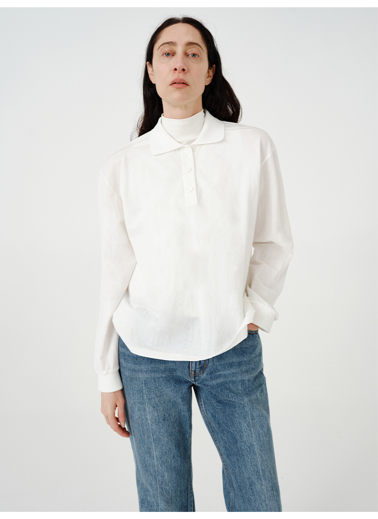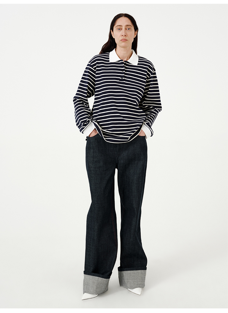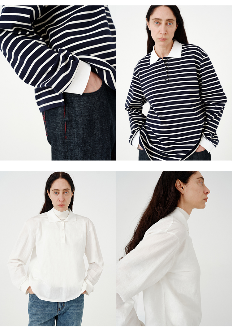 HIDEMI 甄选自然棉极简设计感廓形POLO长袖上衣 自然白/黑白条纹