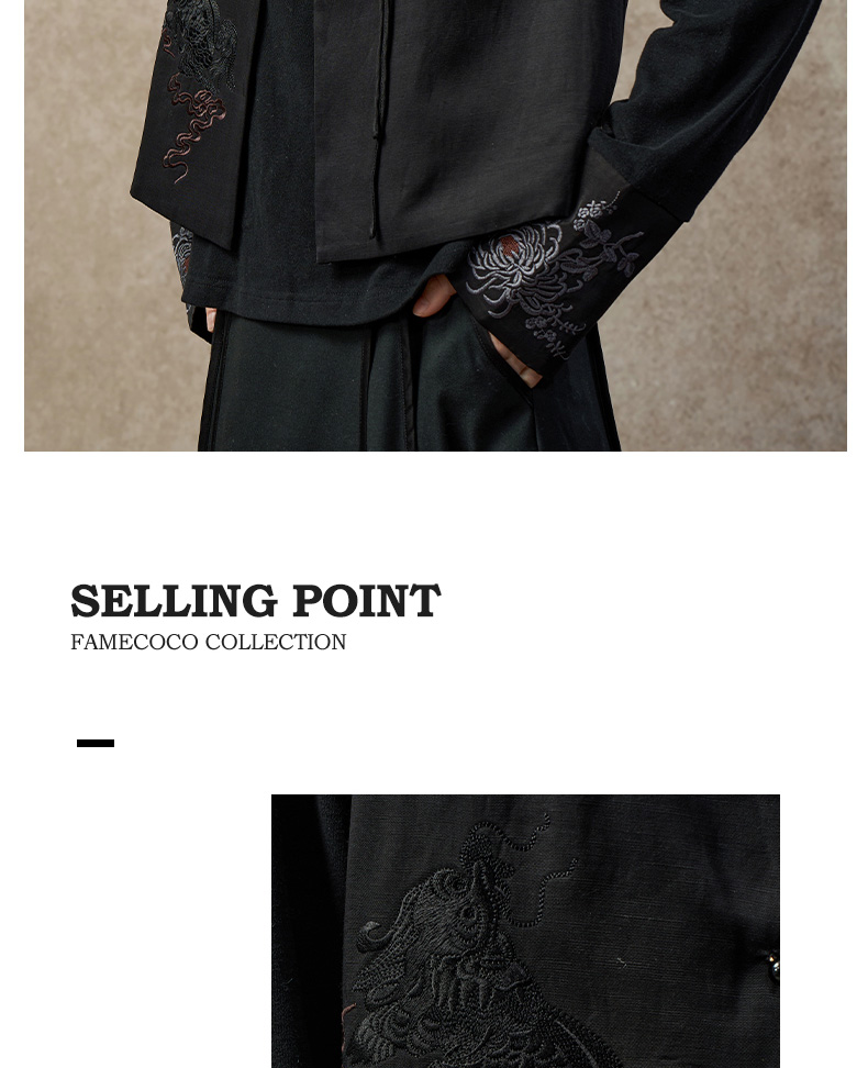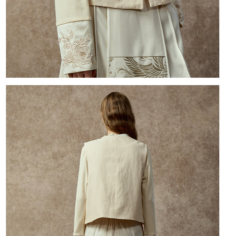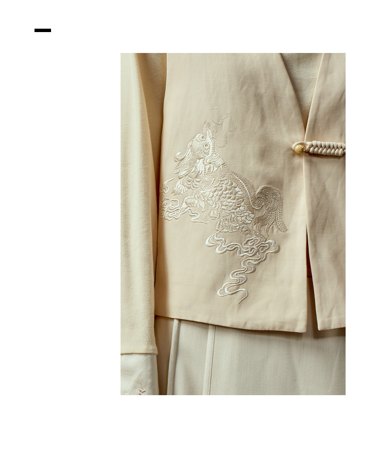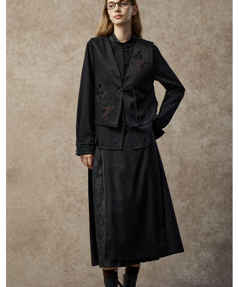 Famecoco范可儿醋酸丝麻中式龙纹绣花盘扣V领马甲FAC8CA005