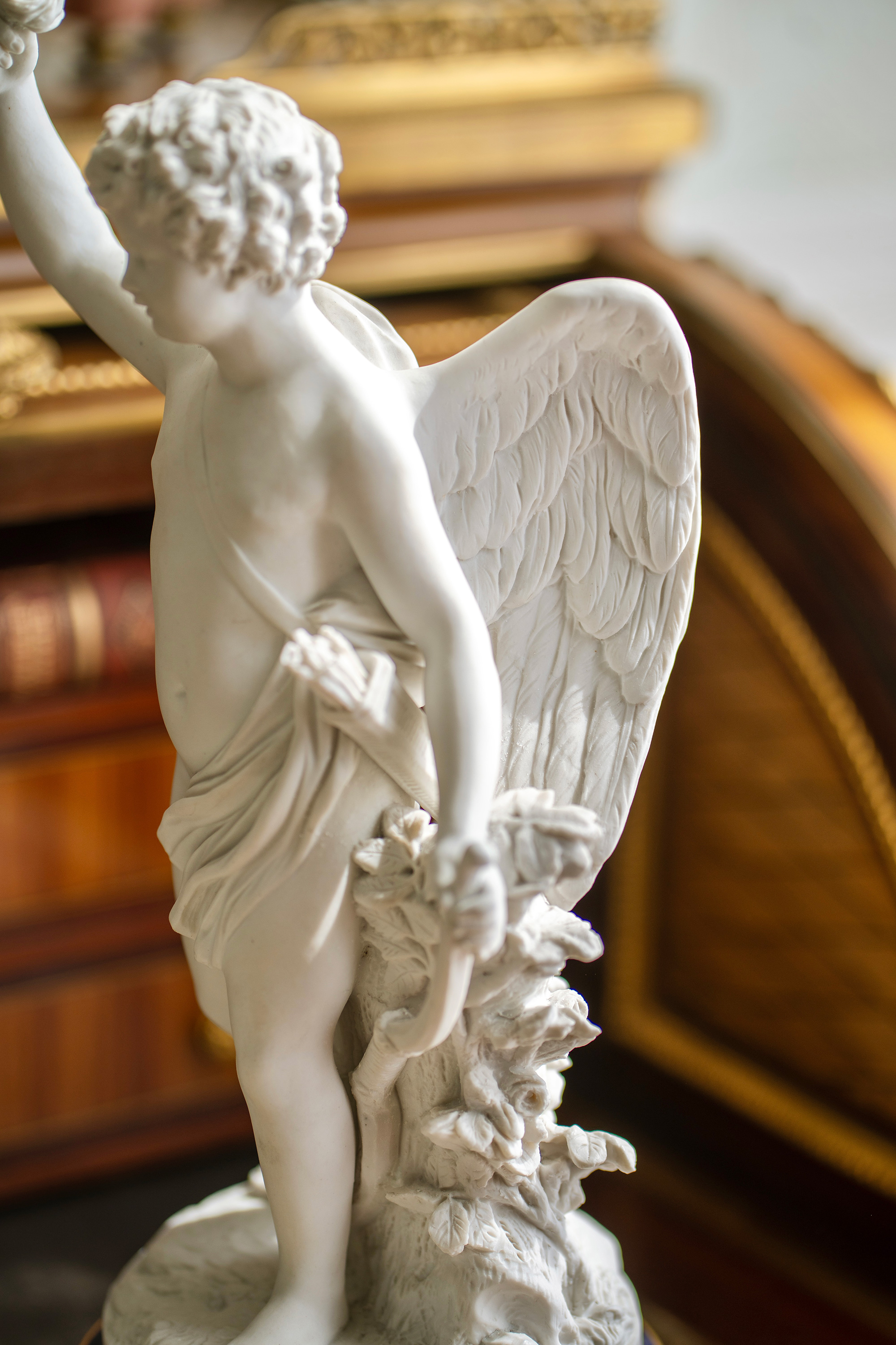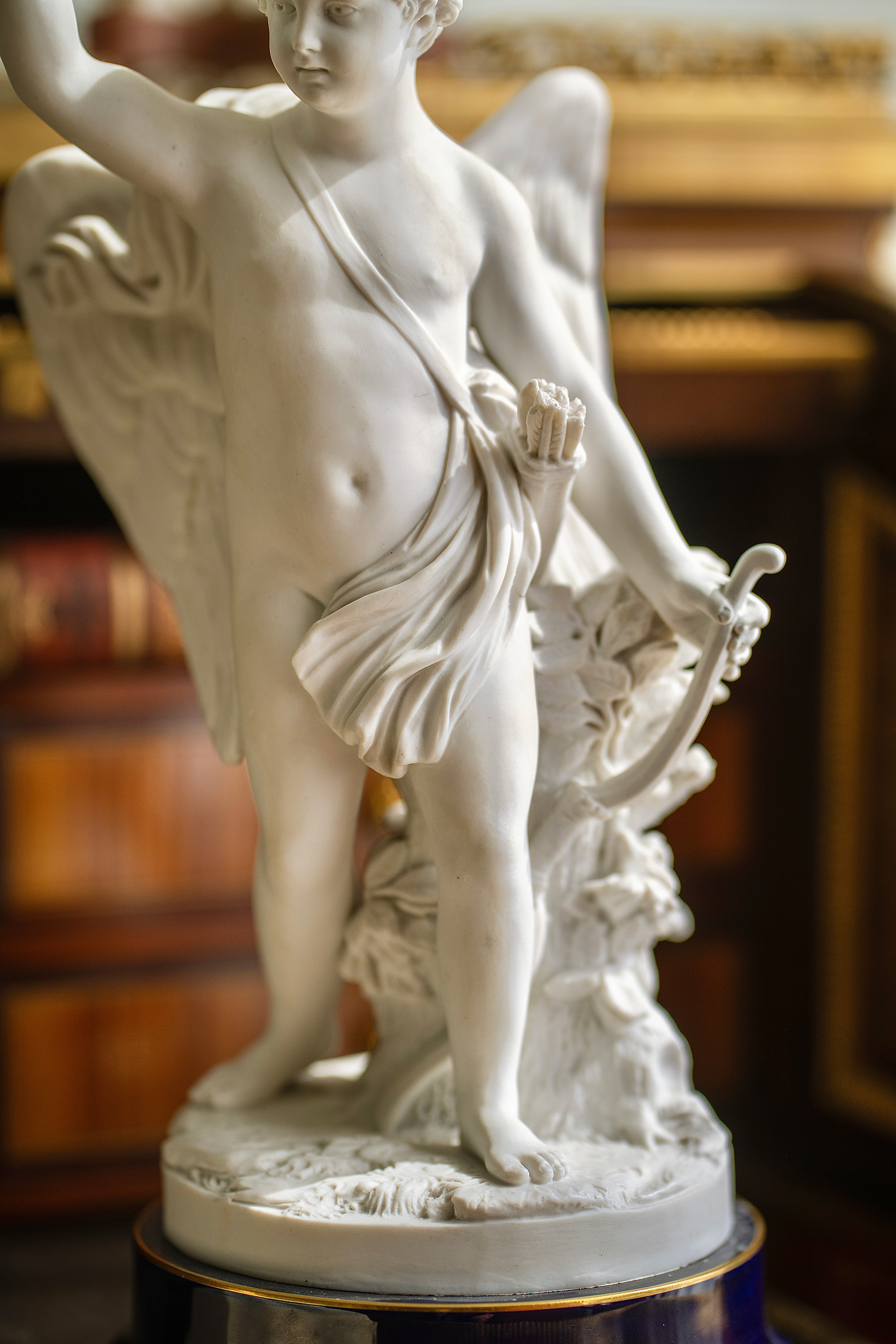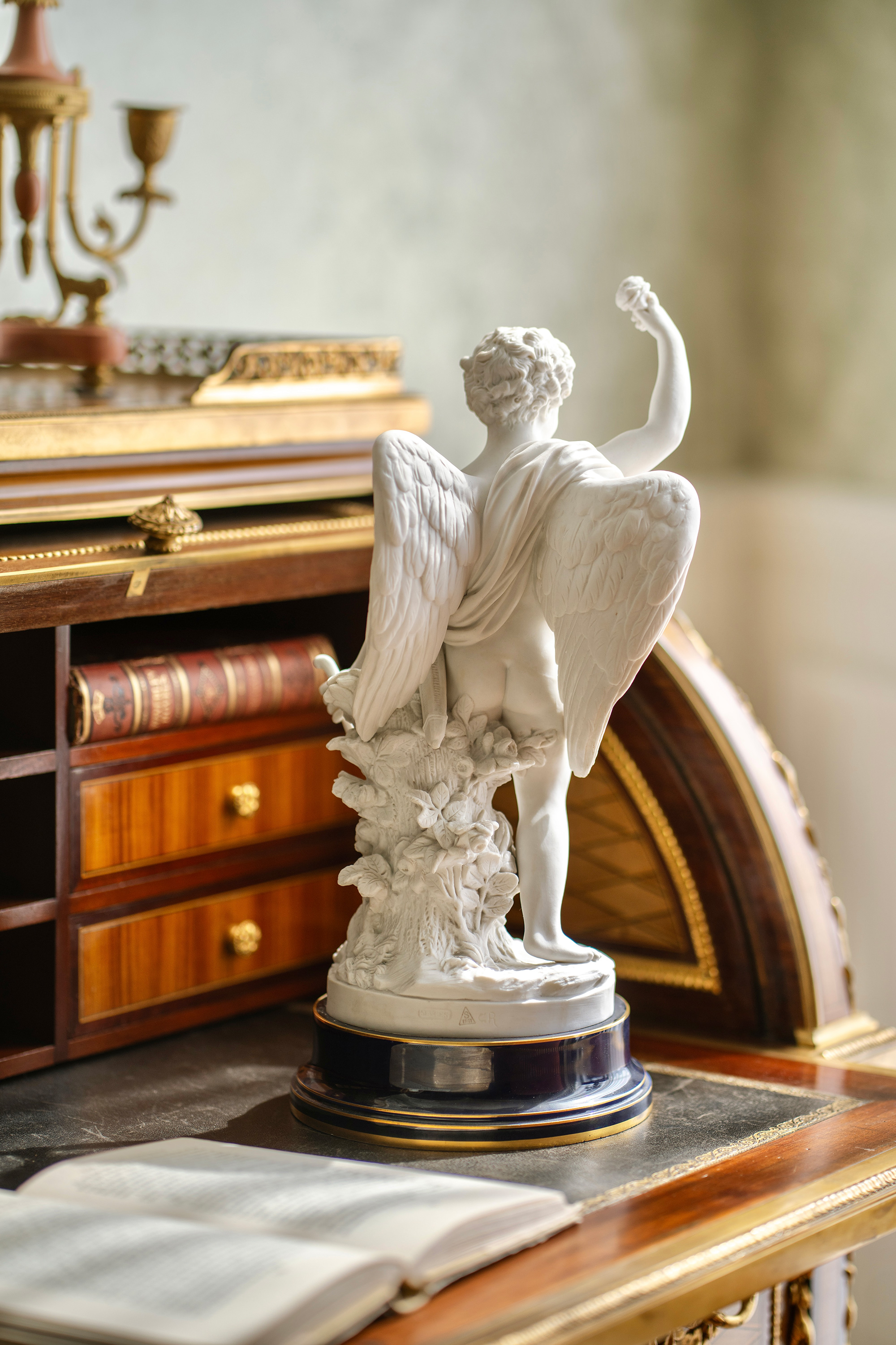 独角鹿西洋古董1895-1911年代法国御窑塞弗尔签名出品蓝釉描金底座装饰持花小天使主题素胎瓷雕塑
