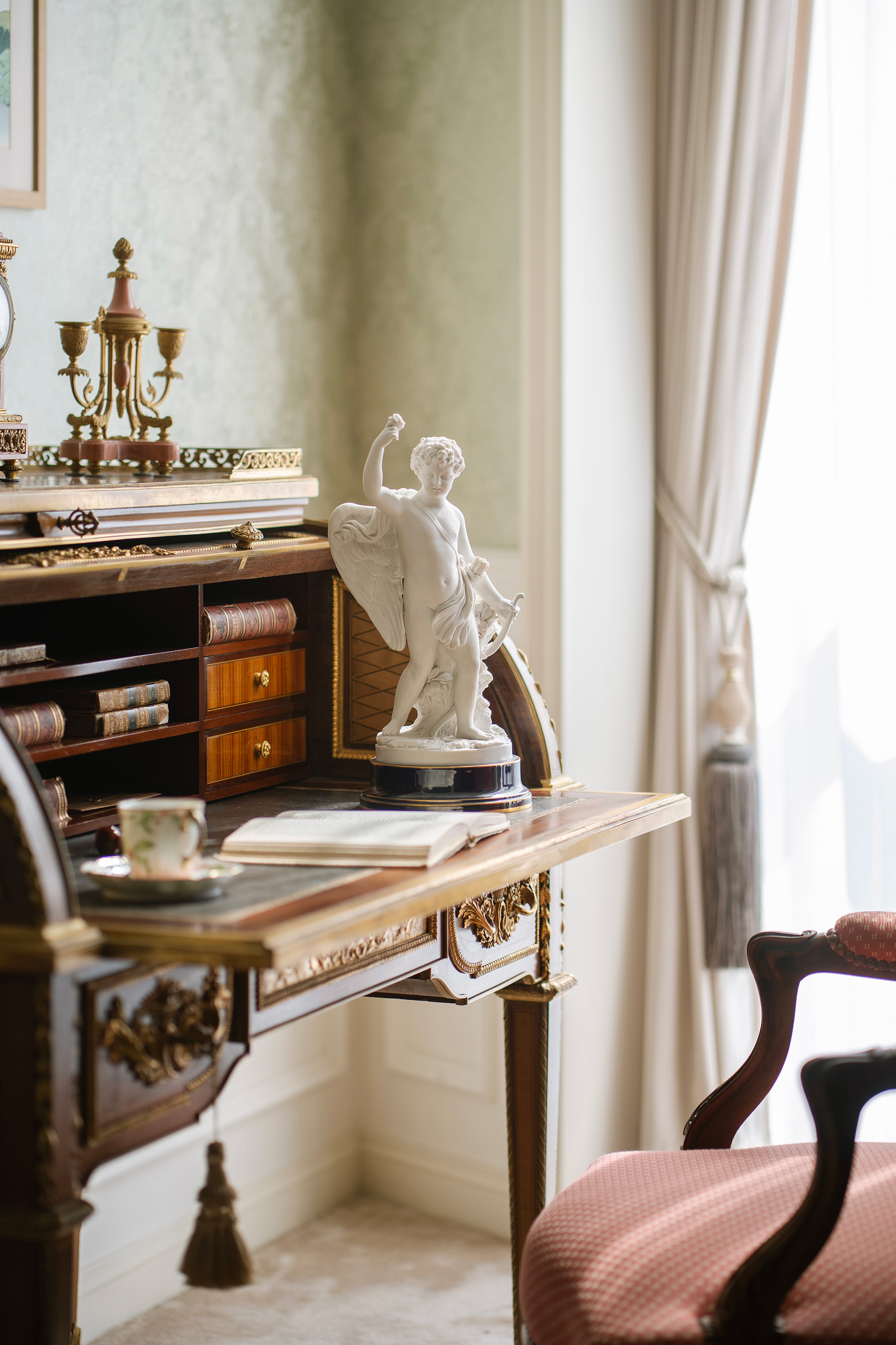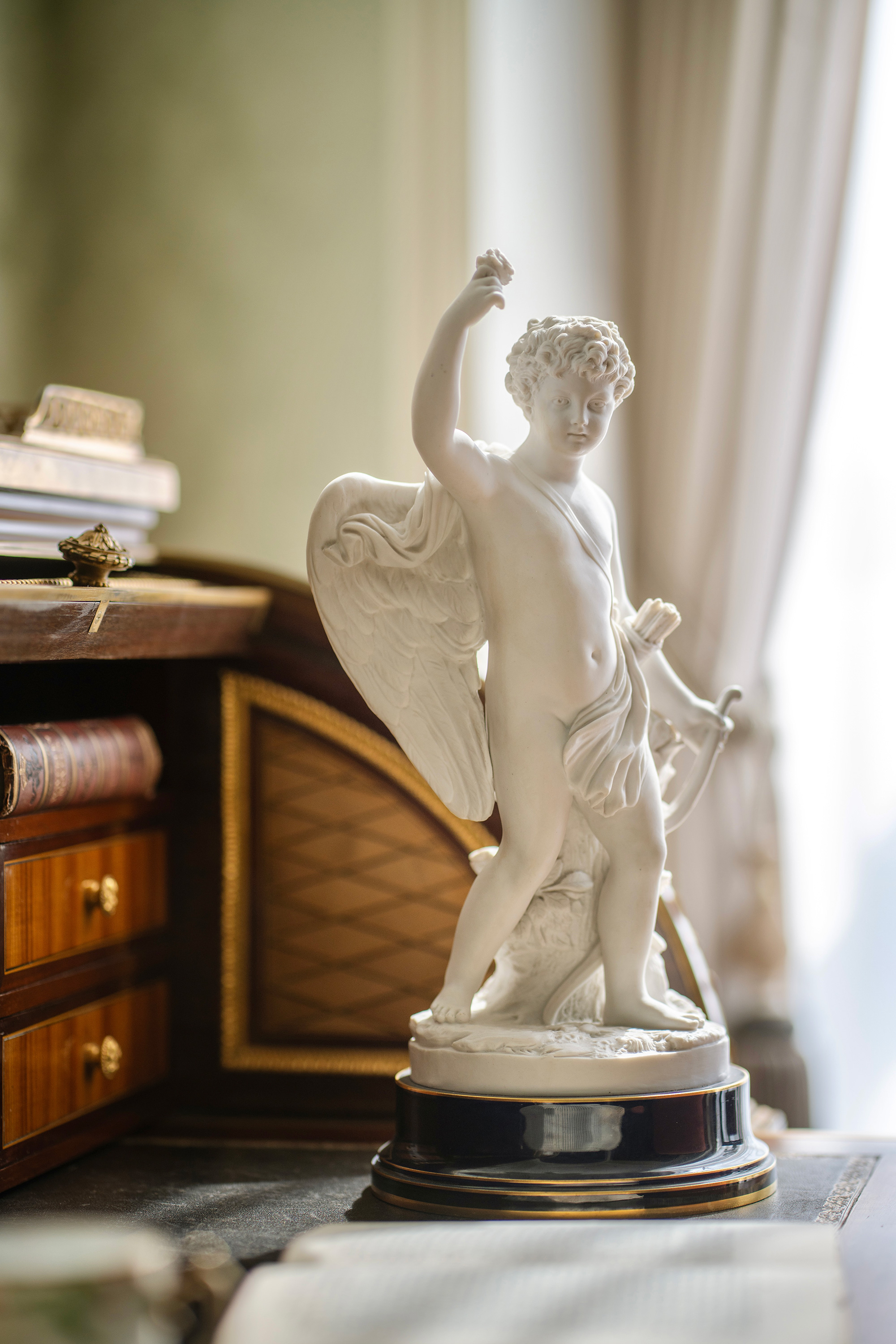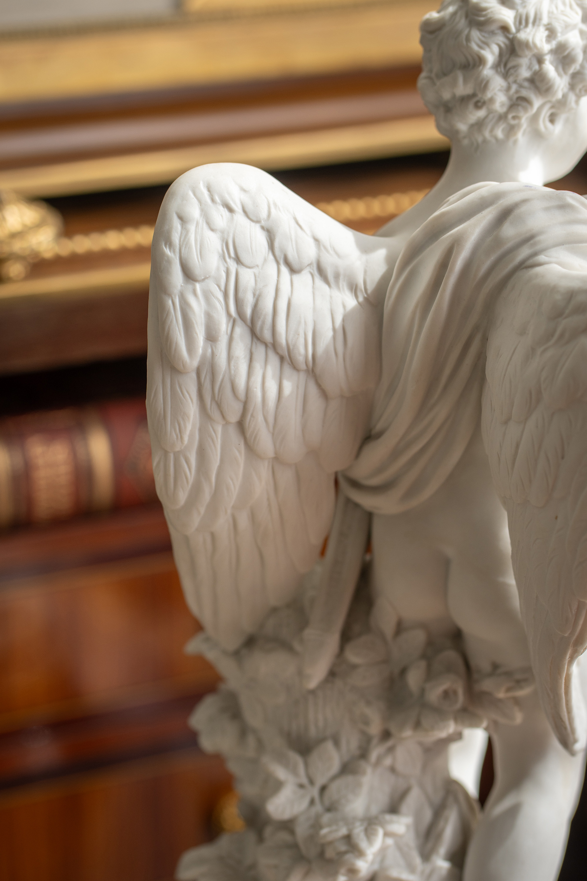 独角鹿西洋古董1895-1911年代法国御窑塞弗尔签名出品蓝釉描金底座装饰持花小天使主题素胎瓷雕塑